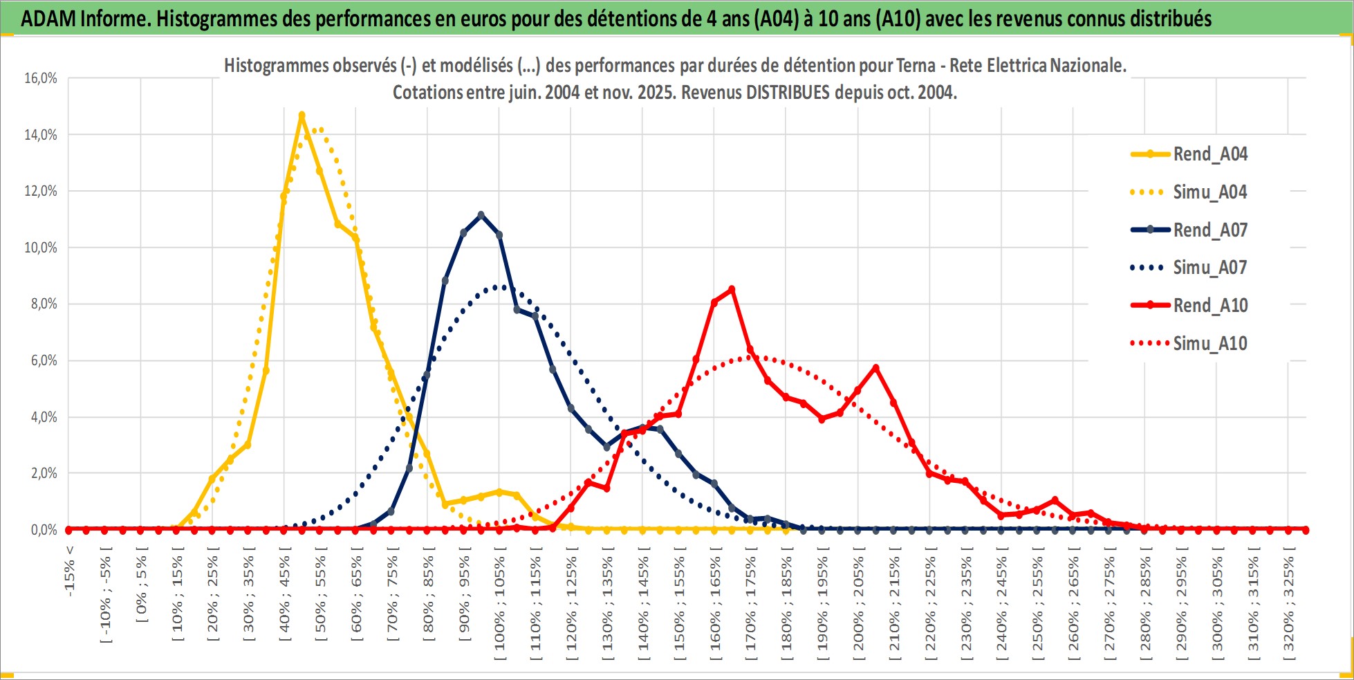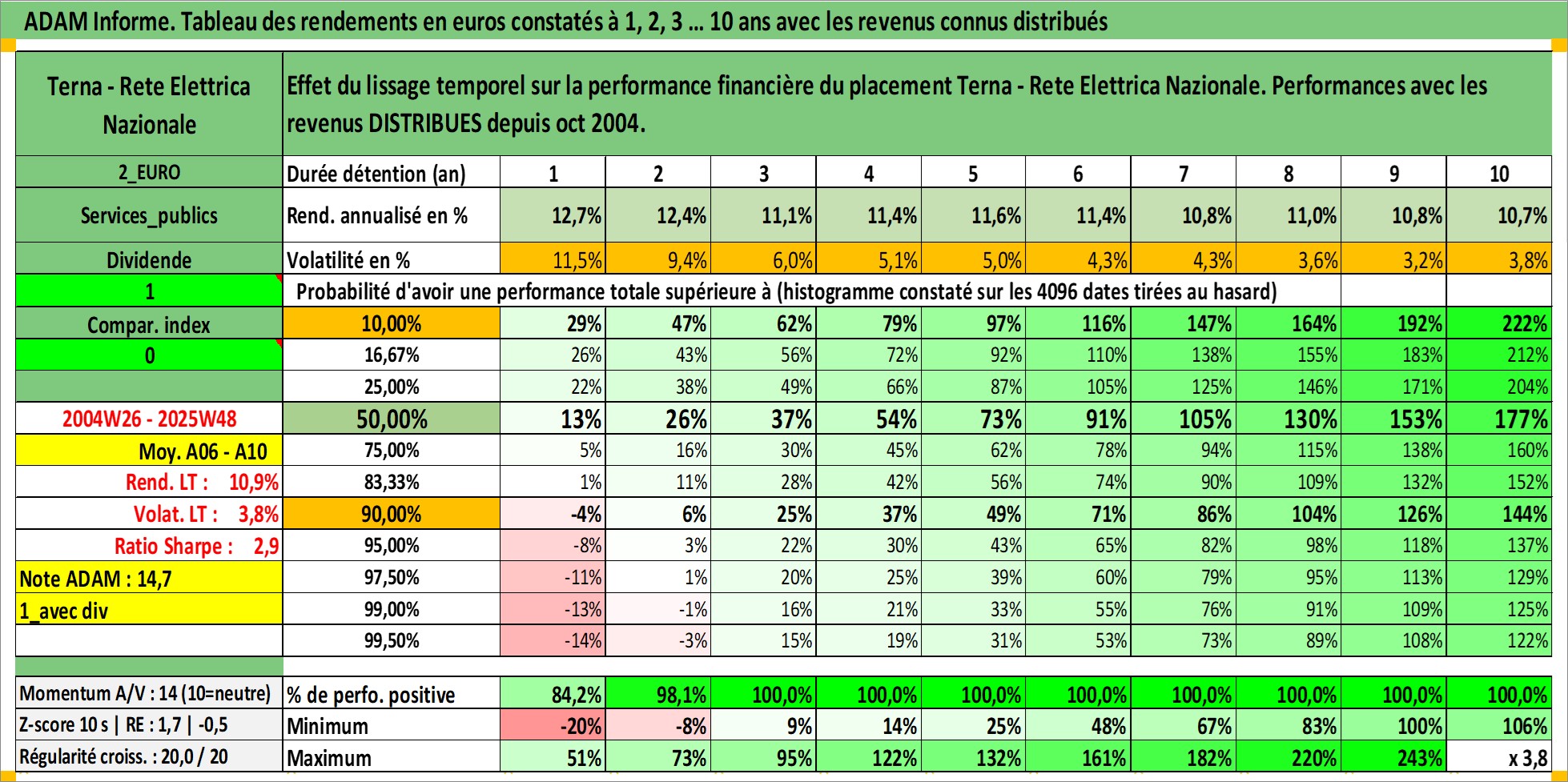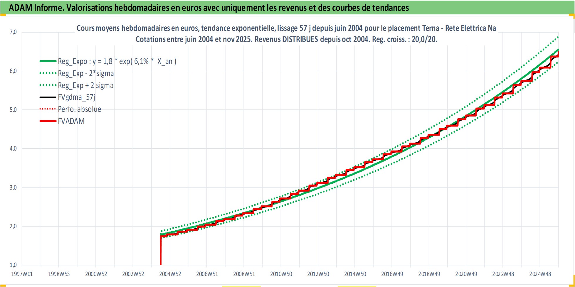 Site dédié aux investisseursPage dédiée sur site financeAnalyse des valorisations hebdomadaires de l'action Terna - Rete Elettrica Nazionale. Cet actif est cote en EUR. Les valorisations couvrent les semaines 2004W26 a 2025W48. Les revenus de cet actif financier sont pris en compte depuis la semaine 2004W43. La note globale ESG de cet actif est estimee a 18.0 (apres rebasage entre 0 et 20).