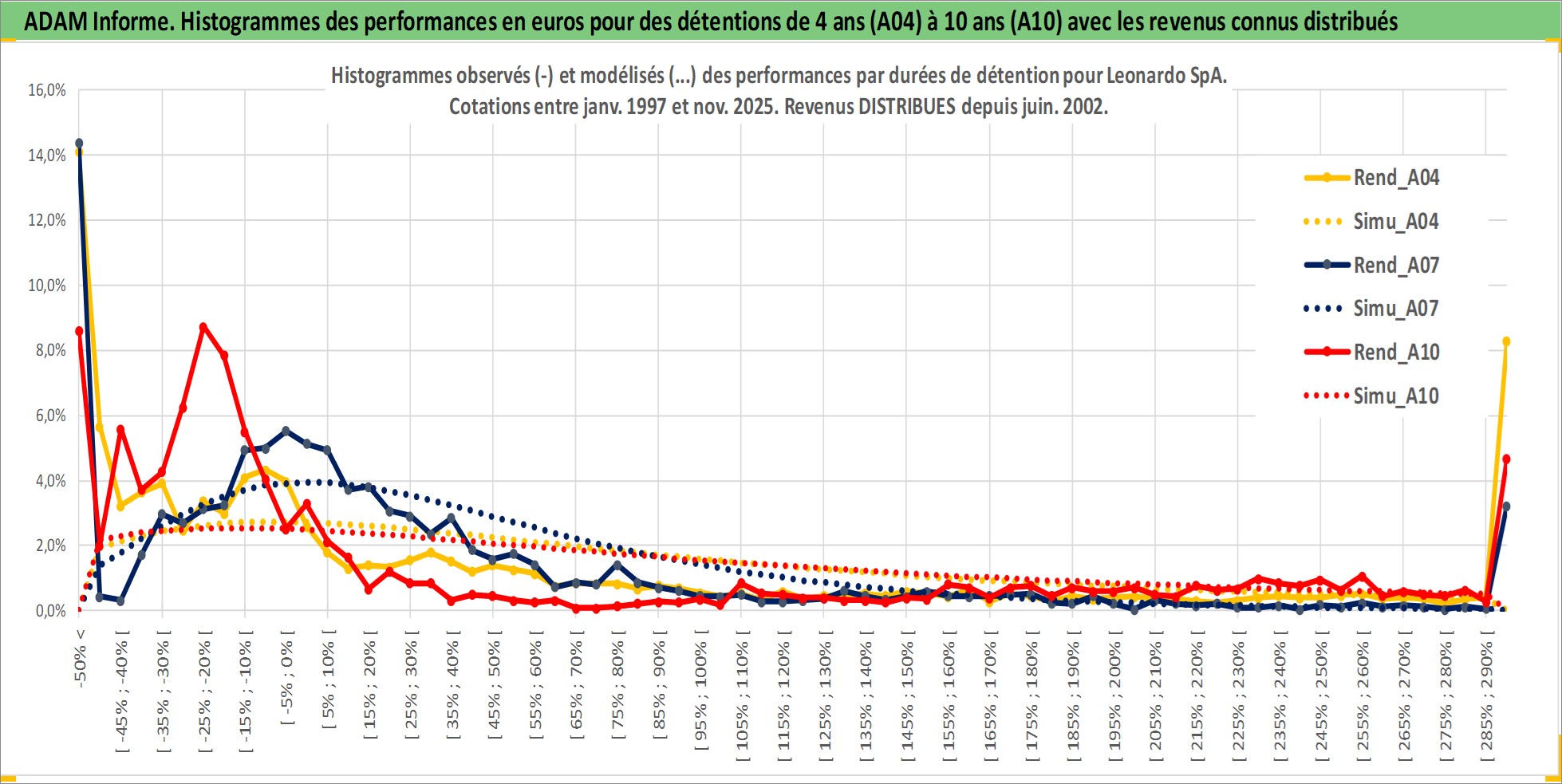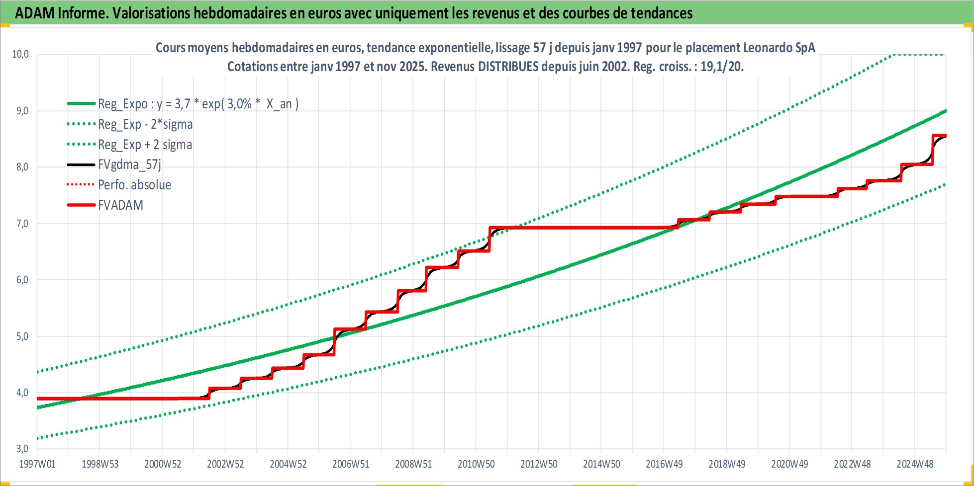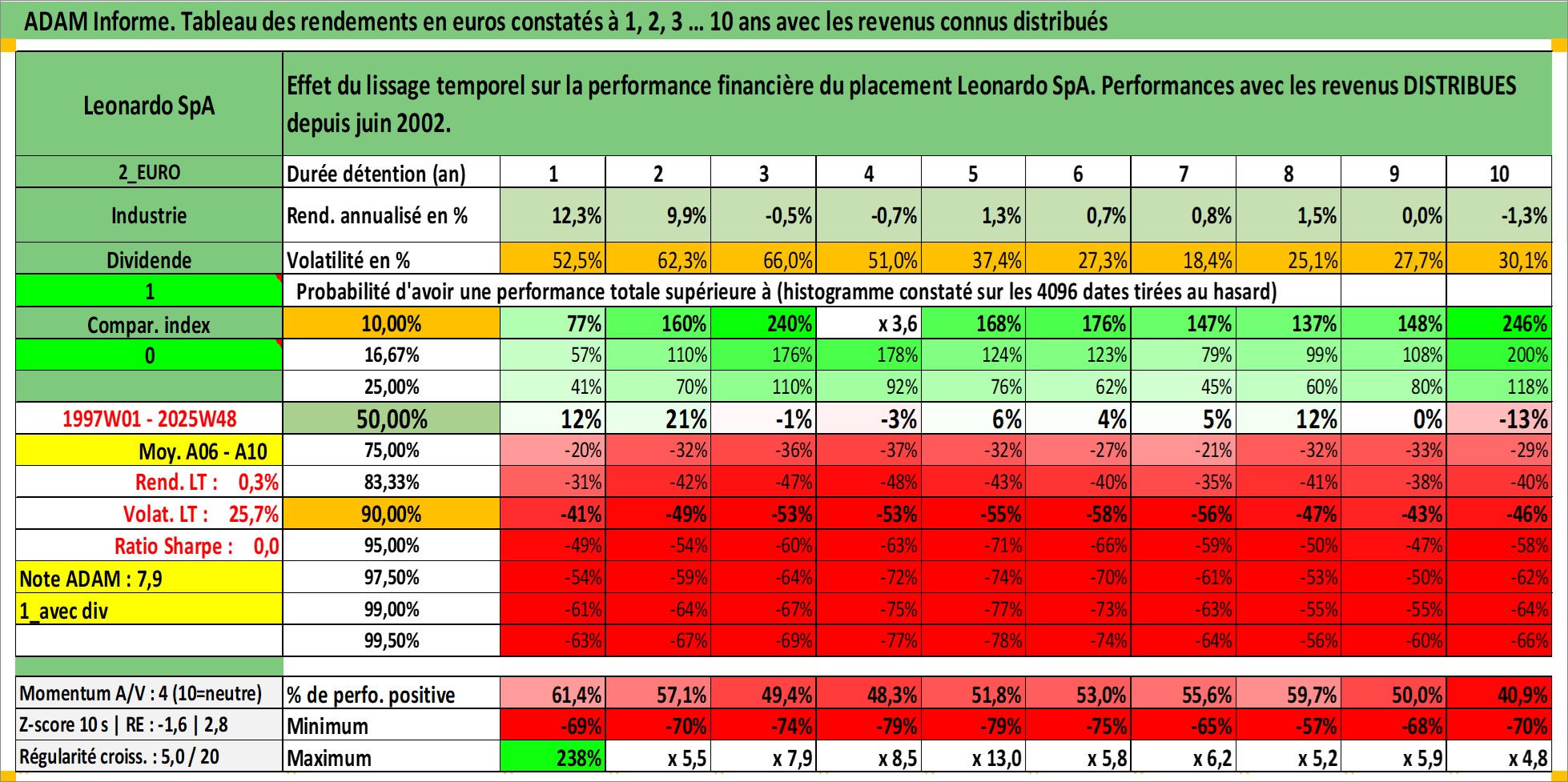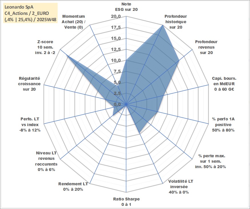 Site dédié aux investisseursPage dédiée sur site financeAnalyse des valorisations hebdomadaires de l'action Leonardo SpA. Cet actif est cote en EUR. Les valorisations couvrent les semaines 1997W01 a 2025W48. Les revenus de cet actif financier sont pris en compte depuis la semaine 2002W26. La note globale ESG de cet actif est estimee a 10.0 (apres rebasage entre 0 et 20).