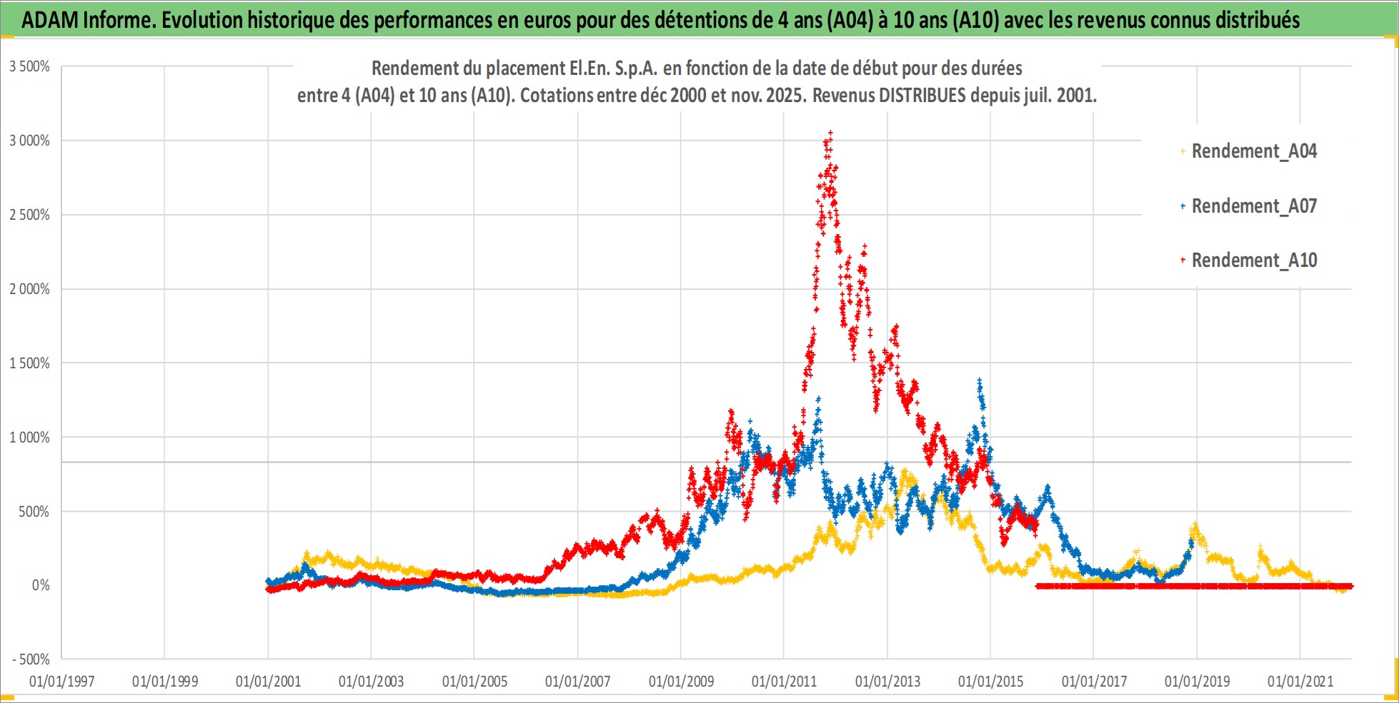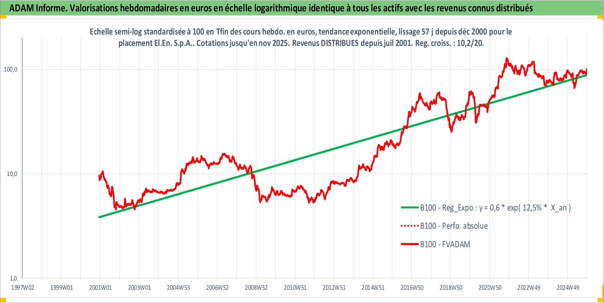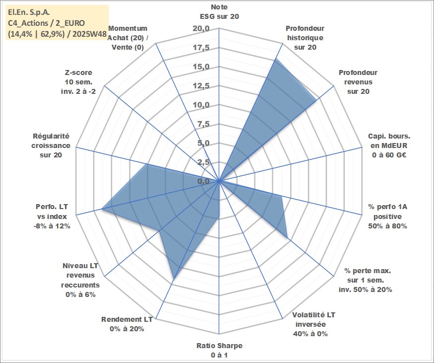 Site dédié aux investisseursPage dédiée sur site financeAnalyse des valorisations hebdomadaires de l'action El.En. S.p.A.. Cet actif est cote en EUR. Les valorisations couvrent les semaines 2000W50 a 2025W48. Les revenus de cet actif financier sont pris en compte depuis la semaine 2001W30. La note ESG de cet actif n'est pas connue.
