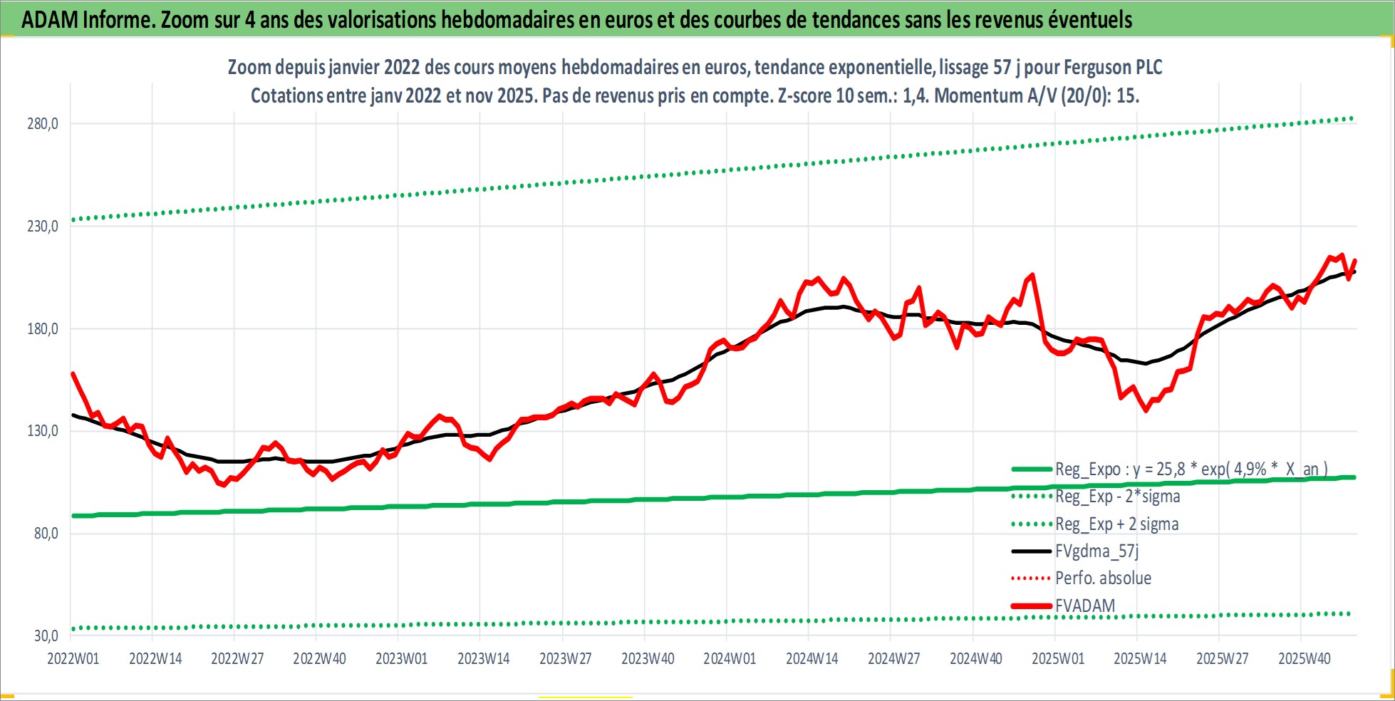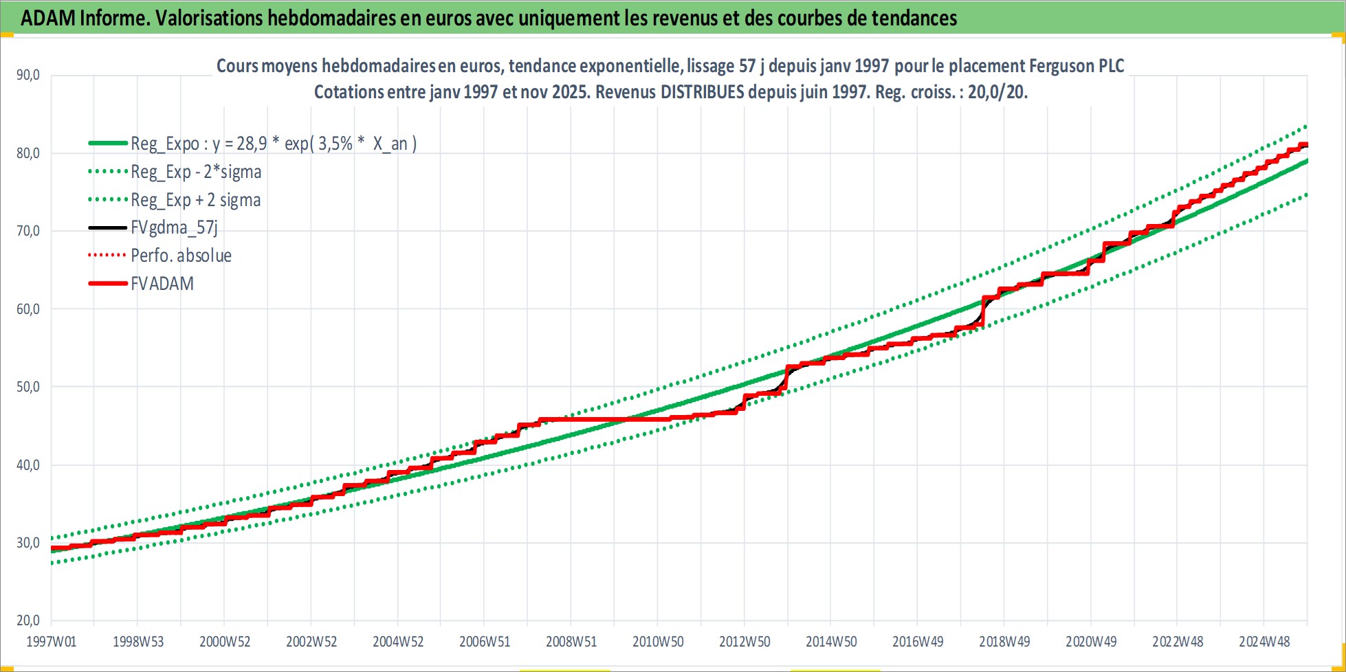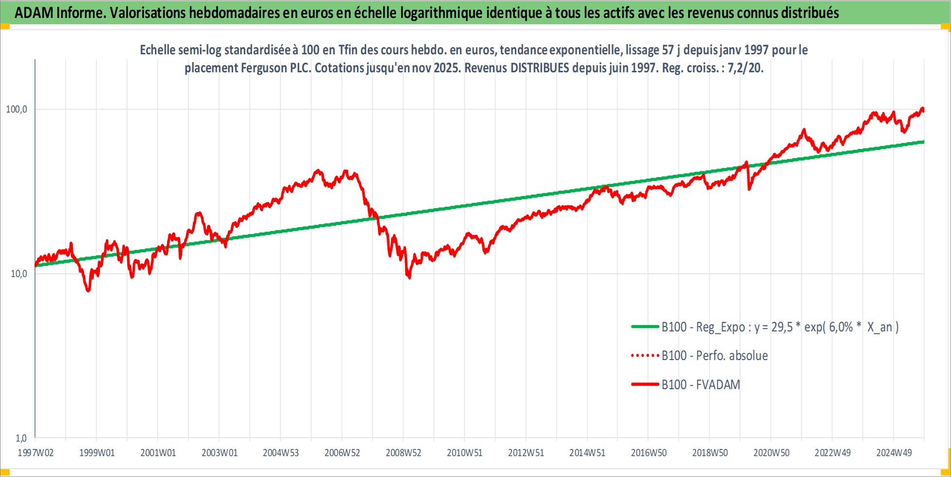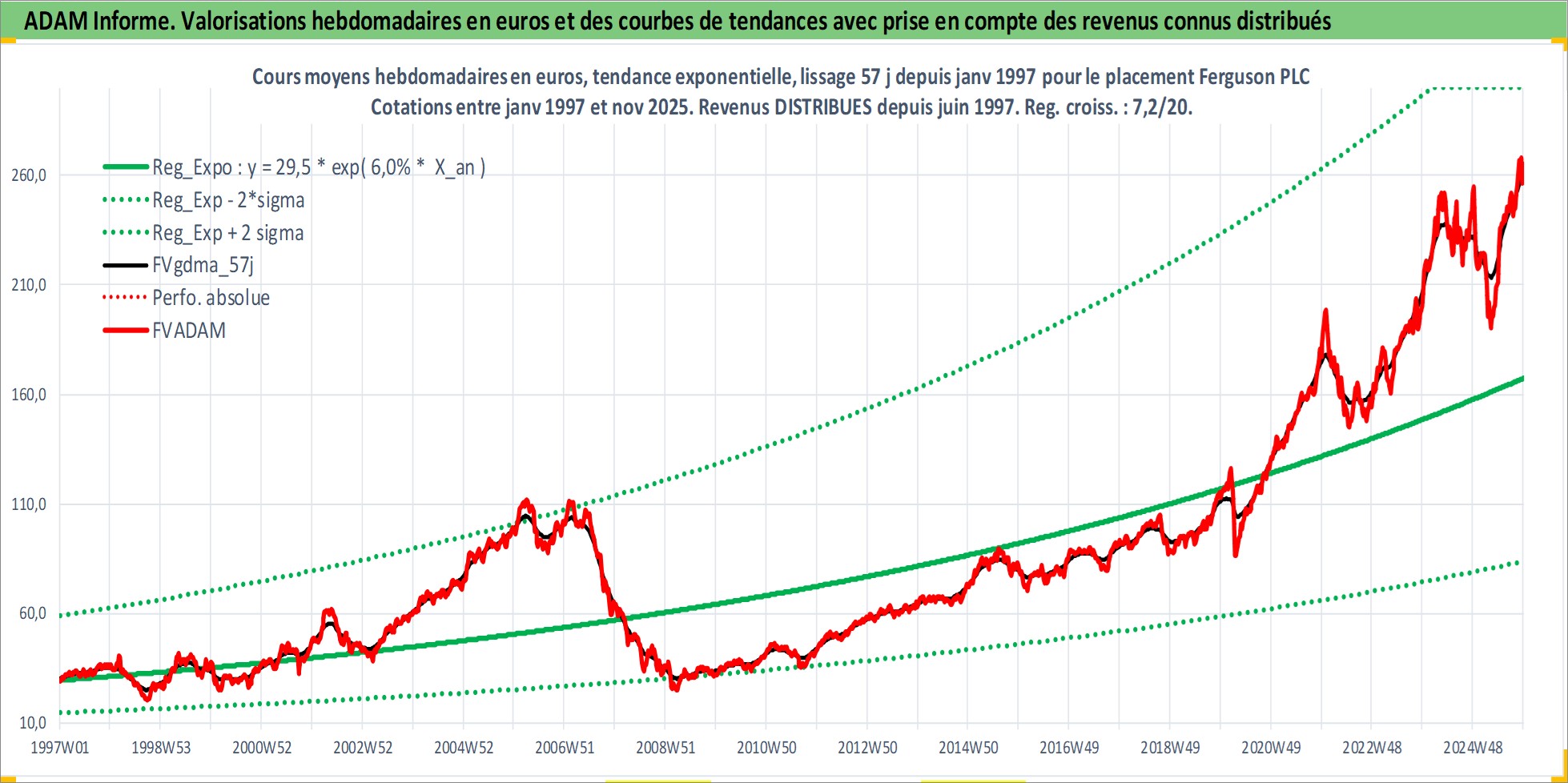 Site dédié aux investisseursPage dédiée sur site financeAnalyse des valorisations hebdomadaires de l'action Ferguson PLC. Cet actif est cote en GBX. Les valorisations sont en contrevaleur EURO et couvrent les semaines 1997W01 a 2025W48. Les revenus de cet actif financier sont pris en compte depuis la semaine 1997W24. La note ESG de cet actif n'est pas connue.