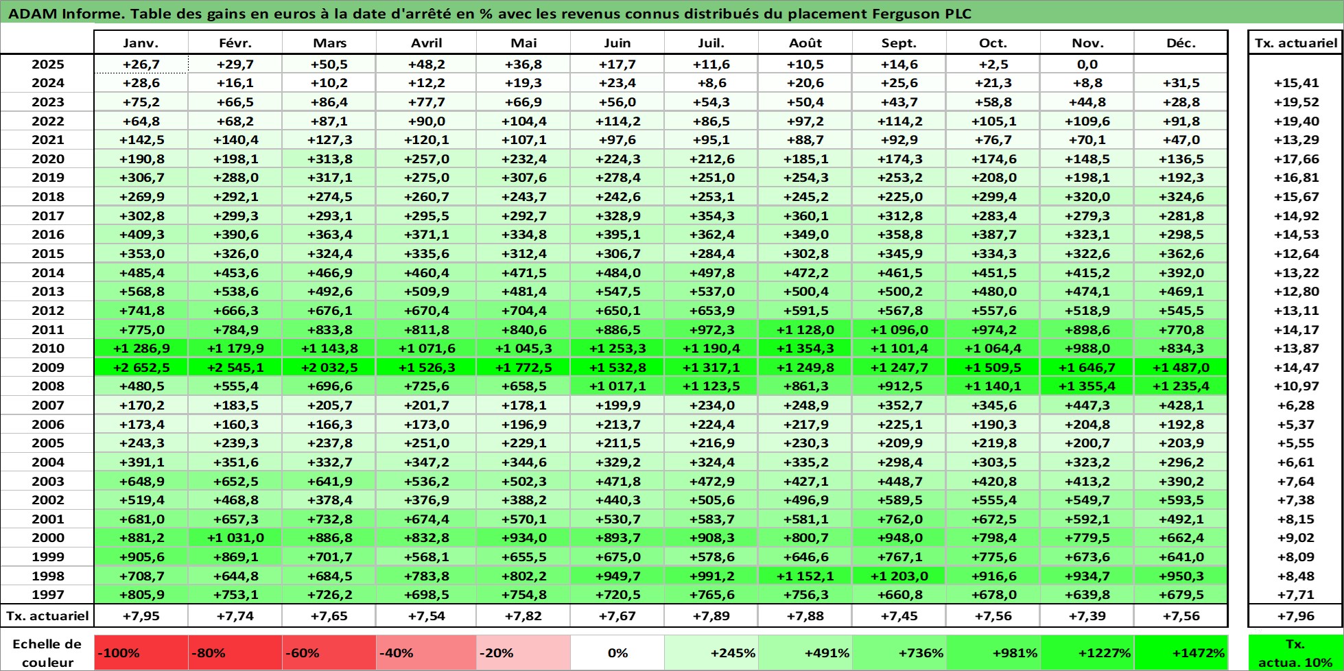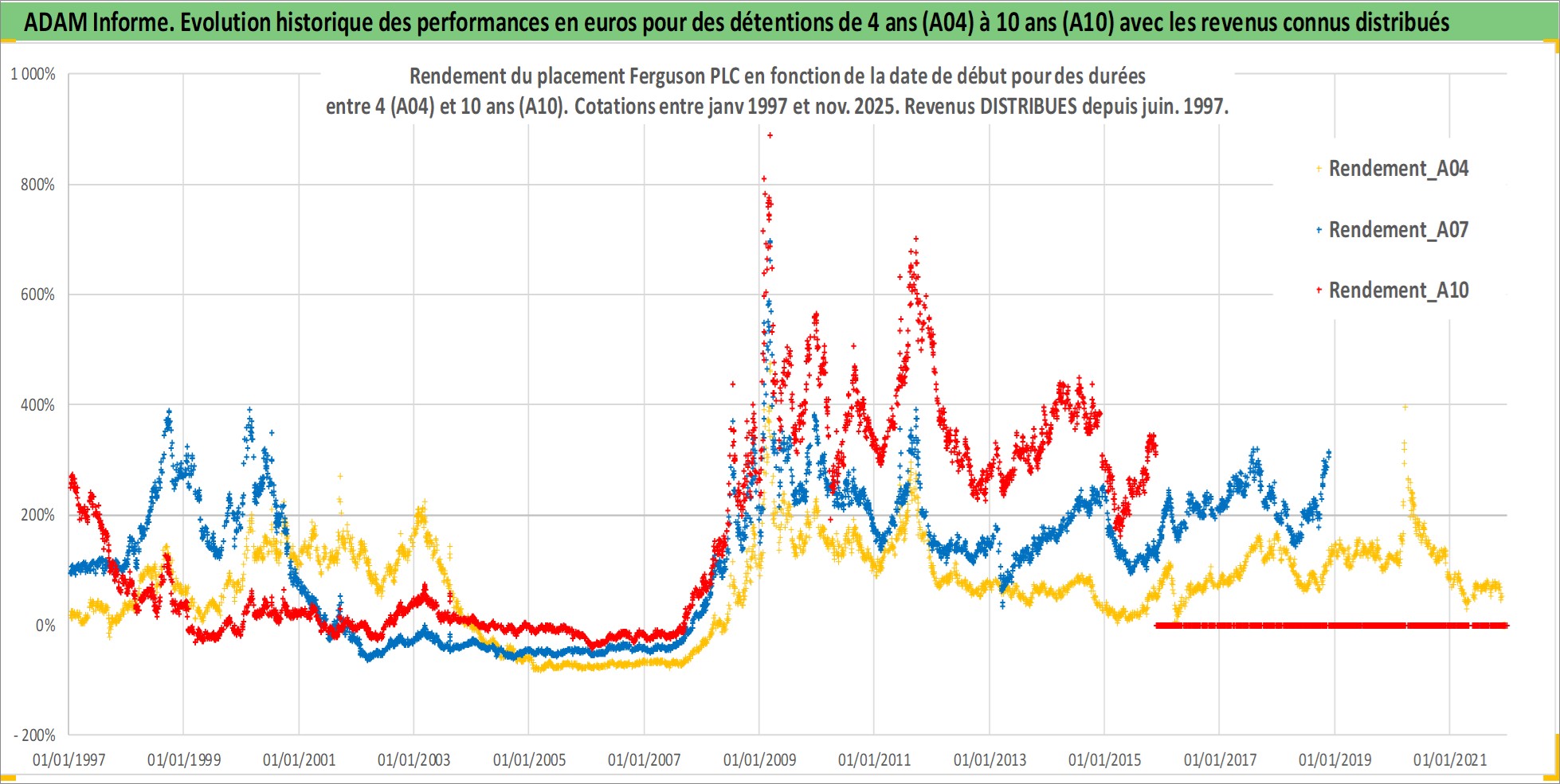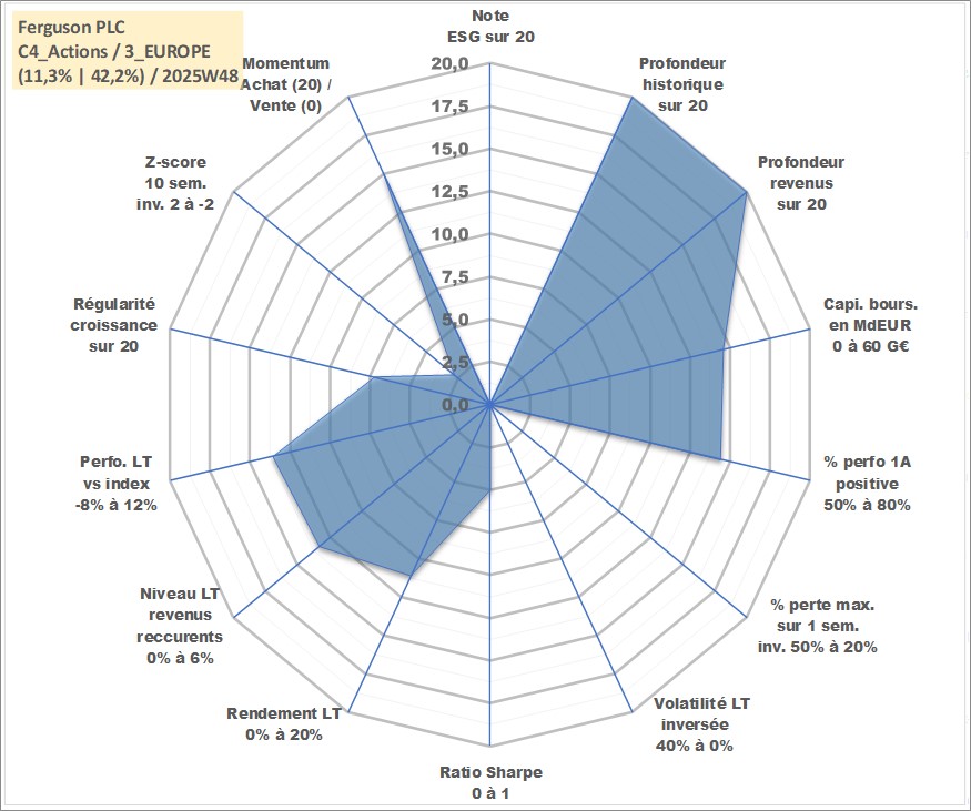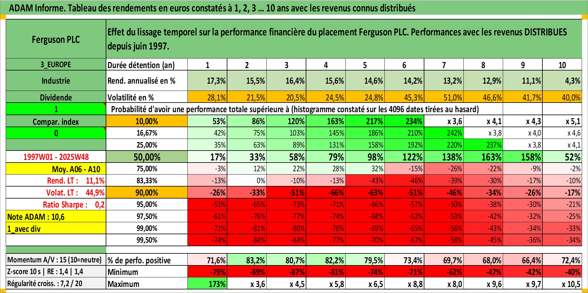 Site dédié aux investisseursPage dédiée sur site financeAnalyse des valorisations hebdomadaires de l'action Ferguson PLC. Cet actif est cote en GBX. Les valorisations sont en contrevaleur EURO et couvrent les semaines 1997W01 a 2025W48. Les revenus de cet actif financier sont pris en compte depuis la semaine 1997W24. La note ESG de cet actif n'est pas connue.