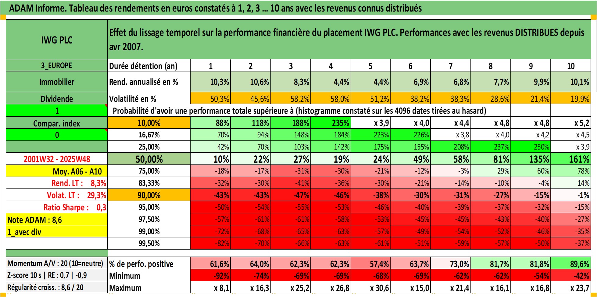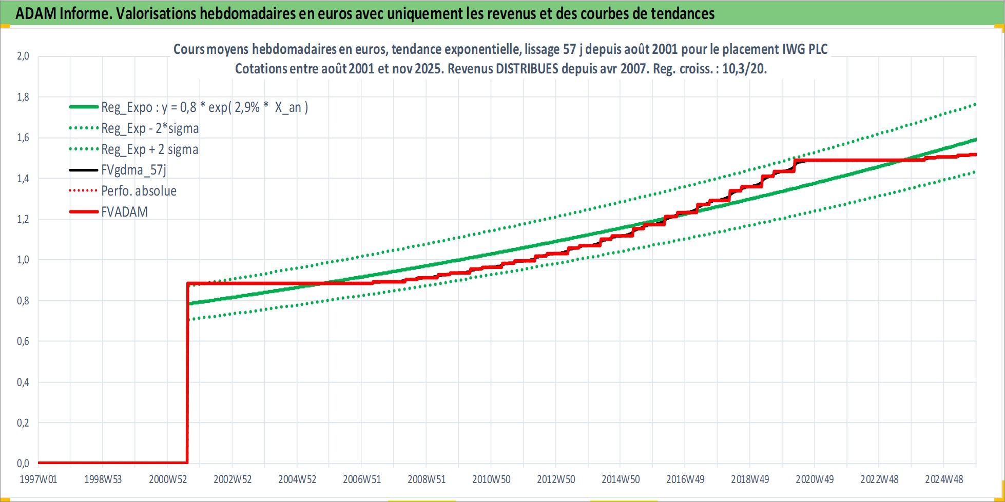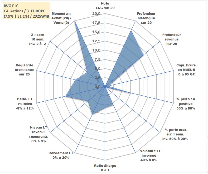 Site dédié aux investisseursPage dédiée sur site financeAnalyse des valorisations hebdomadaires de l'action IWG PLC. Cet actif est cote en GBX. Les valorisations sont en contrevaleur EURO et couvrent les semaines 2001W32 a 2025W48. Les revenus de cet actif financier sont pris en compte depuis la semaine 2007W17. La note ESG de cet actif n'est pas connue.