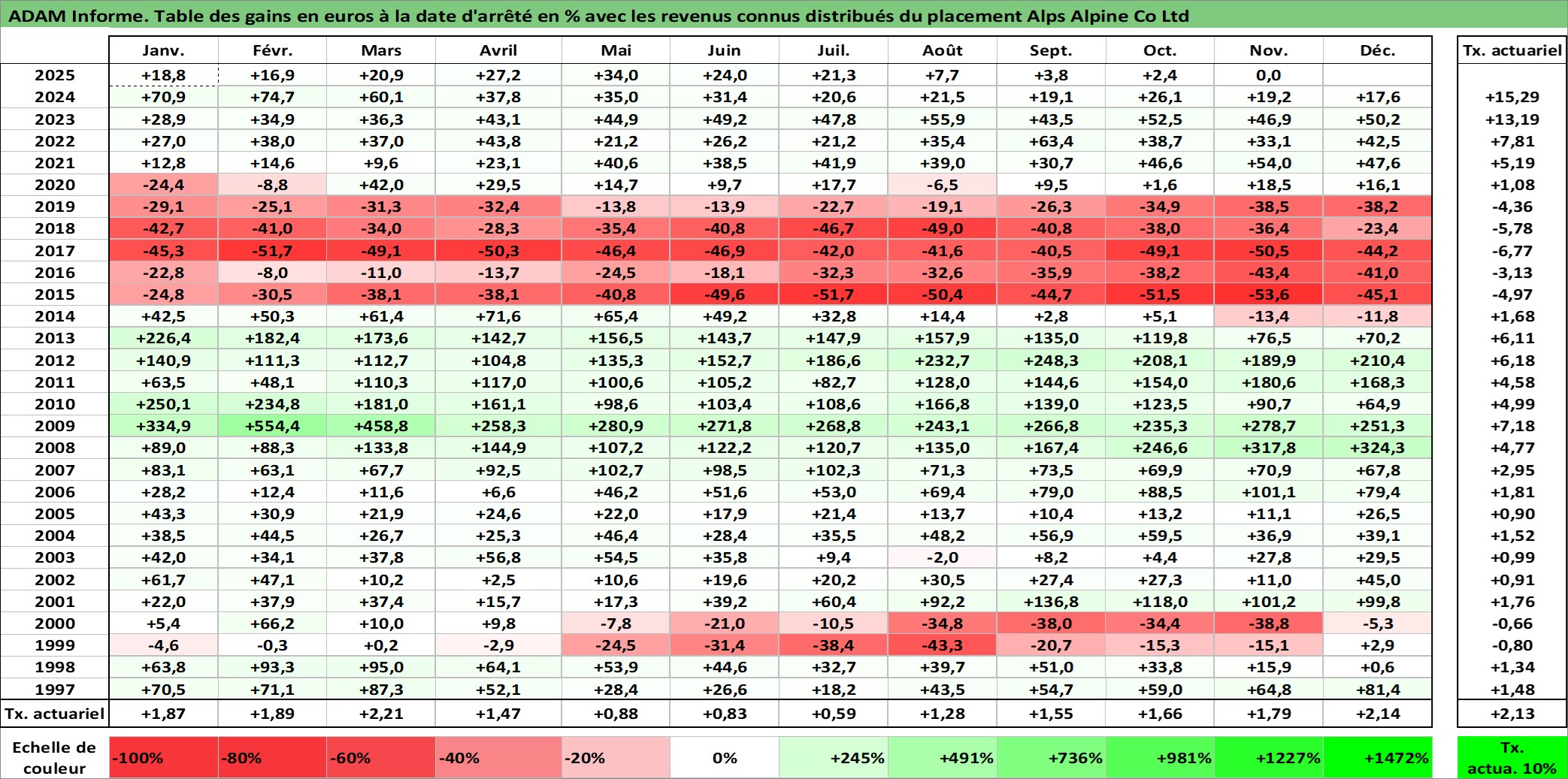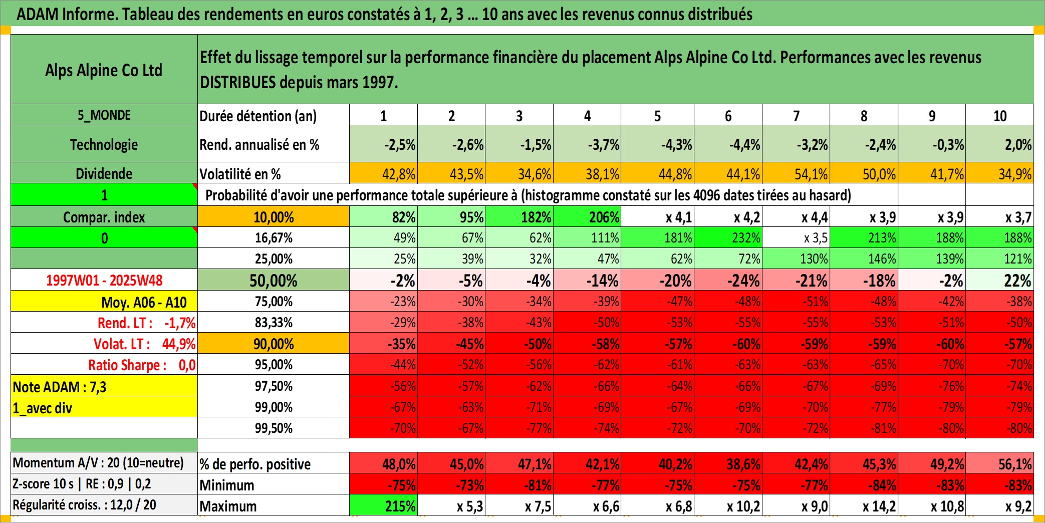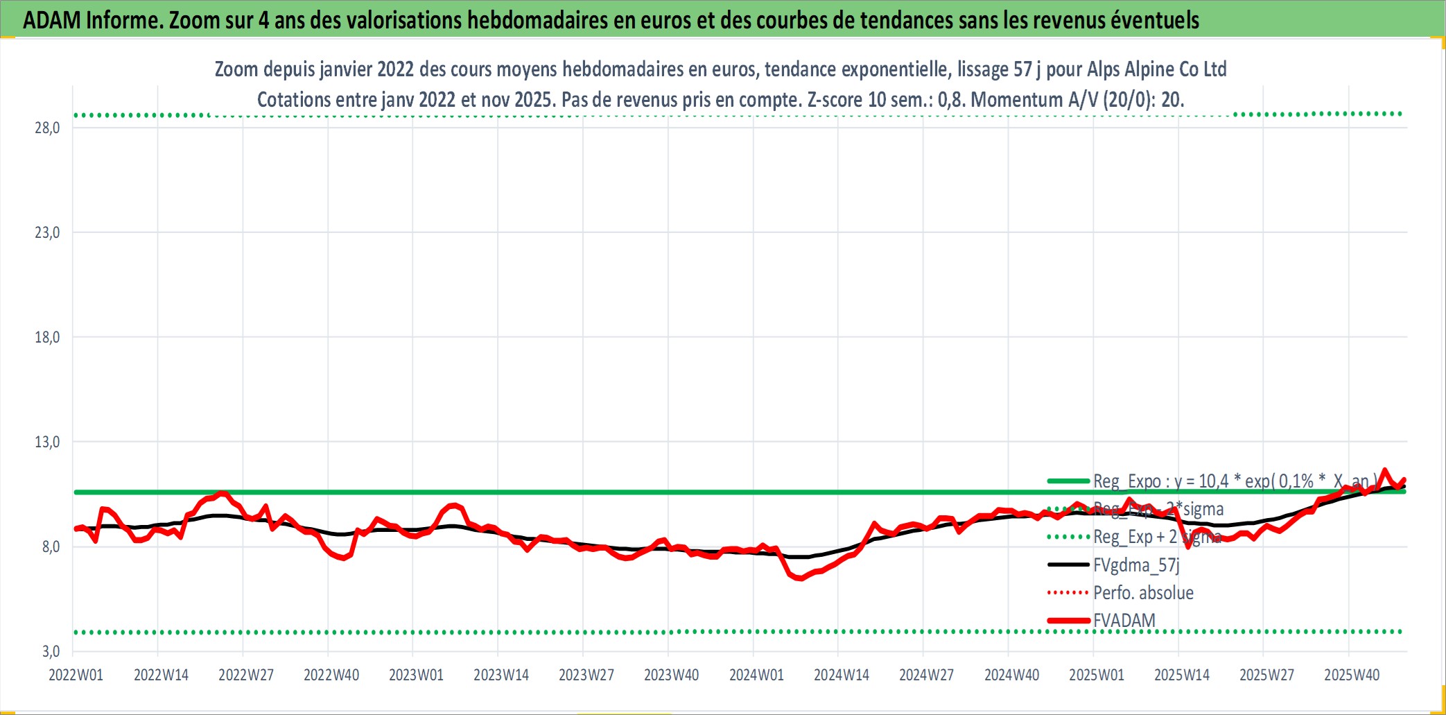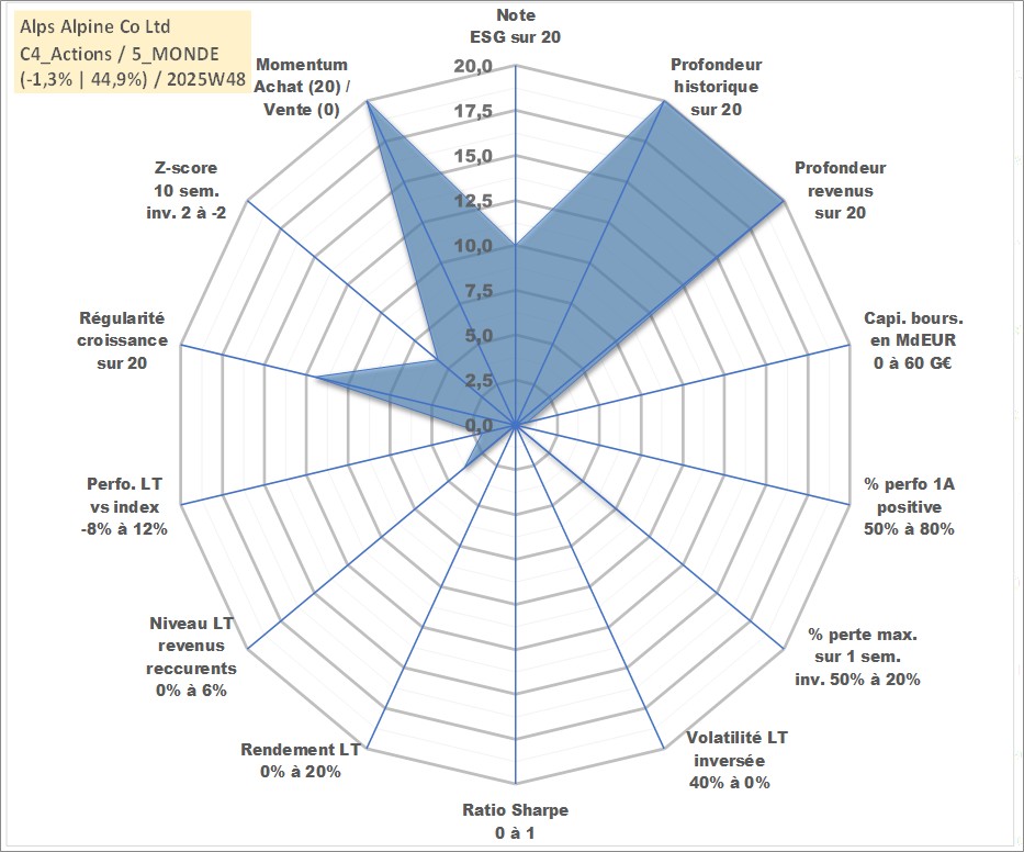 Site dédié aux investisseursPage dédiée sur site financeAnalyse des valorisations hebdomadaires de l'action Alps Alpine Co Ltd. Cet actif est cote en JPY. Les valorisations sont en contrevaleur EURO et couvrent les semaines 1997W01 a 2025W48. Les revenus de cet actif financier sont pris en compte depuis la semaine 1997W13. La note globale ESG de cet actif est estimee a 10.0 (apres rebasage entre 0 et 20).