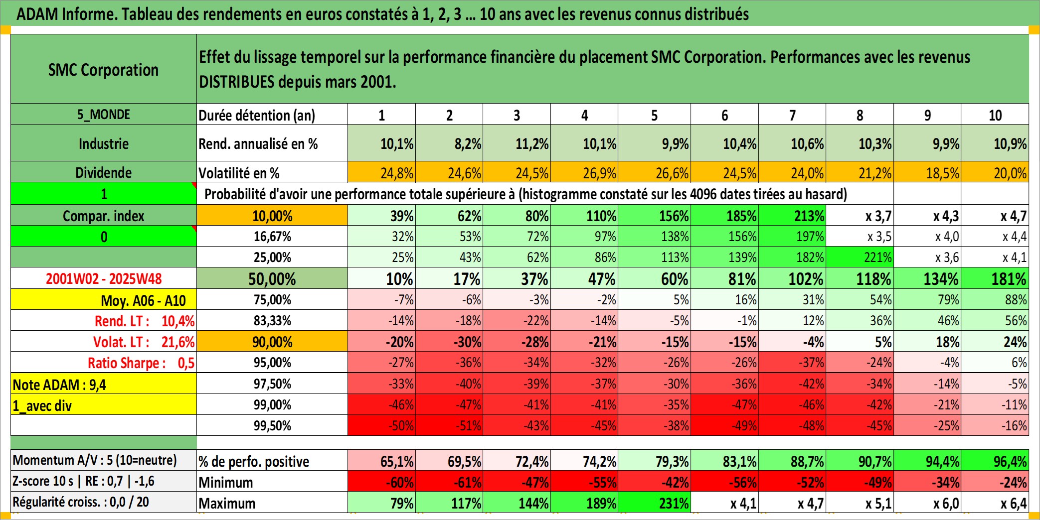 Site dédié aux investisseursPage dédiée sur site financeAnalyse des valorisations hebdomadaires de l'action SMC Corporation. Cet actif est cote en JPY. Les valorisations sont en contrevaleur EURO et couvrent les semaines 2001W02 a 2025W48. Les revenus de cet actif financier sont pris en compte depuis la semaine 2001W13. La note globale ESG de cet actif est estimee a 5.0 (apres rebasage entre 0 et 20).