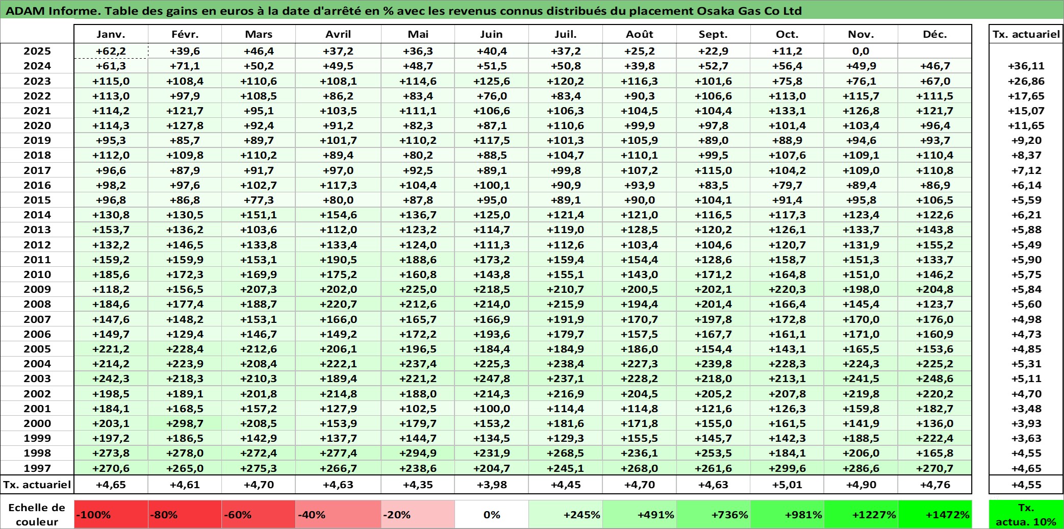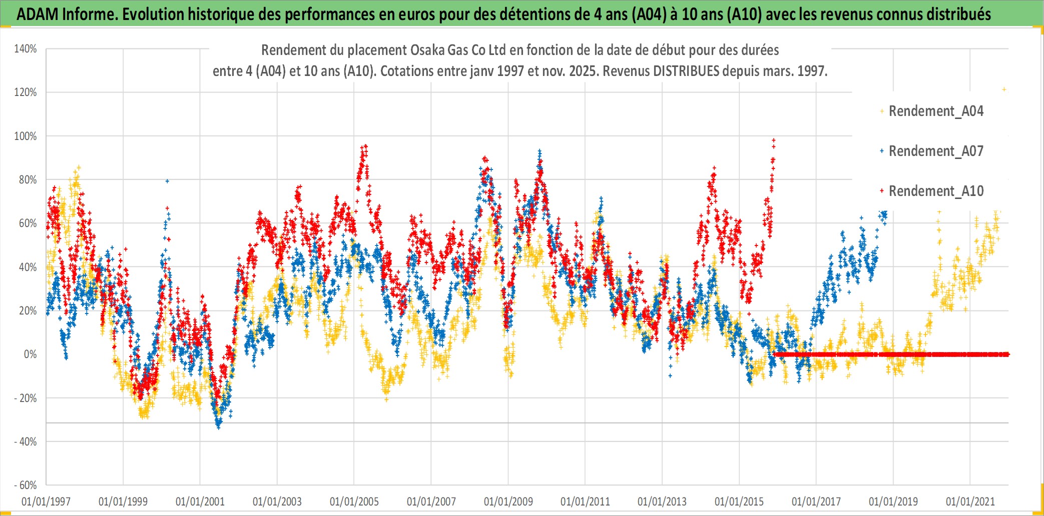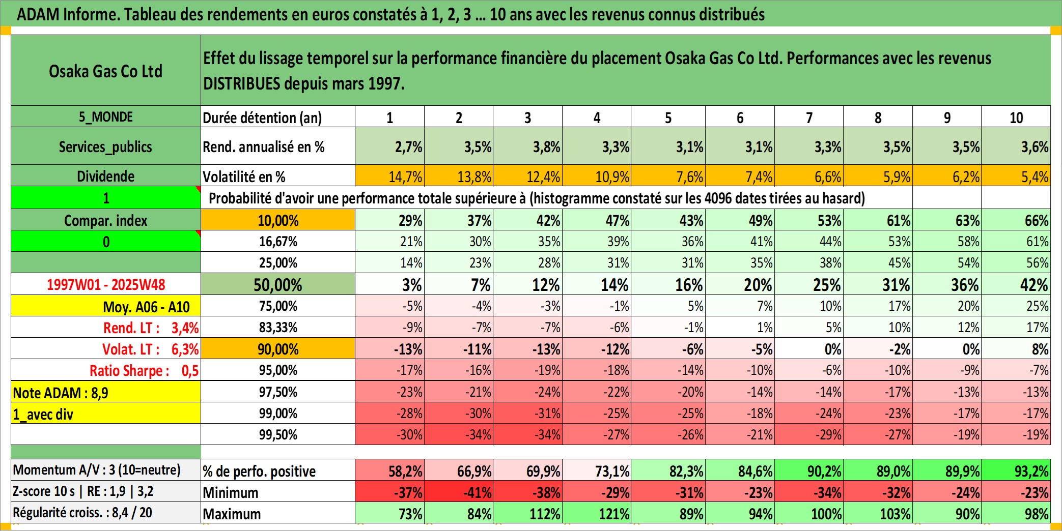 Site dédié aux investisseursPage dédiée sur site financeAnalyse des valorisations hebdomadaires de l'action Osaka Gas Co Ltd. Cet actif est cote en JPY. Les valorisations sont en contrevaleur EURO et couvrent les semaines 1997W01 a 2025W48. Les revenus de cet actif financier sont pris en compte depuis la semaine 1997W13. La note globale ESG de cet actif est estimee a 2.0 (apres rebasage entre 0 et 20).