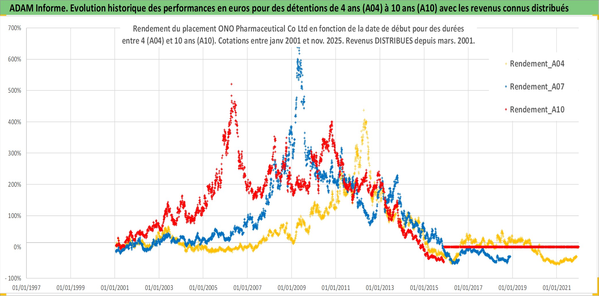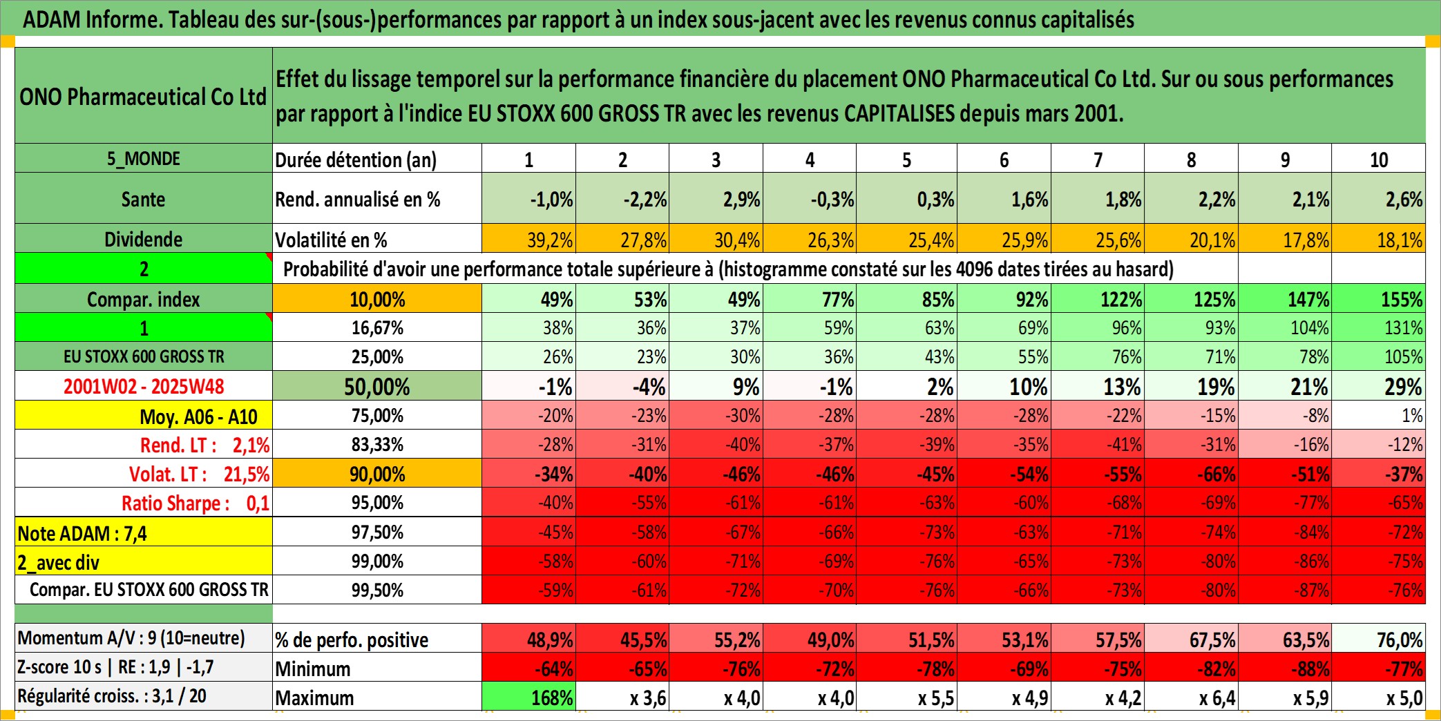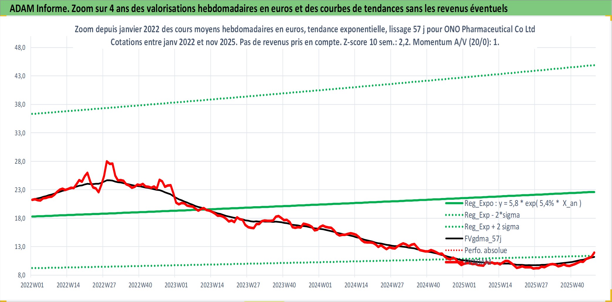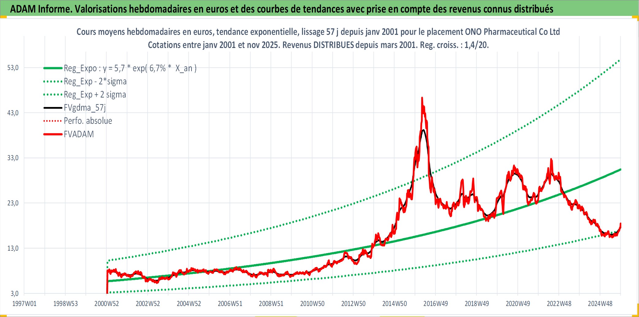 Site dédié aux investisseursPage dédiée sur site financeAnalyse des valorisations hebdomadaires de l'action ONO Pharmaceutical Co Ltd. Cet actif est cote en JPY. Les valorisations sont en contrevaleur EURO et couvrent les semaines 2001W02 a 2025W48. Les revenus de cet actif financier sont pris en compte depuis la semaine 2001W13. La note globale ESG de cet actif est estimee a 7.0 (apres rebasage entre 0 et 20).