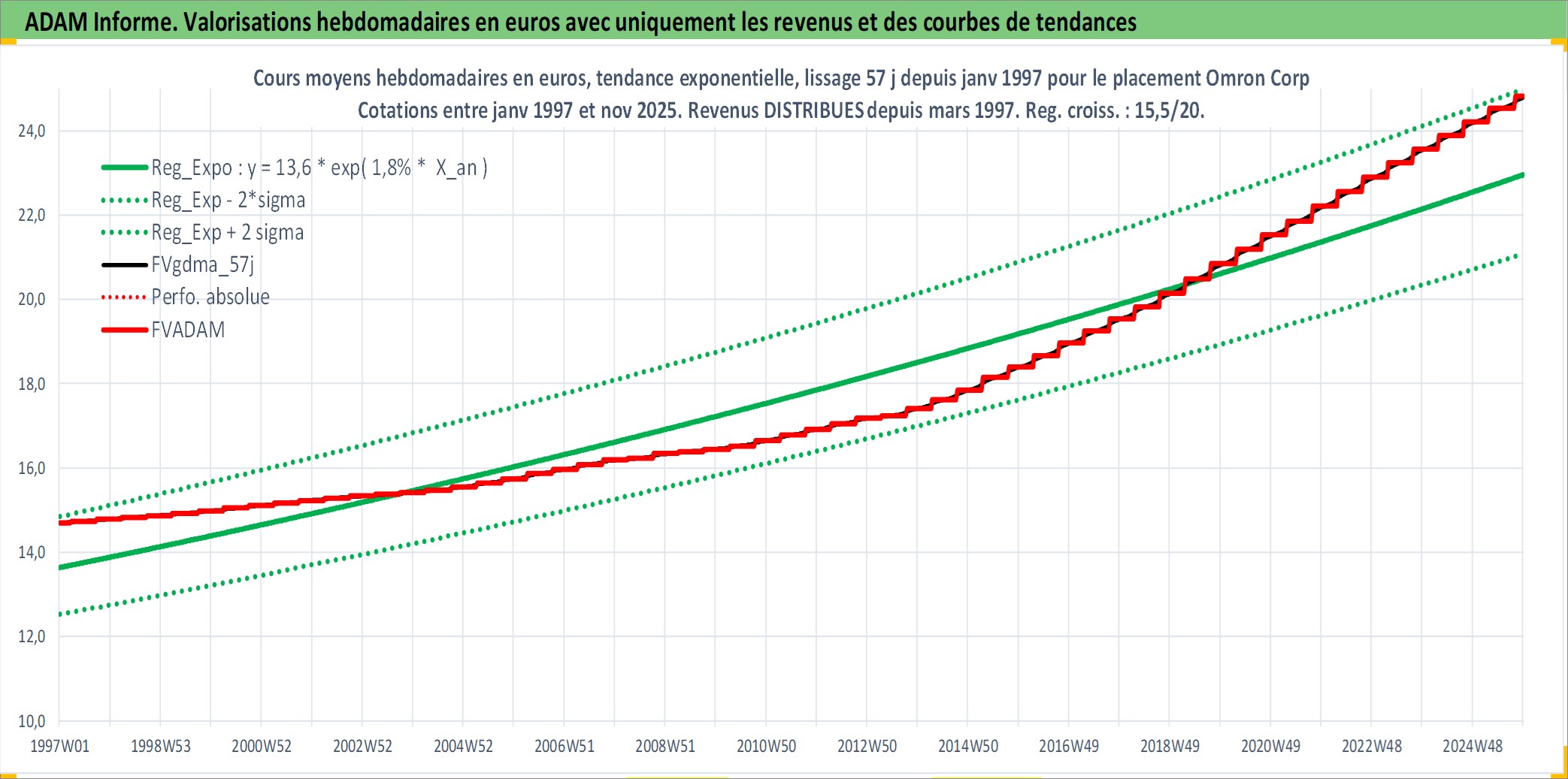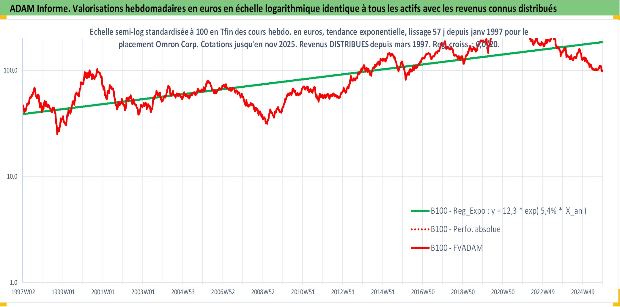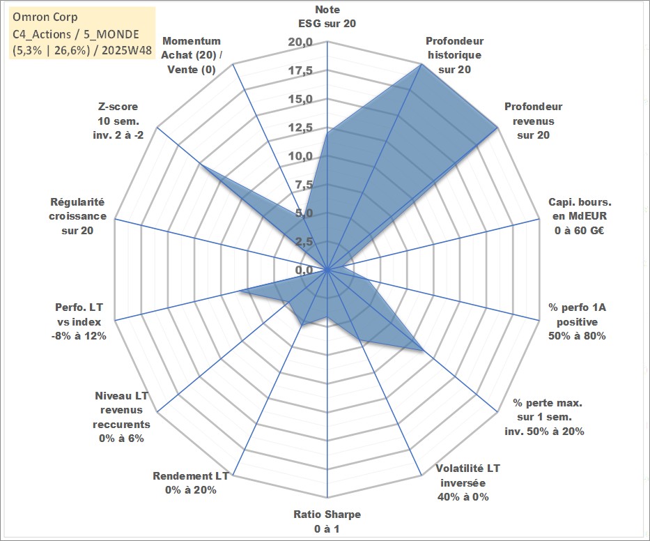 Site dédié aux investisseursPage dédiée sur site financeAnalyse des valorisations hebdomadaires de l'action Omron Corp. Cet actif est cote en JPY. Les valorisations sont en contrevaleur EURO et couvrent les semaines 1997W01 a 2025W48. Les revenus de cet actif financier sont pris en compte depuis la semaine 1997W13. La note globale ESG de cet actif est estimee a 12.0 (apres rebasage entre 0 et 20).