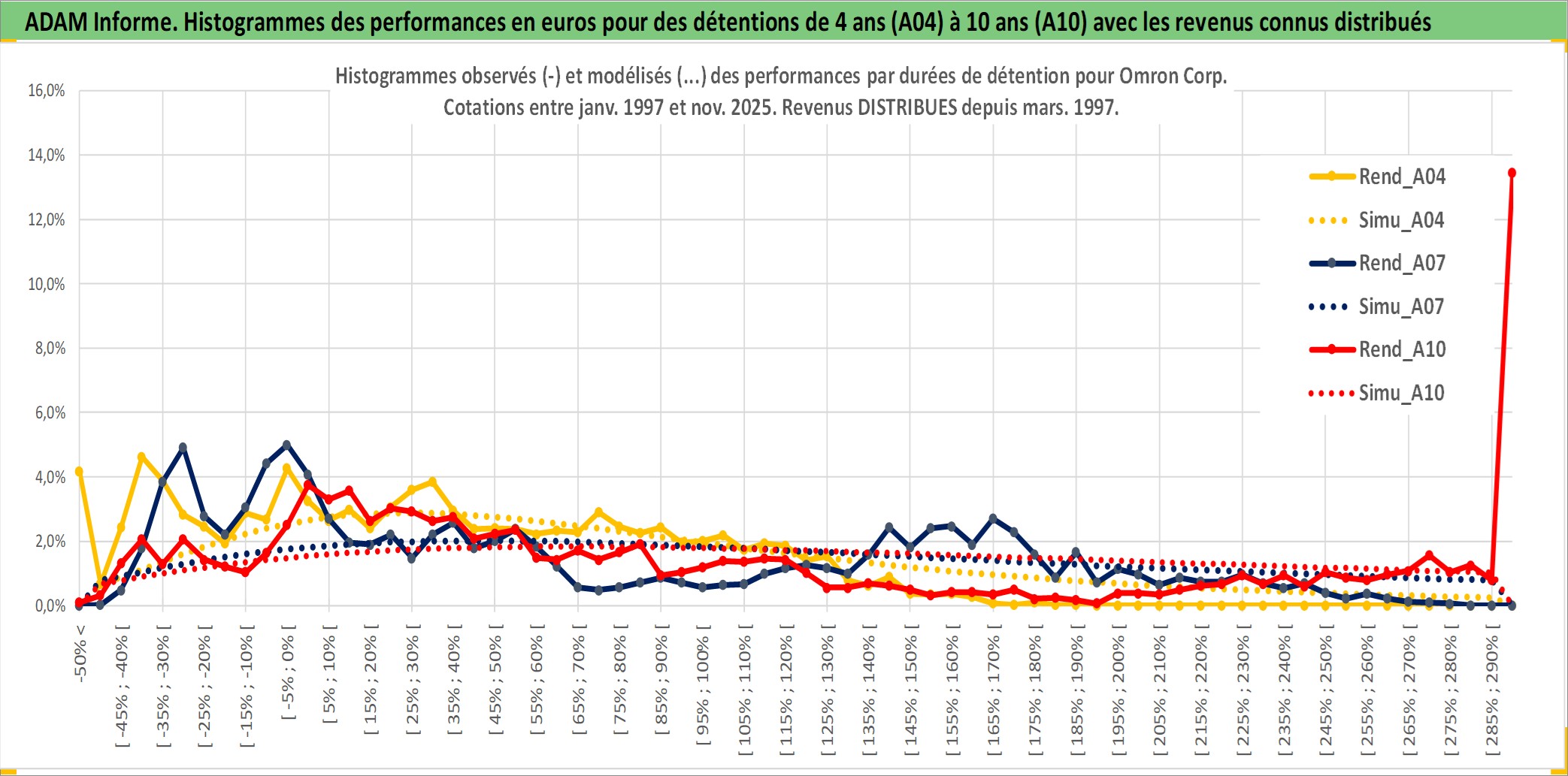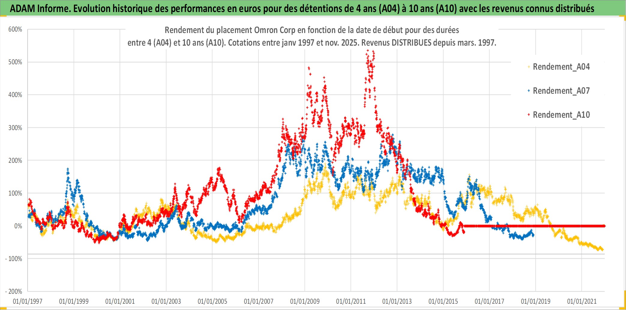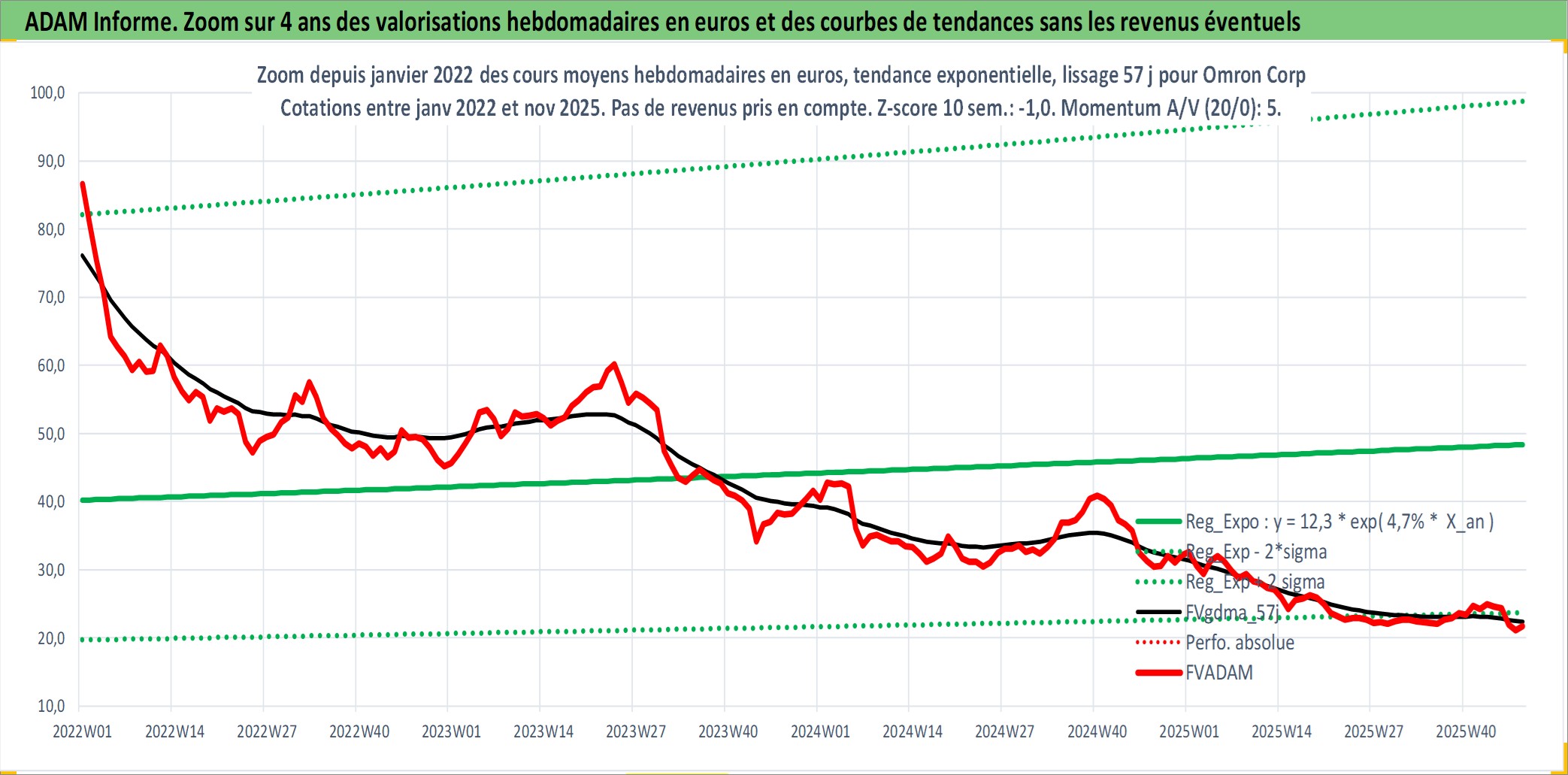 Site dédié aux investisseursPage dédiée sur site financeAnalyse des valorisations hebdomadaires de l'action Omron Corp. Cet actif est cote en JPY. Les valorisations sont en contrevaleur EURO et couvrent les semaines 1997W01 a 2025W48. Les revenus de cet actif financier sont pris en compte depuis la semaine 1997W13. La note globale ESG de cet actif est estimee a 12.0 (apres rebasage entre 0 et 20).