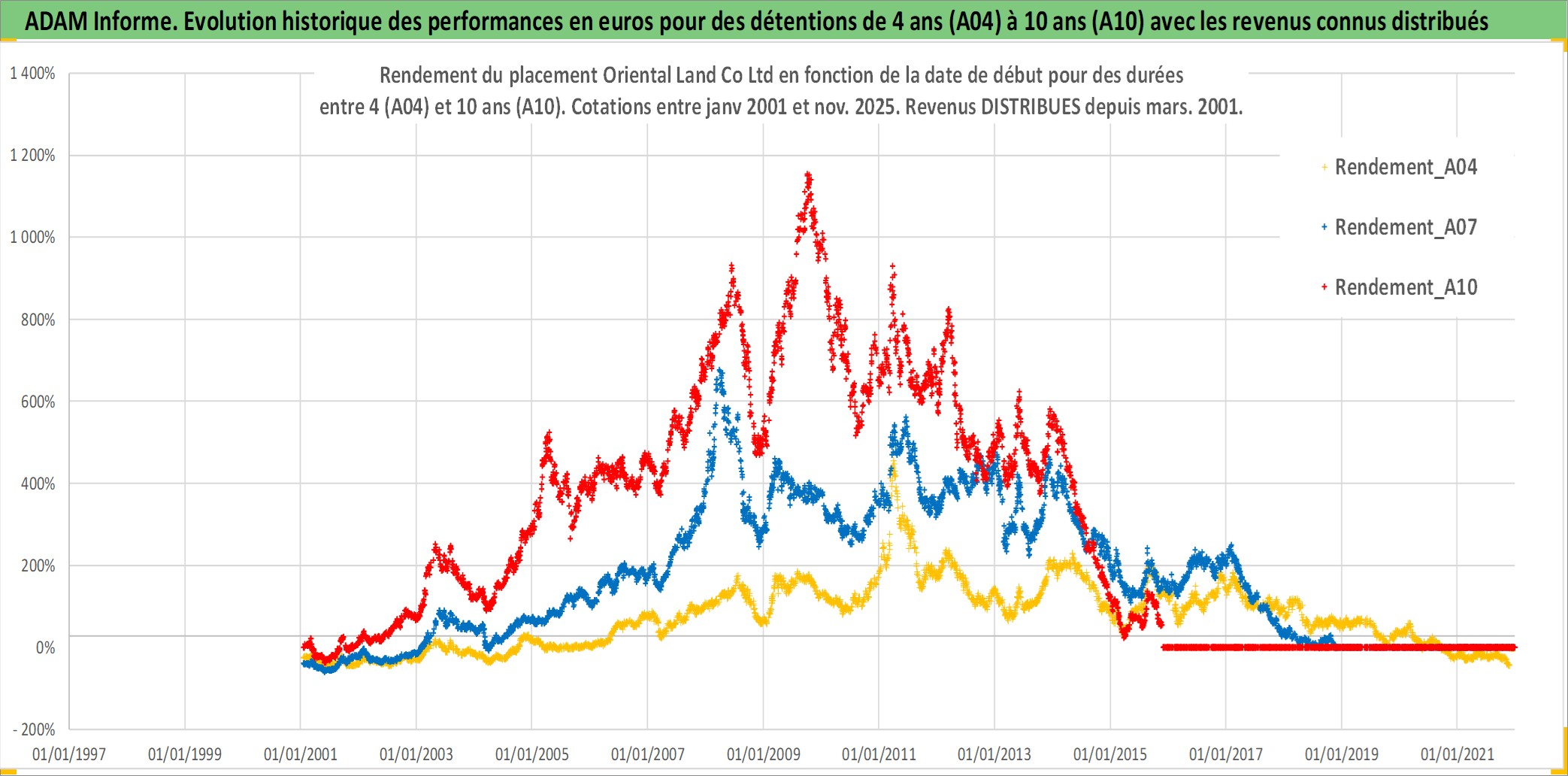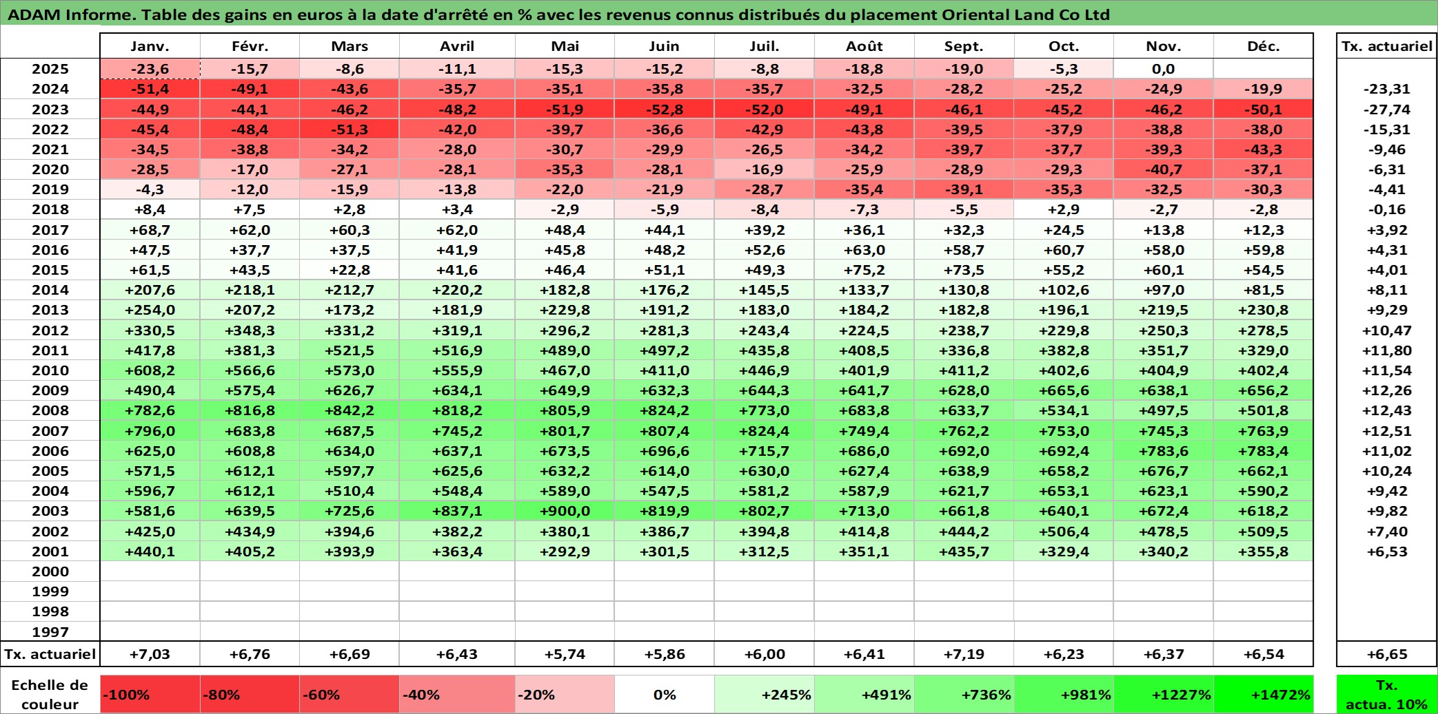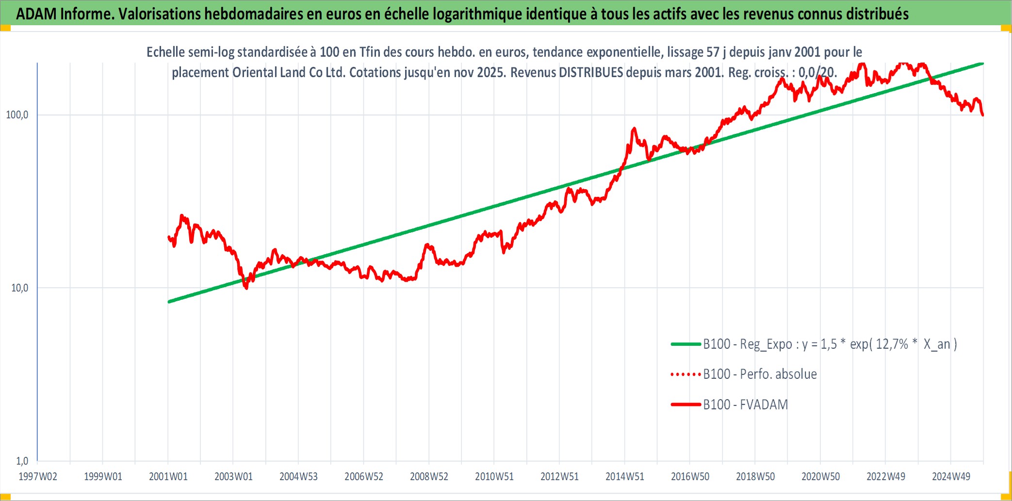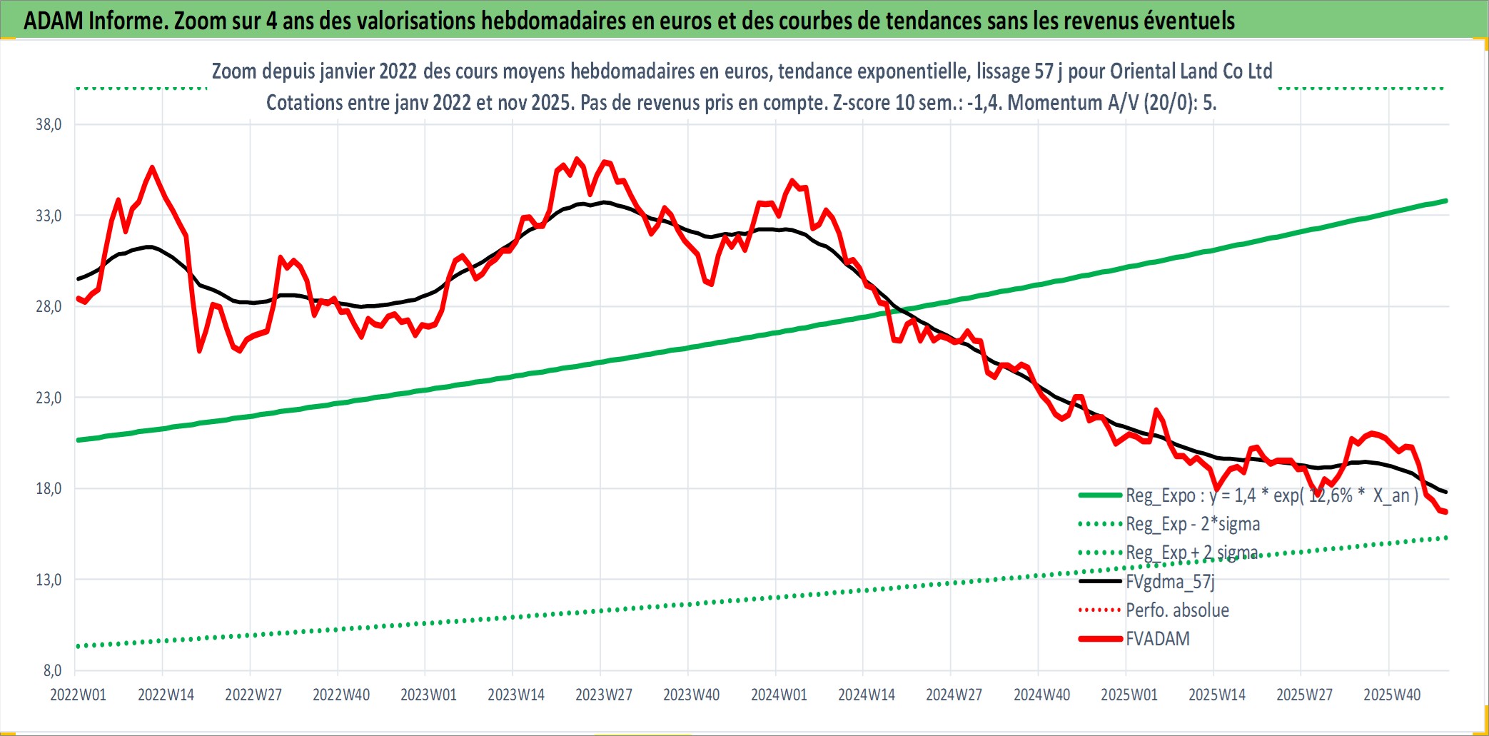 Site dédié aux investisseursPage dédiée sur site financeAnalyse des valorisations hebdomadaires de l'action Oriental Land Co Ltd. Cet actif est cote en JPY. Les valorisations sont en contrevaleur EURO et couvrent les semaines 2001W02 a 2025W48. Les revenus de cet actif financier sont pris en compte depuis la semaine 2001W13. La note globale ESG de cet actif est estimee a 9.0 (apres rebasage entre 0 et 20).