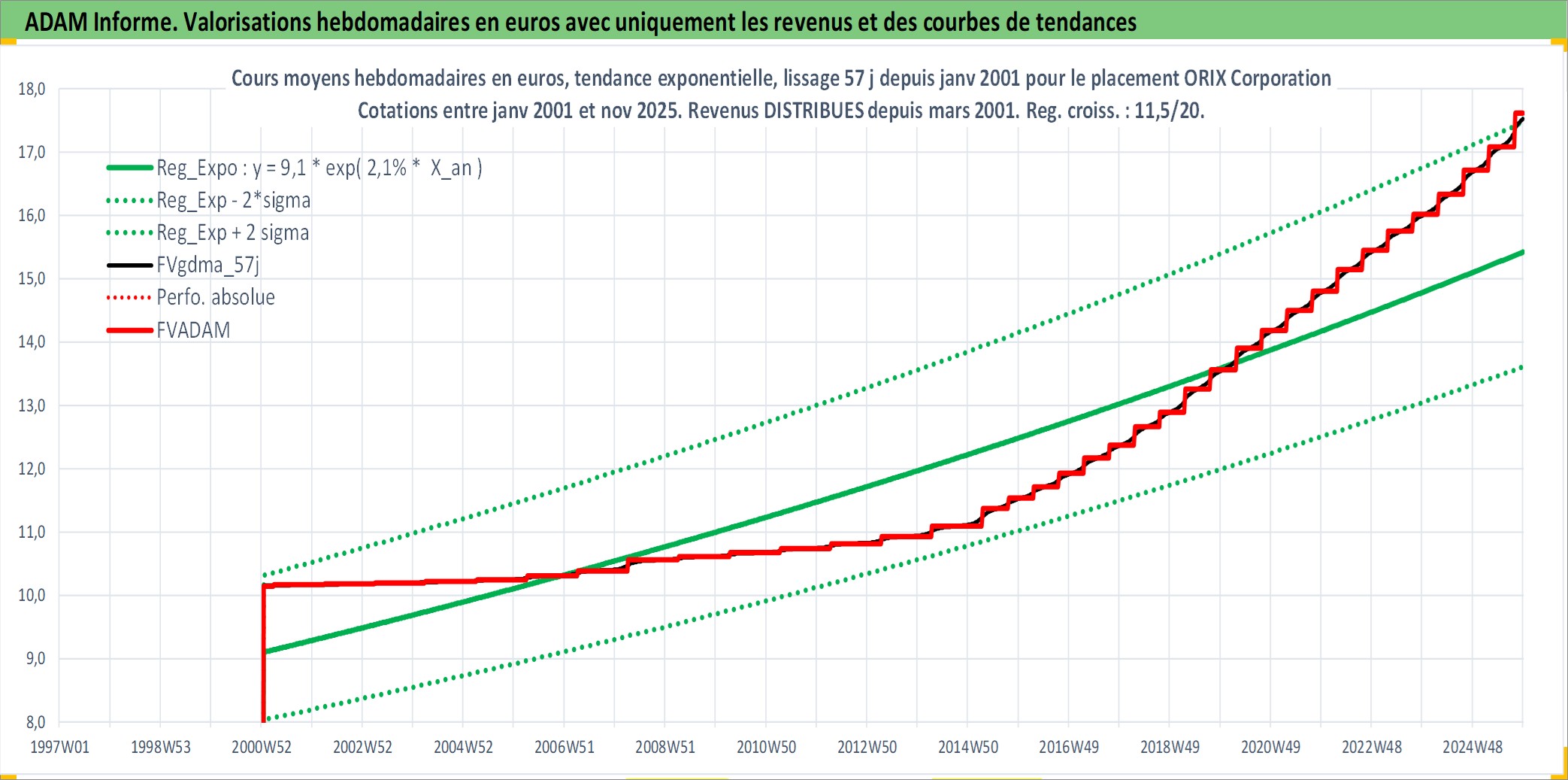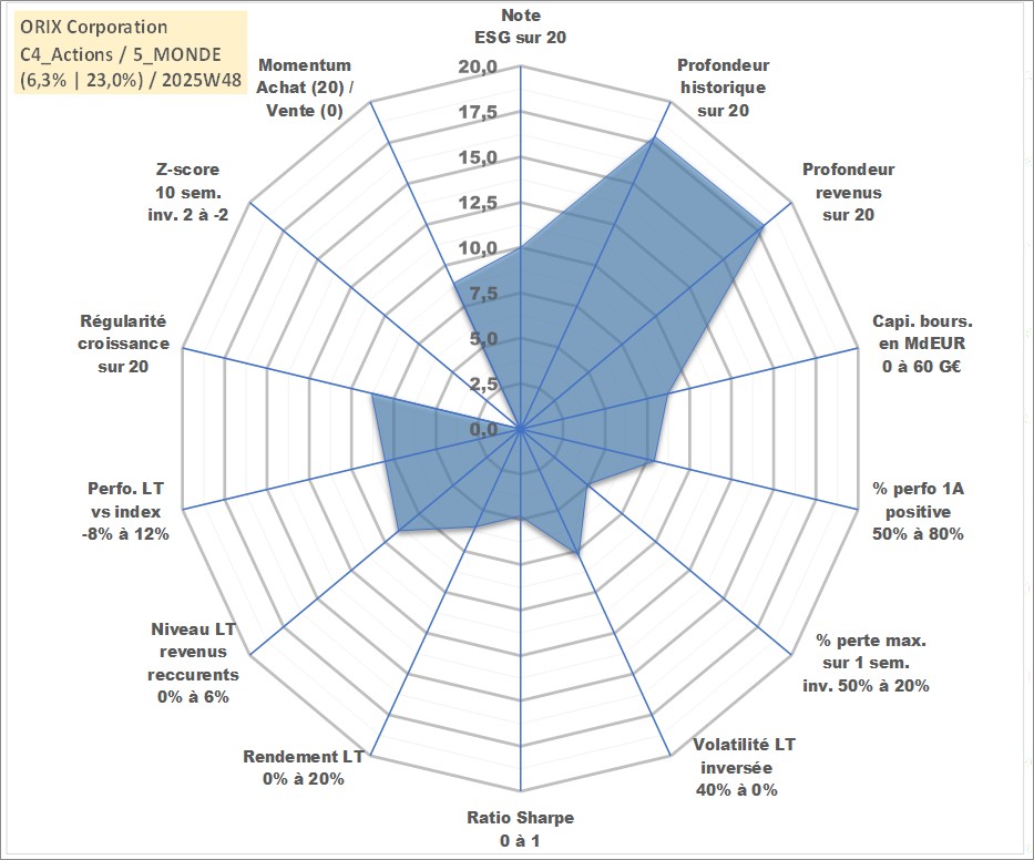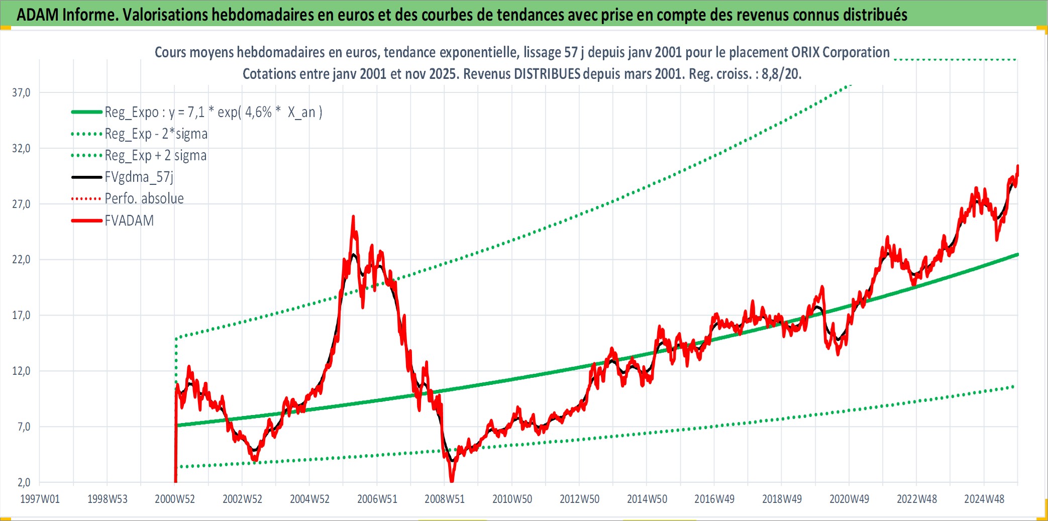 Site dédié aux investisseursPage dédiée sur site financeAnalyse des valorisations hebdomadaires de l'action ORIX Corporation. Cet actif est cote en JPY. Les valorisations sont en contrevaleur EURO et couvrent les semaines 2001W02 a 2025W48. Les revenus de cet actif financier sont pris en compte depuis la semaine 2001W13. La note globale ESG de cet actif est estimee a 10.0 (apres rebasage entre 0 et 20).