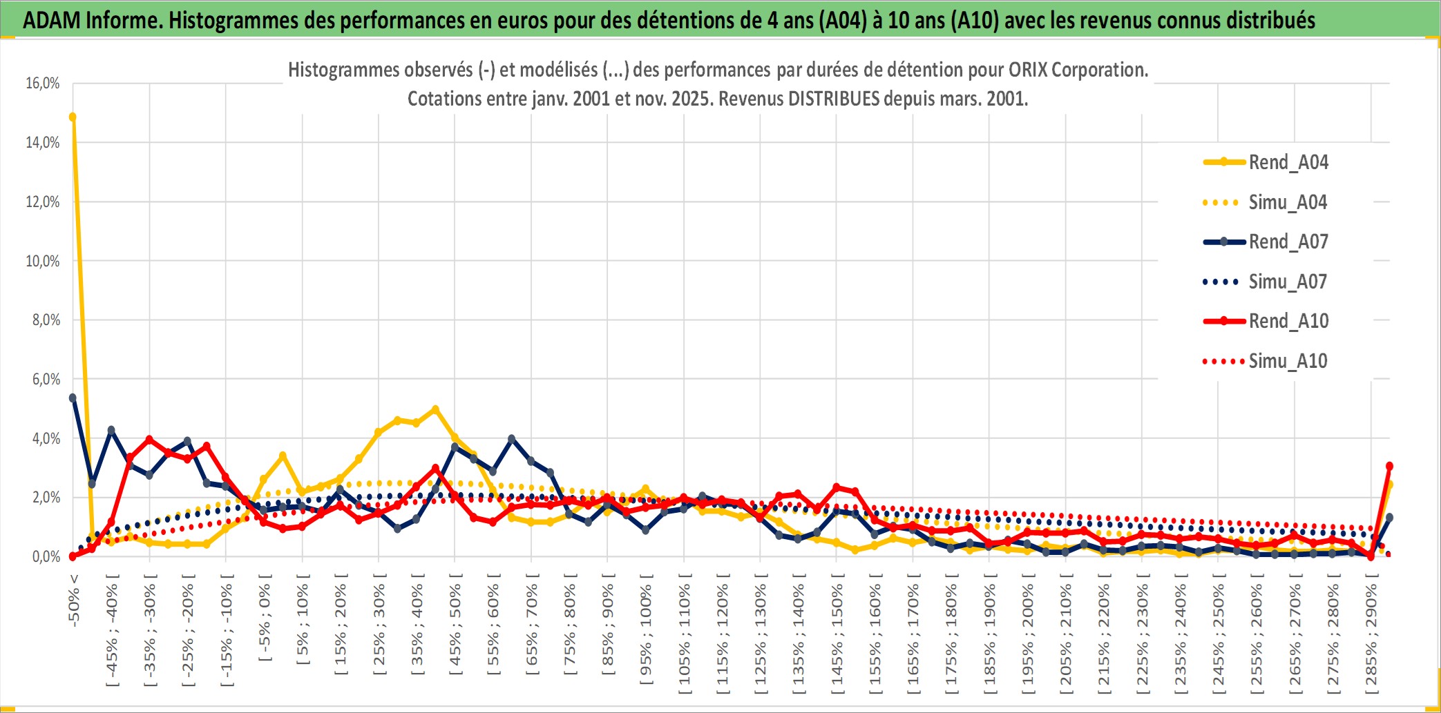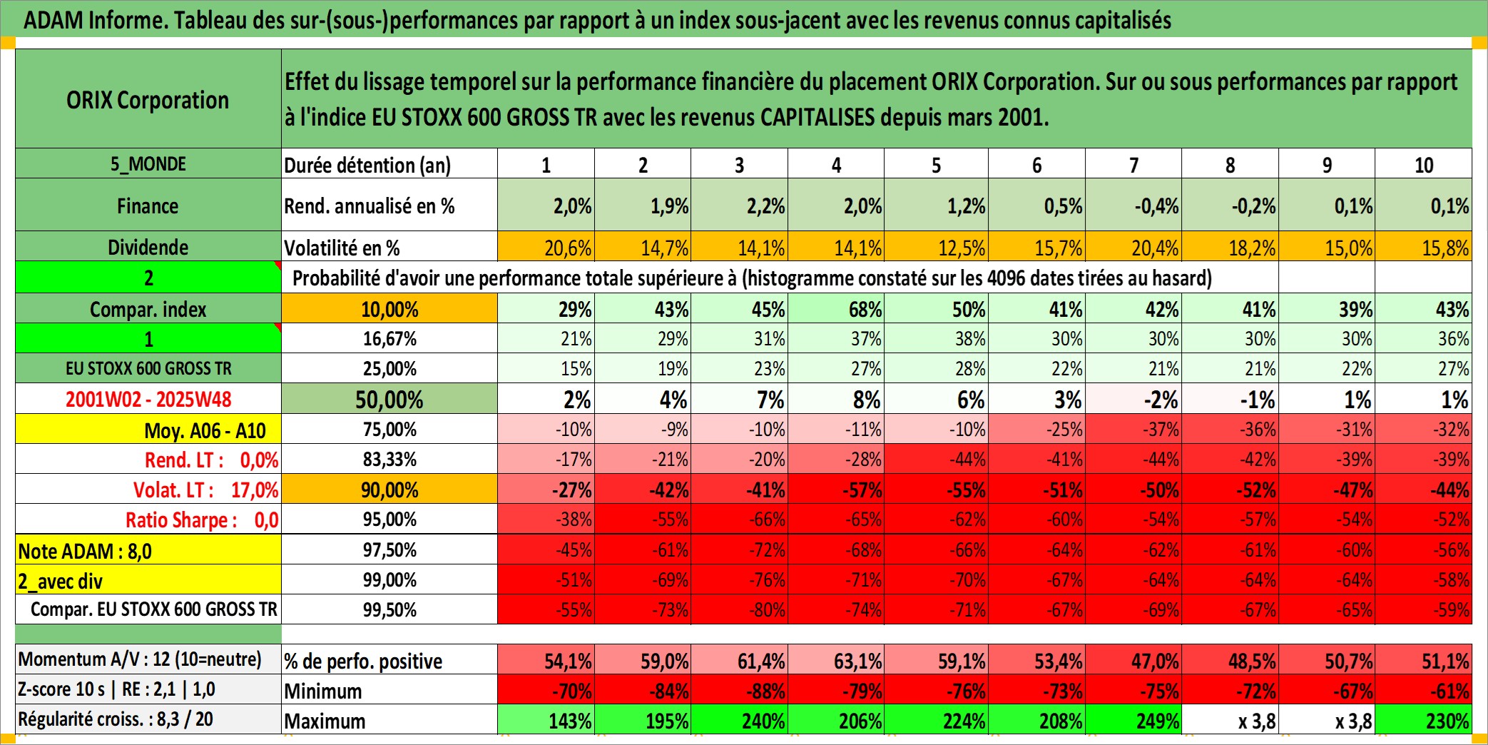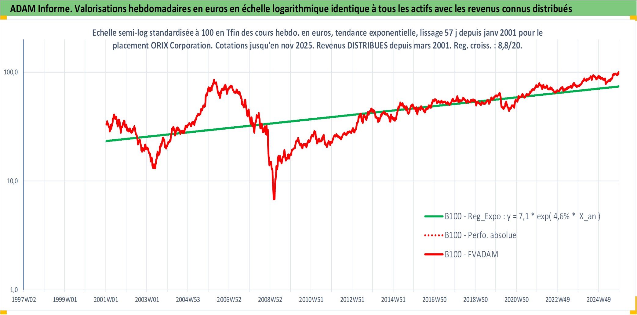 Site dédié aux investisseursPage dédiée sur site financeAnalyse des valorisations hebdomadaires de l'action ORIX Corporation. Cet actif est cote en JPY. Les valorisations sont en contrevaleur EURO et couvrent les semaines 2001W02 a 2025W48. Les revenus de cet actif financier sont pris en compte depuis la semaine 2001W13. La note globale ESG de cet actif est estimee a 10.0 (apres rebasage entre 0 et 20).