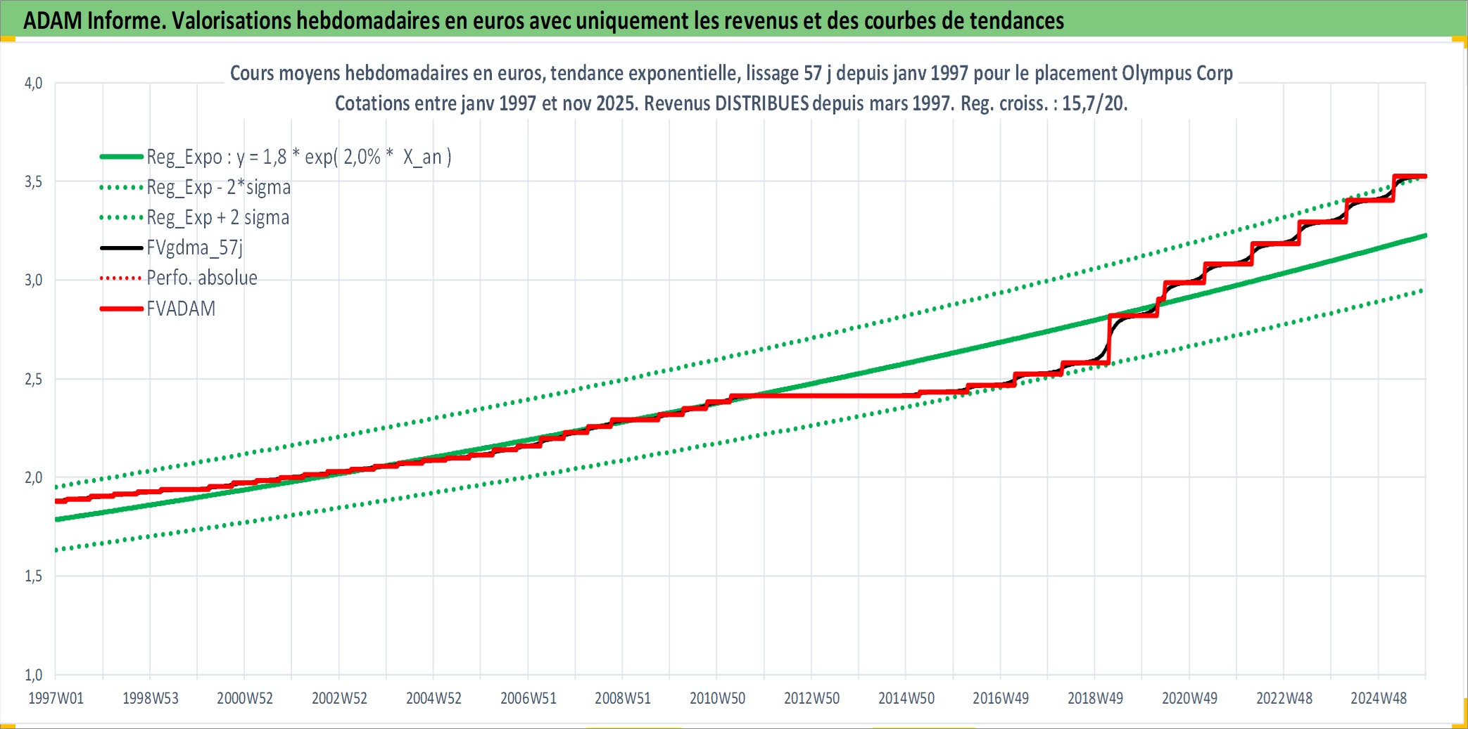 Site dédié aux investisseursPage dédiée sur site financeAnalyse des valorisations hebdomadaires de l'action Olympus Corp. Cet actif est cote en JPY. Les valorisations sont en contrevaleur EURO et couvrent les semaines 1997W01 a 2025W48. Les revenus de cet actif financier sont pris en compte depuis la semaine 1997W13. La note globale ESG de cet actif est estimee a 7.0 (apres rebasage entre 0 et 20).
