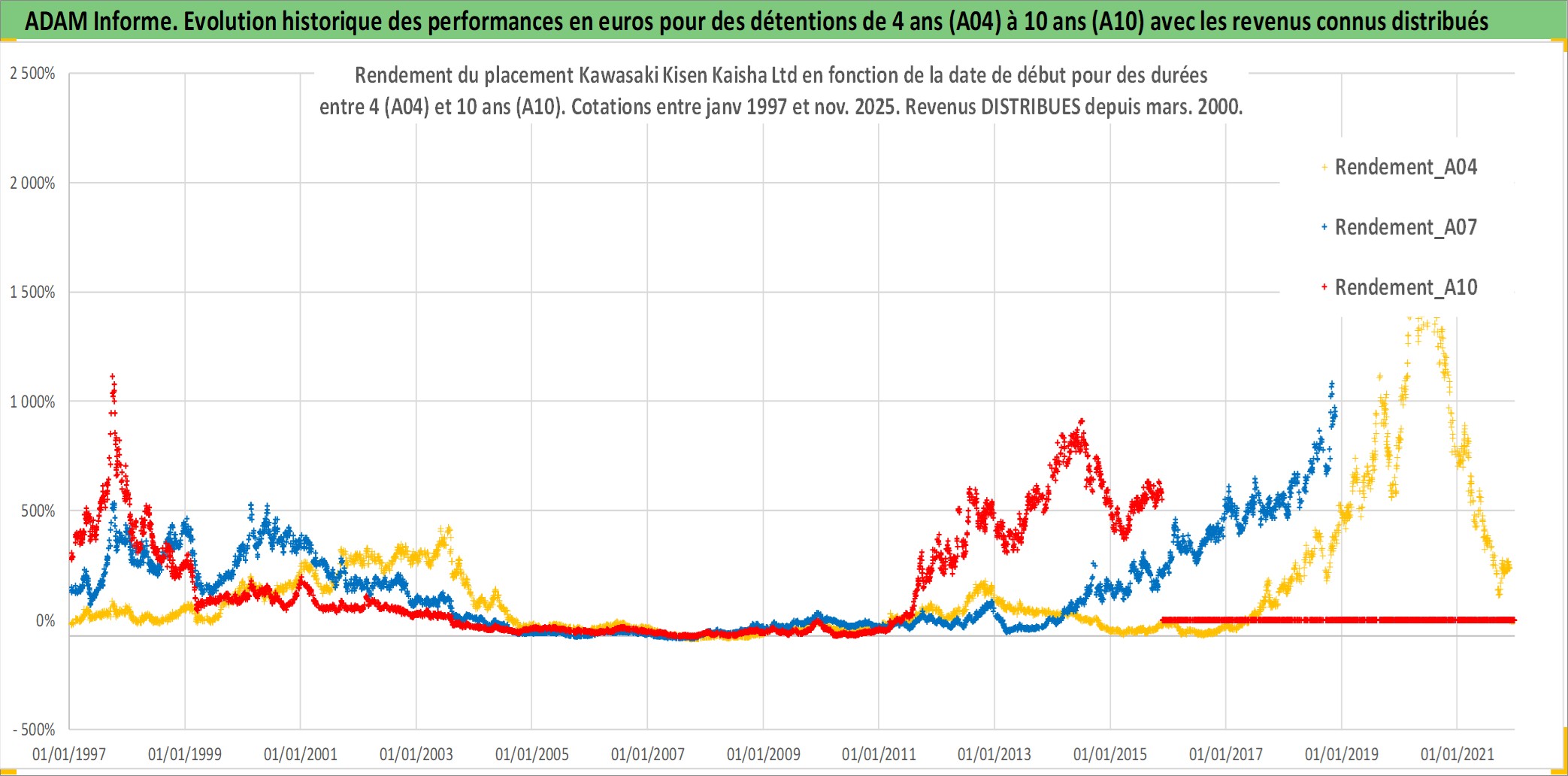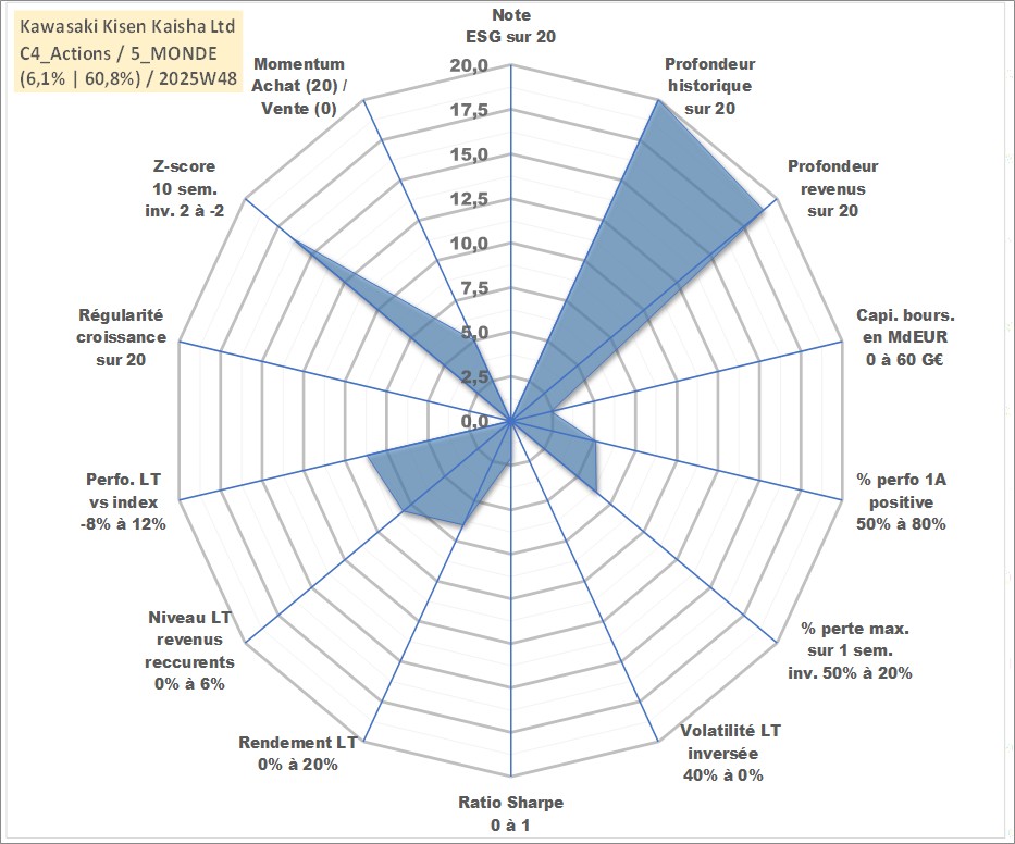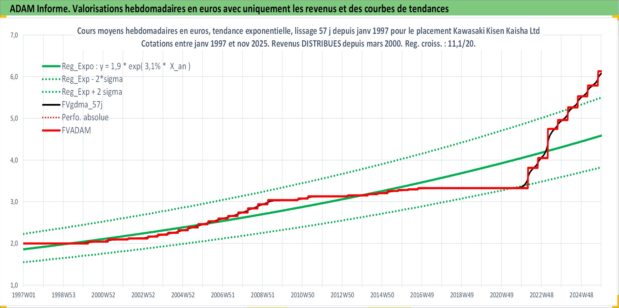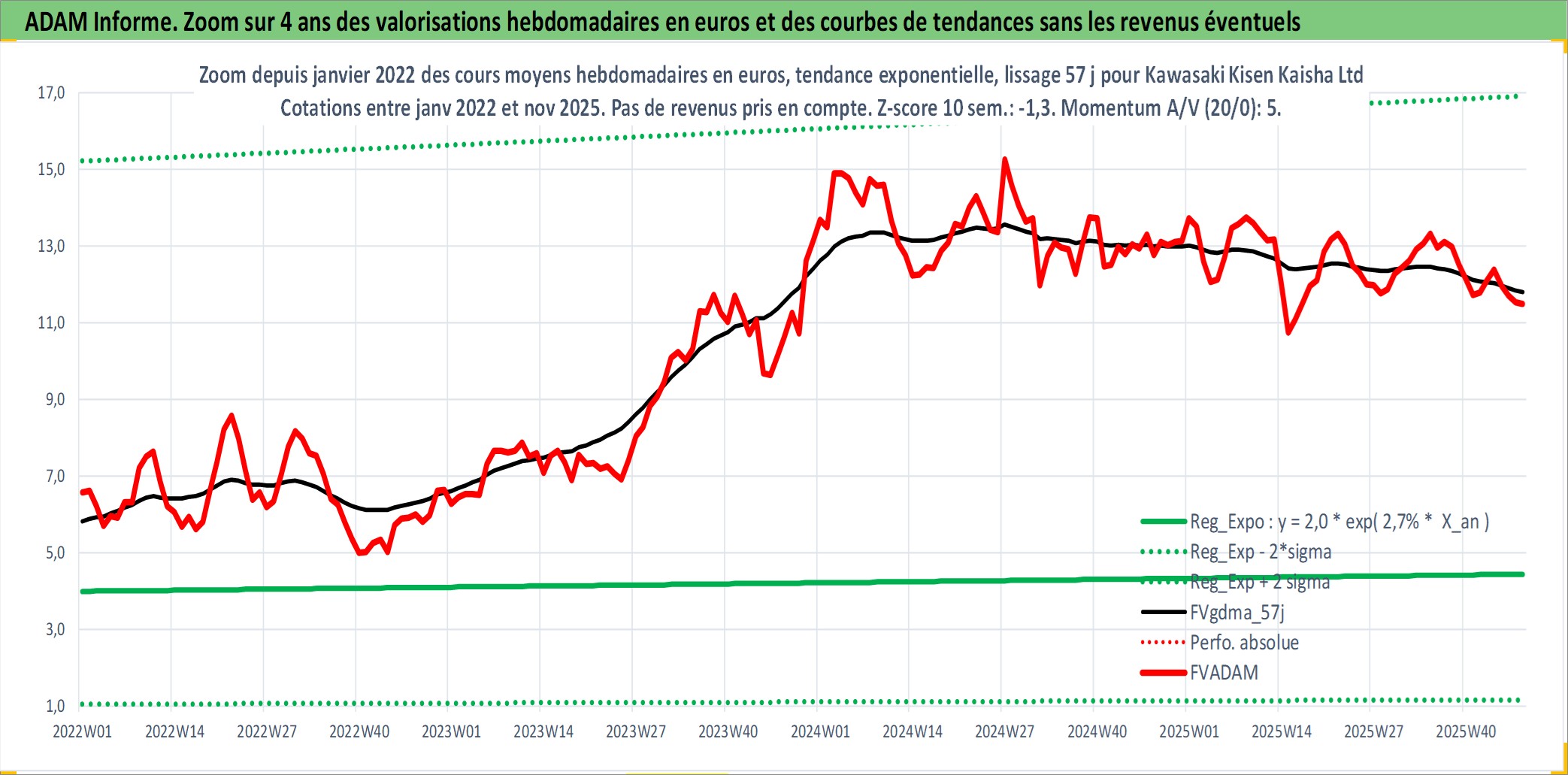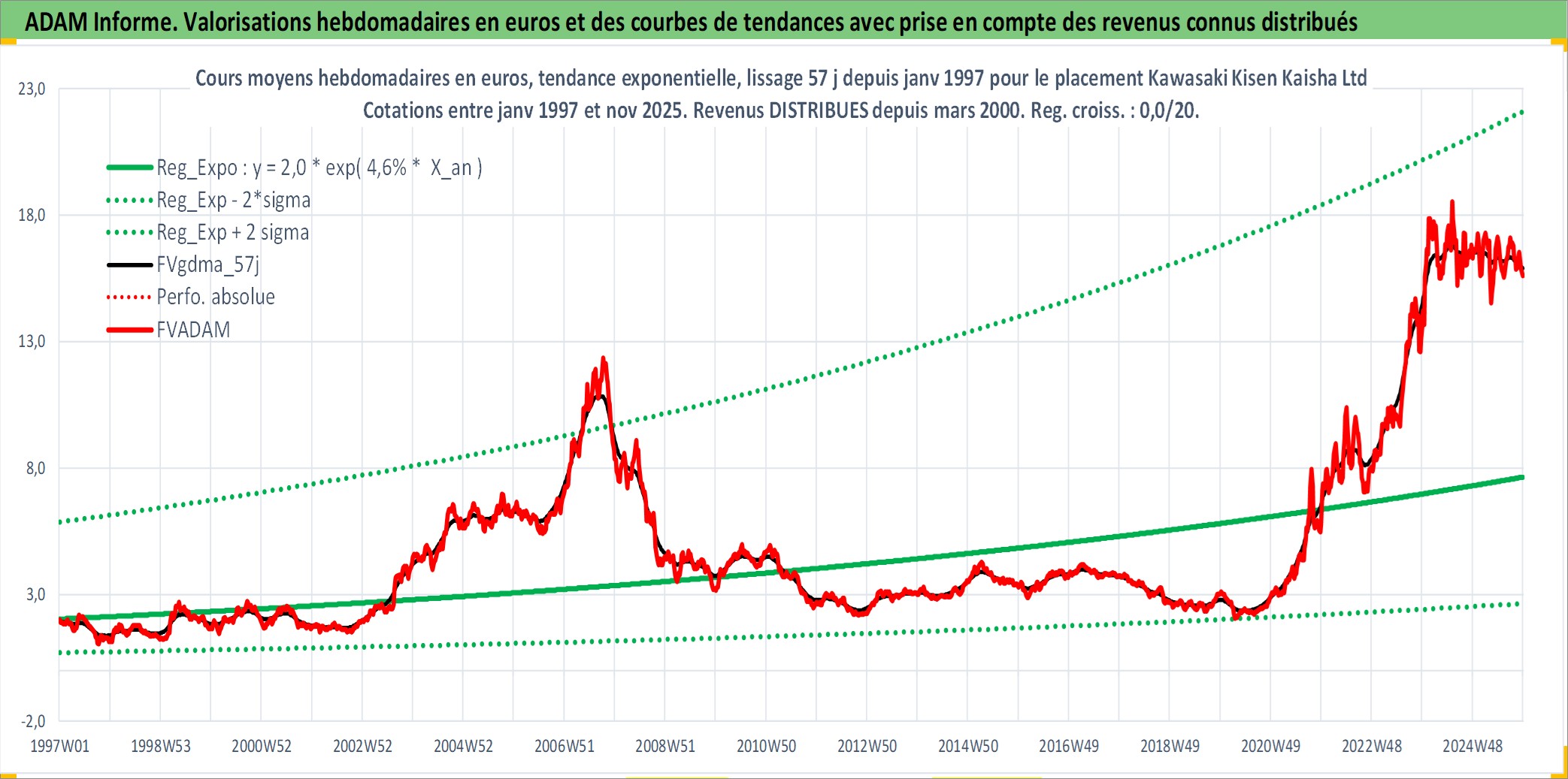 Site dédié aux investisseursPage dédiée sur site financeAnalyse des valorisations hebdomadaires de l'action Kawasaki Kisen Kaisha Ltd. Cet actif est cote en JPY. Les valorisations sont en contrevaleur EURO et couvrent les semaines 1997W01 a 2025W48. Les revenus de cet actif financier sont pris en compte depuis la semaine 2000W13. La note ESG de cet actif n'est pas connue.