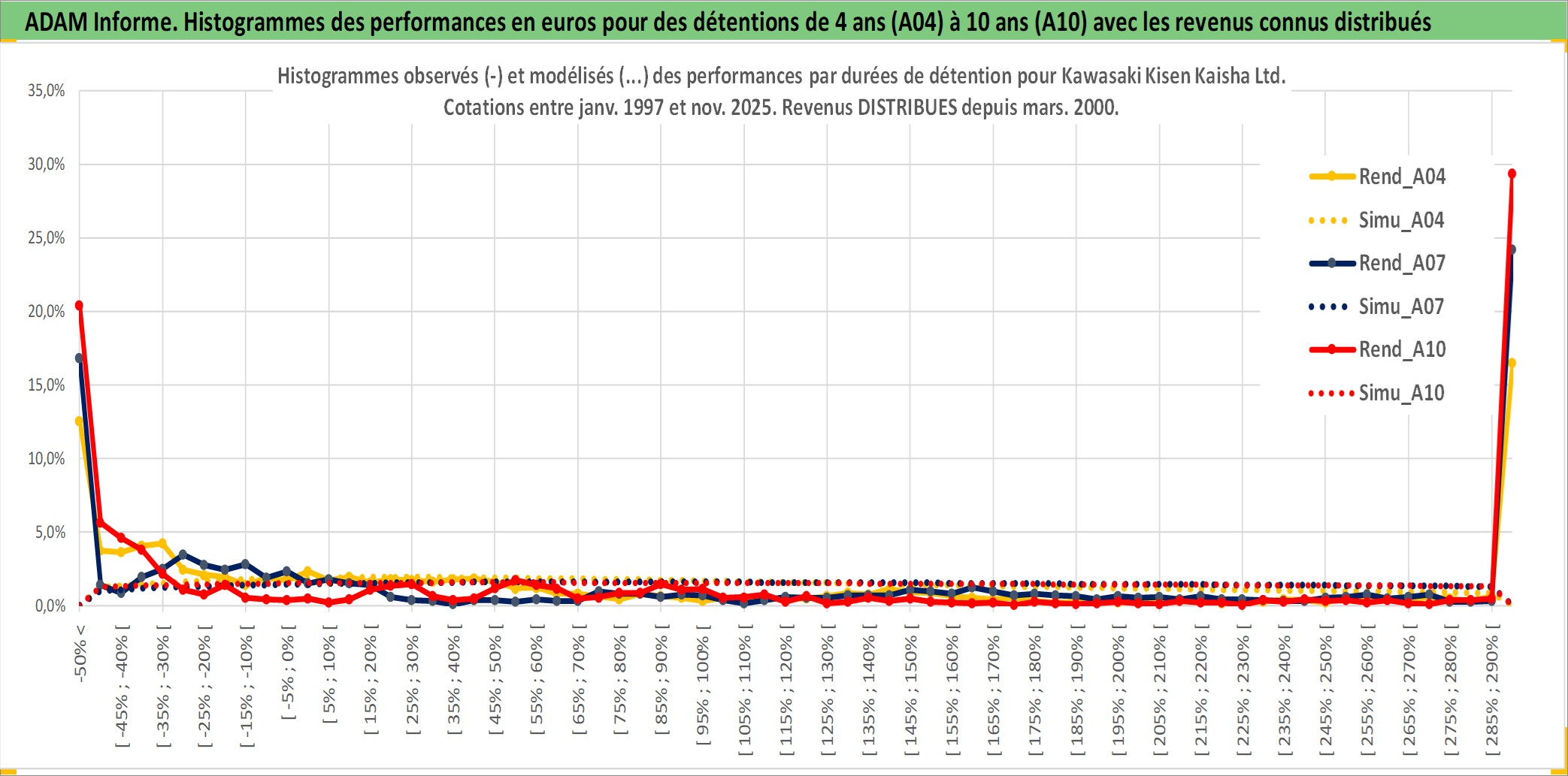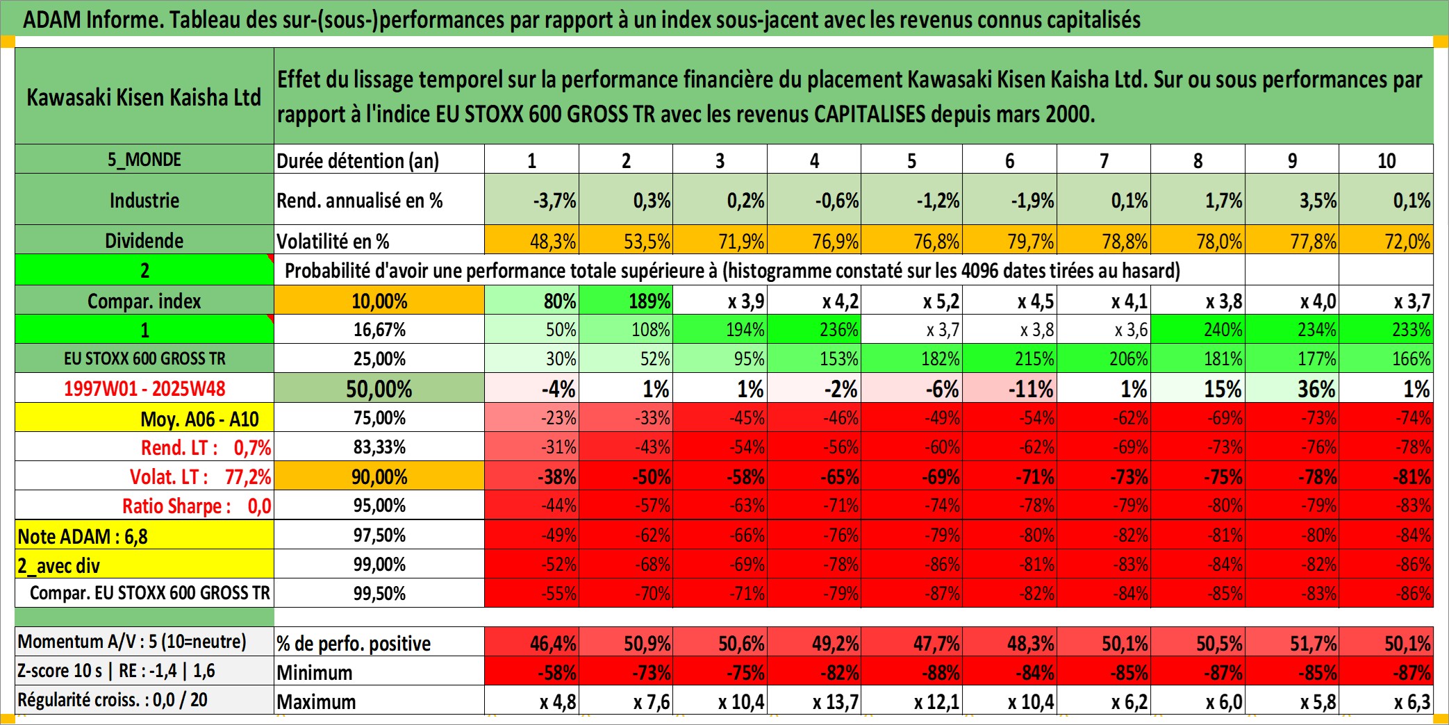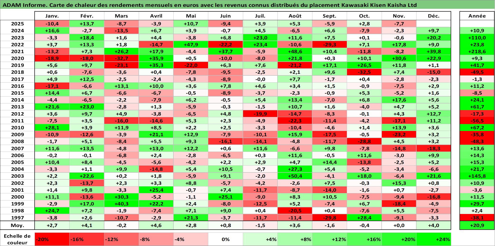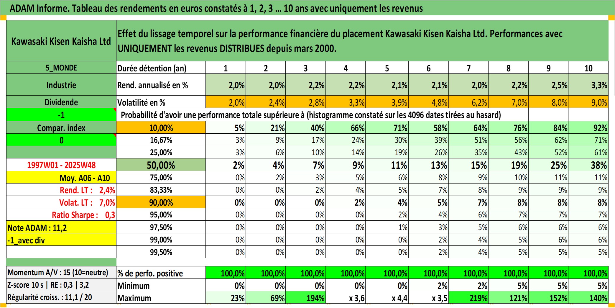 Site dédié aux investisseursPage dédiée sur site financeAnalyse des valorisations hebdomadaires de l'action Kawasaki Kisen Kaisha Ltd. Cet actif est cote en JPY. Les valorisations sont en contrevaleur EURO et couvrent les semaines 1997W01 a 2025W48. Les revenus de cet actif financier sont pris en compte depuis la semaine 2000W13. La note ESG de cet actif n'est pas connue.