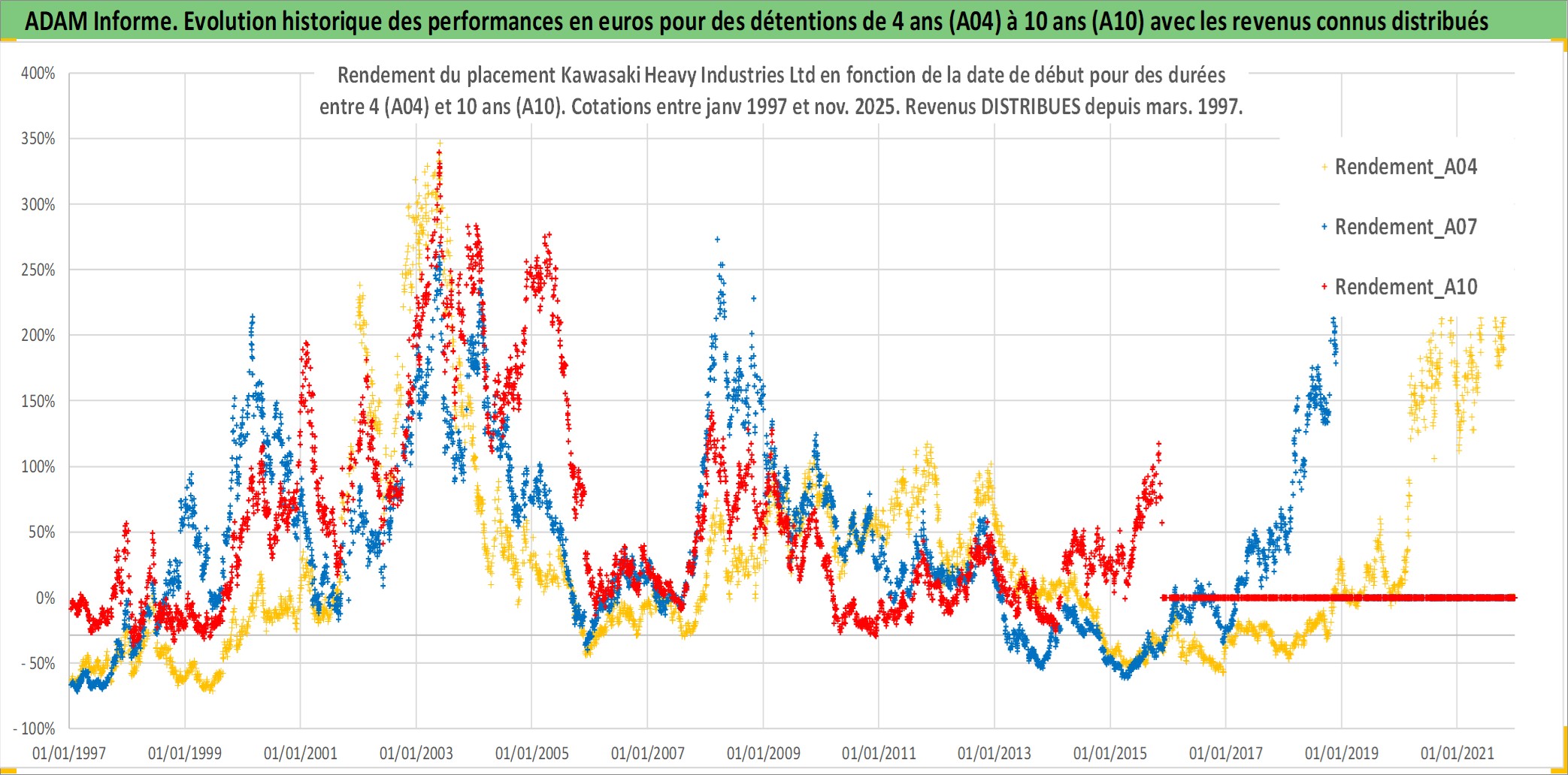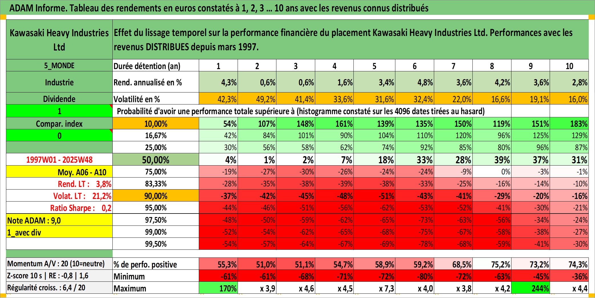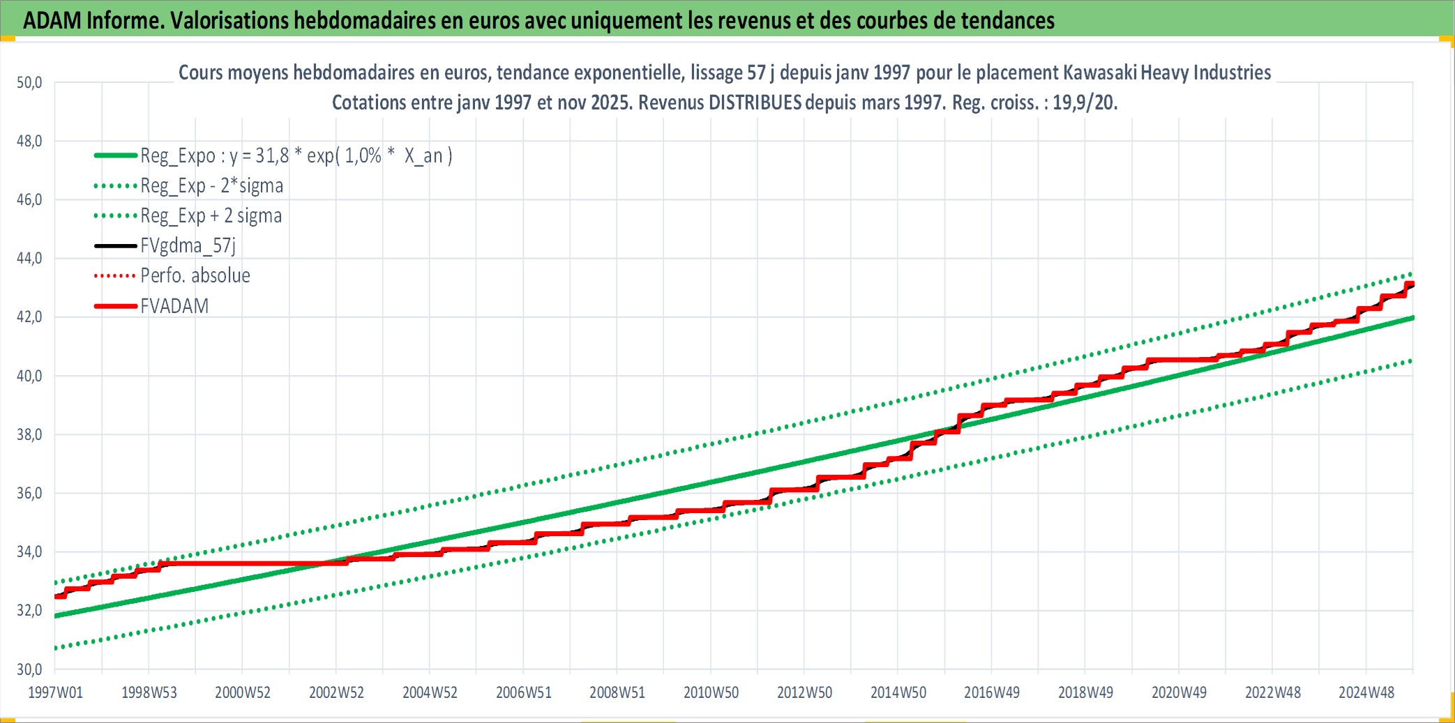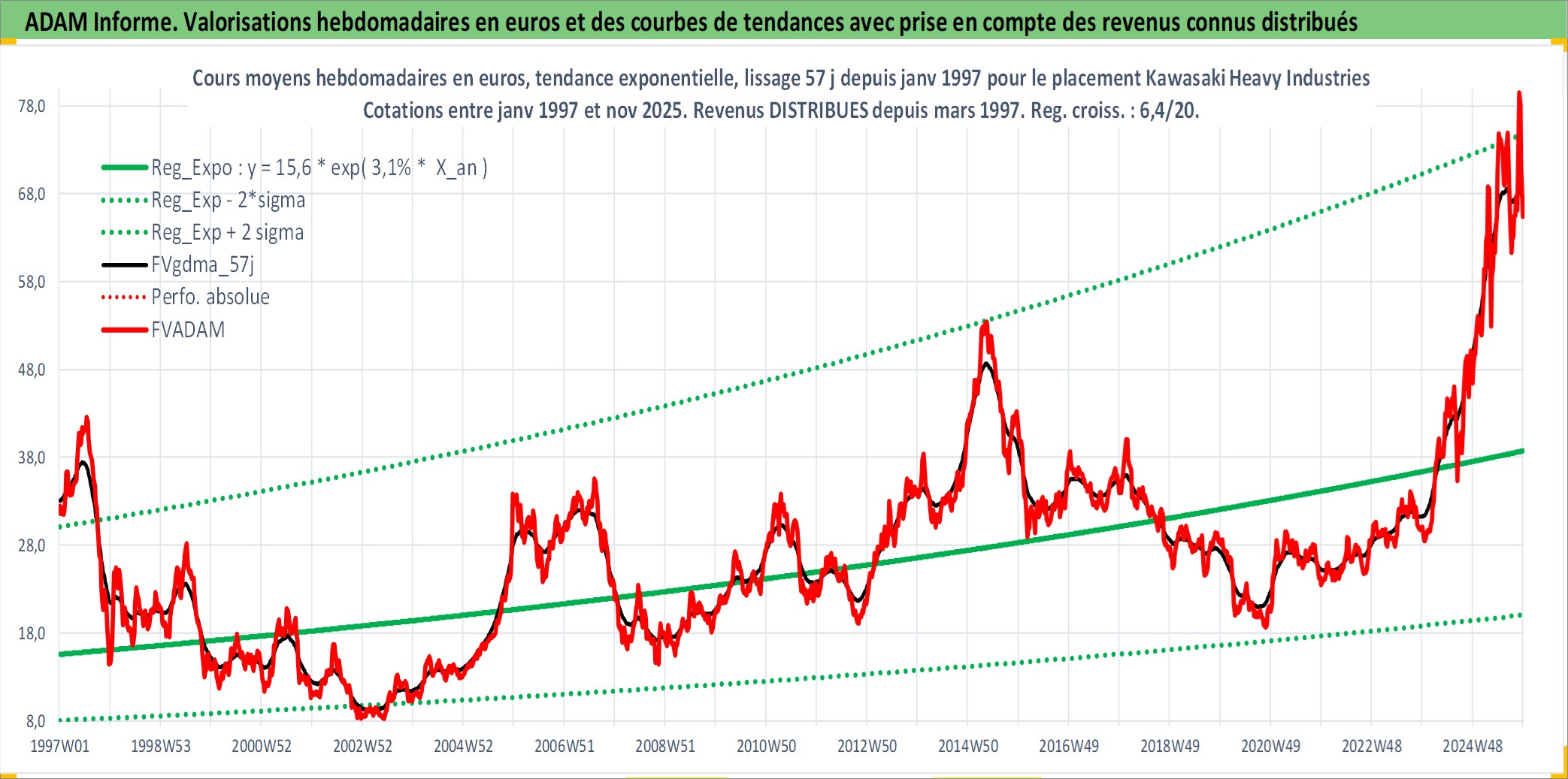 Site dédié aux investisseursPage dédiée sur site financeAnalyse des valorisations hebdomadaires de l'action Kawasaki Heavy Industries Ltd. Cet actif est cote en JPY. Les valorisations sont en contrevaleur EURO et couvrent les semaines 1997W01 a 2025W48. Les revenus de cet actif financier sont pris en compte depuis la semaine 1997W13. La note globale ESG de cet actif est estimee a 2.0 (apres rebasage entre 0 et 20).