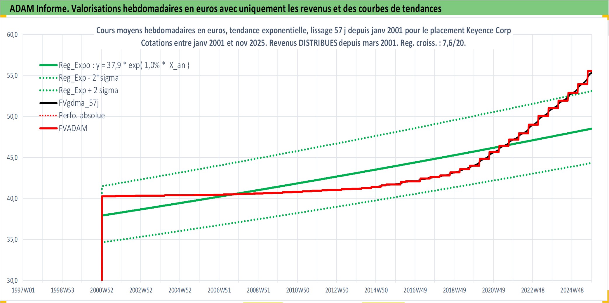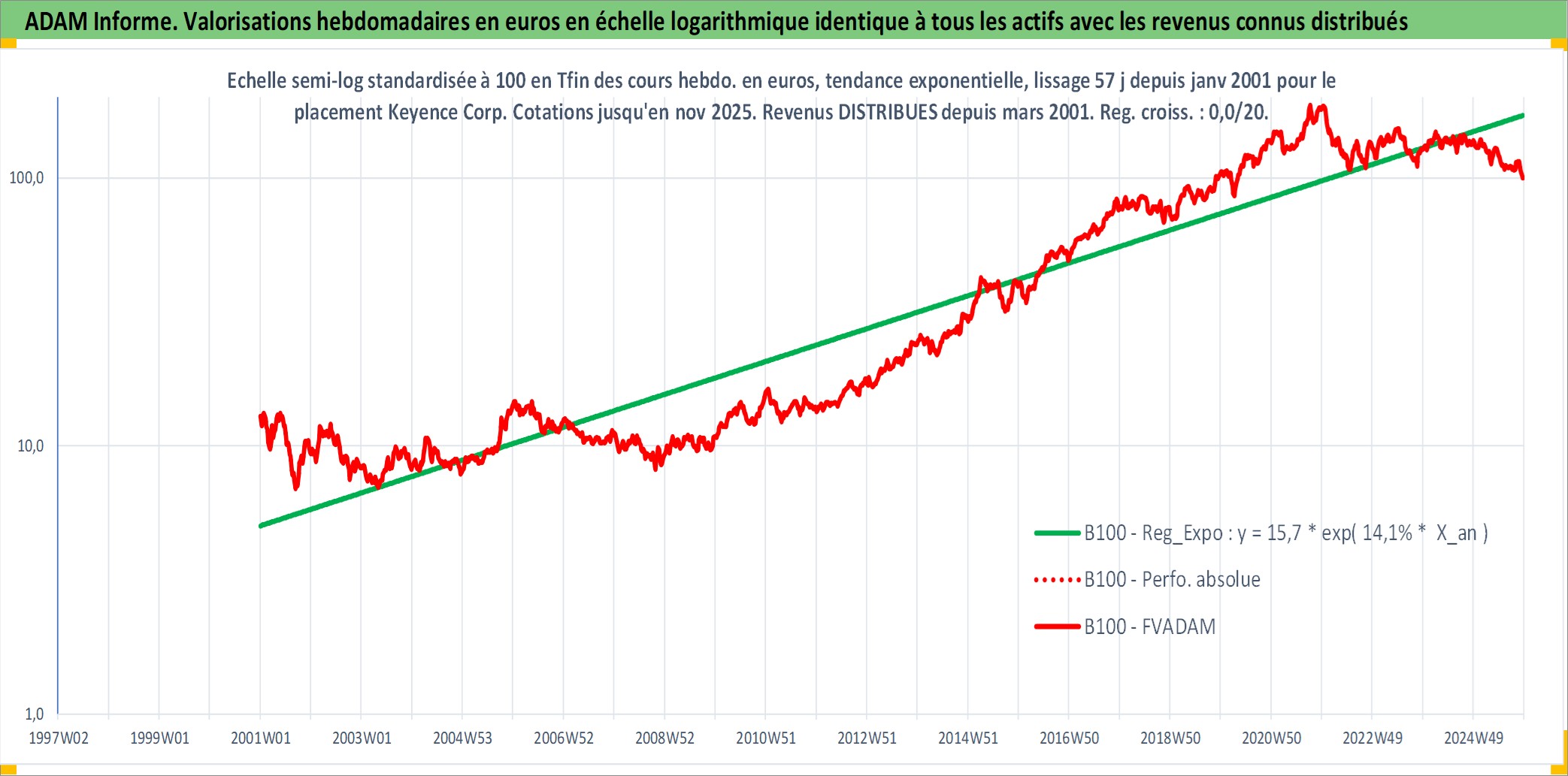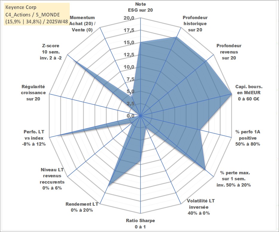Site dédié aux investisseursPage dédiée sur site financeAnalyse des valorisations hebdomadaires de l'action Keyence Corp. Cet actif est cote en JPY. Les valorisations sont en contrevaleur EURO et couvrent les semaines 2001W01 a 2025W48. Les revenus de cet actif financier sont pris en compte depuis la semaine 2001W11. La note globale ESG de cet actif est estimee a 15.0 (apres rebasage entre 0 et 20).