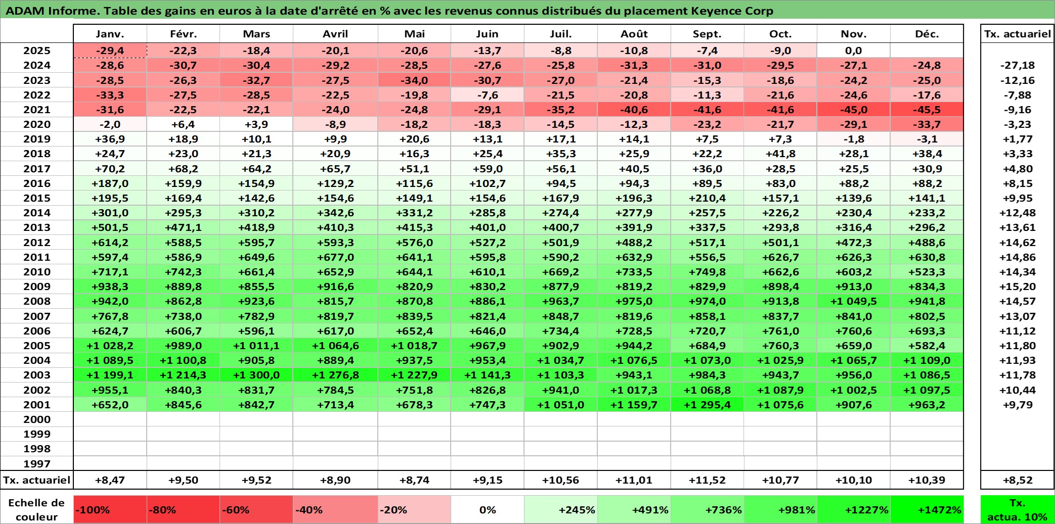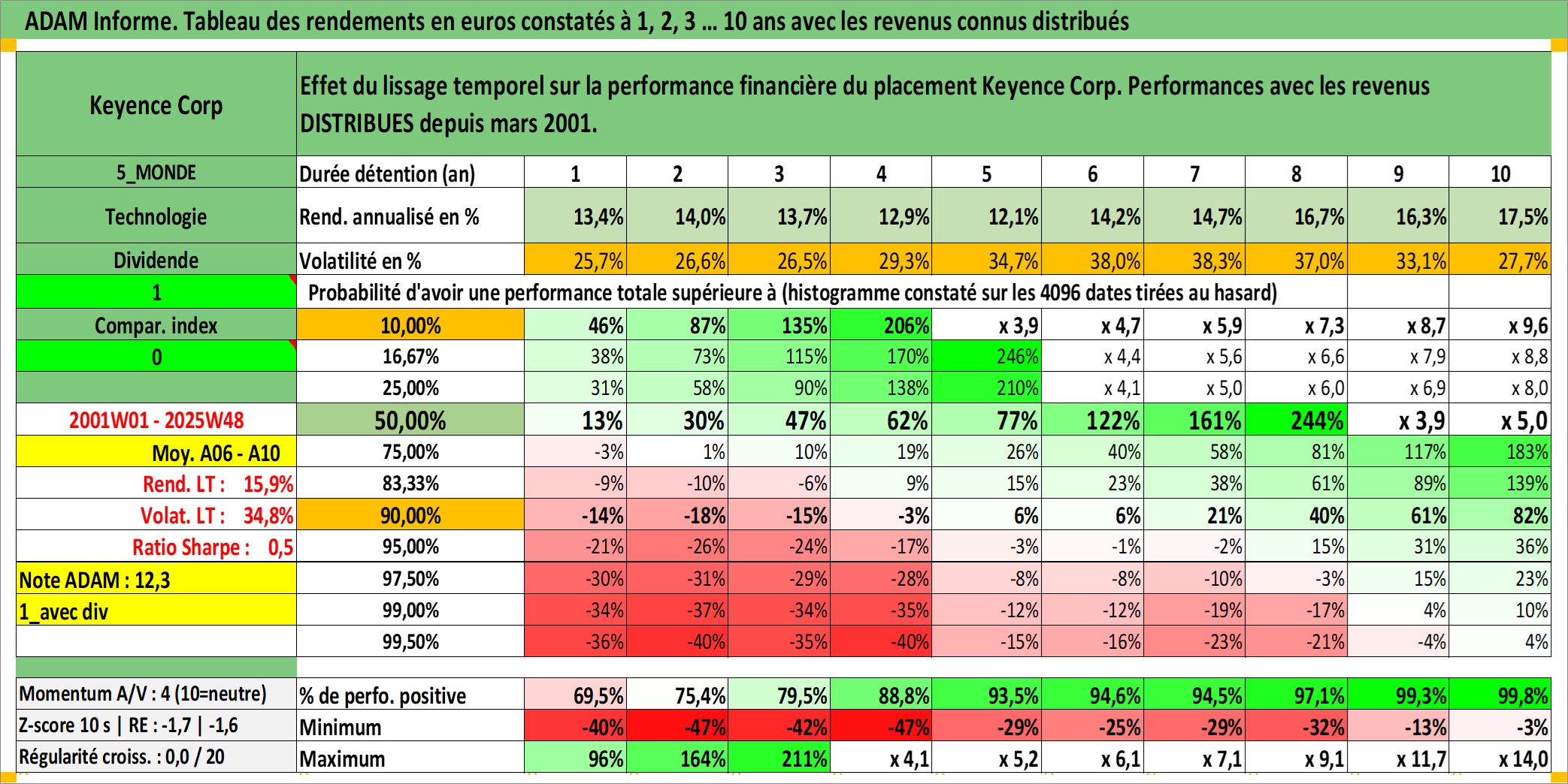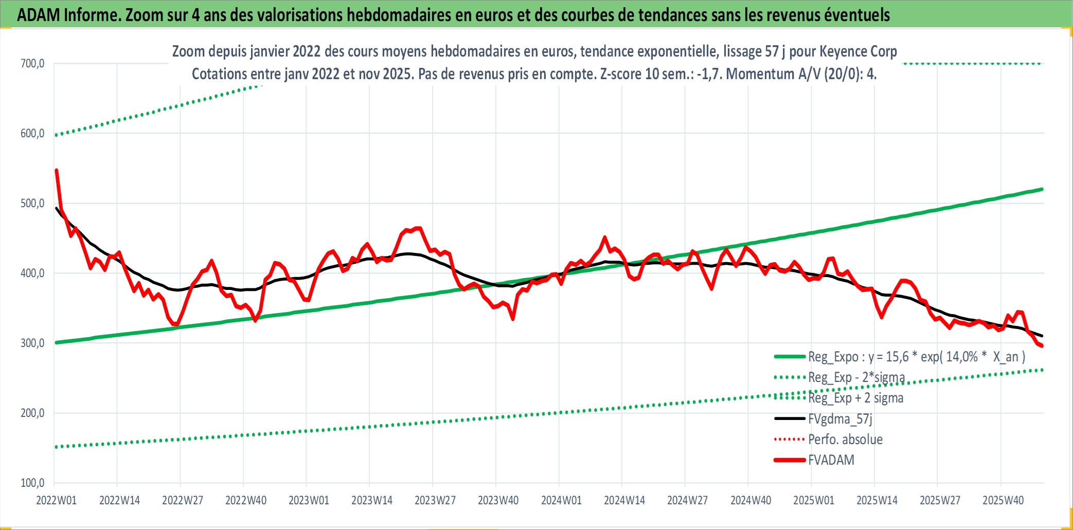 Site dédié aux investisseursPage dédiée sur site financeAnalyse des valorisations hebdomadaires de l'action Keyence Corp. Cet actif est cote en JPY. Les valorisations sont en contrevaleur EURO et couvrent les semaines 2001W01 a 2025W48. Les revenus de cet actif financier sont pris en compte depuis la semaine 2001W11. La note globale ESG de cet actif est estimee a 15.0 (apres rebasage entre 0 et 20).