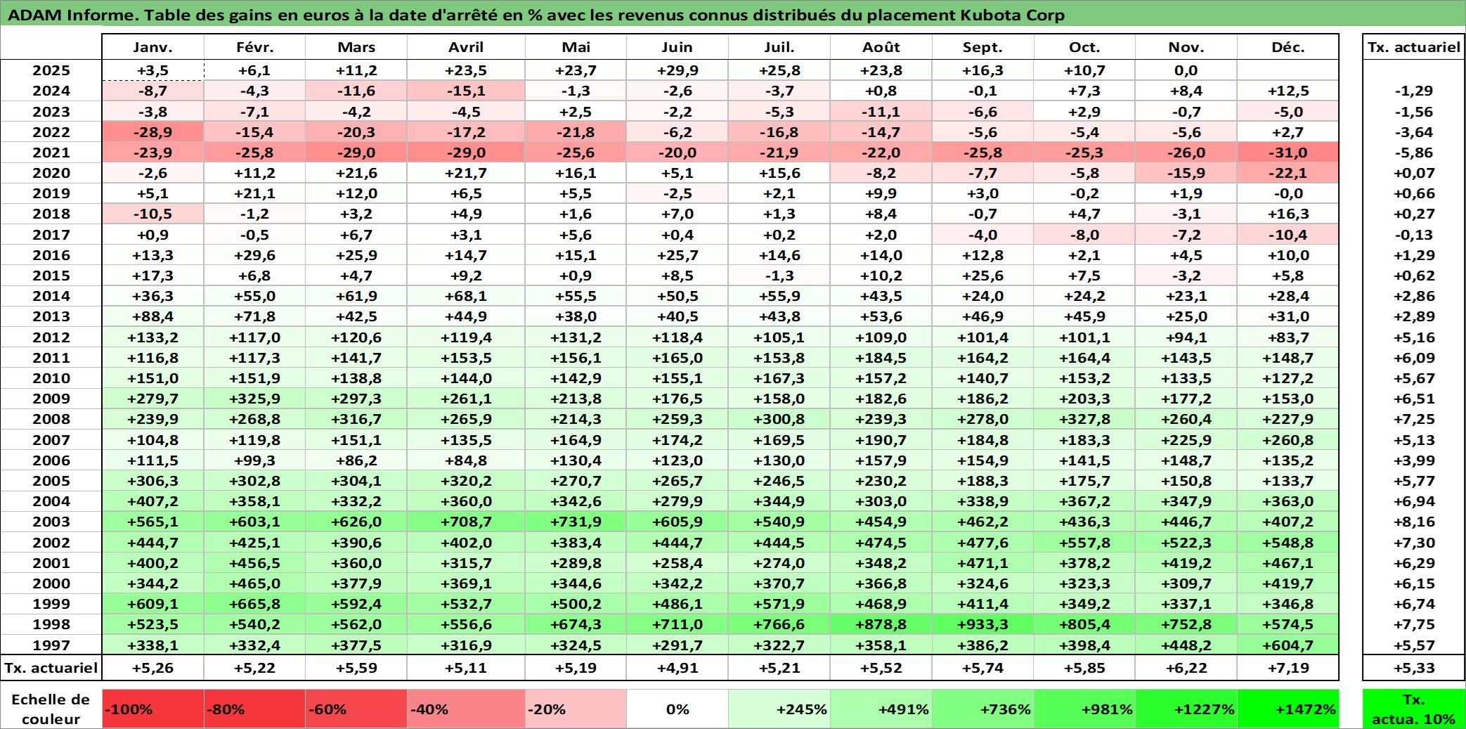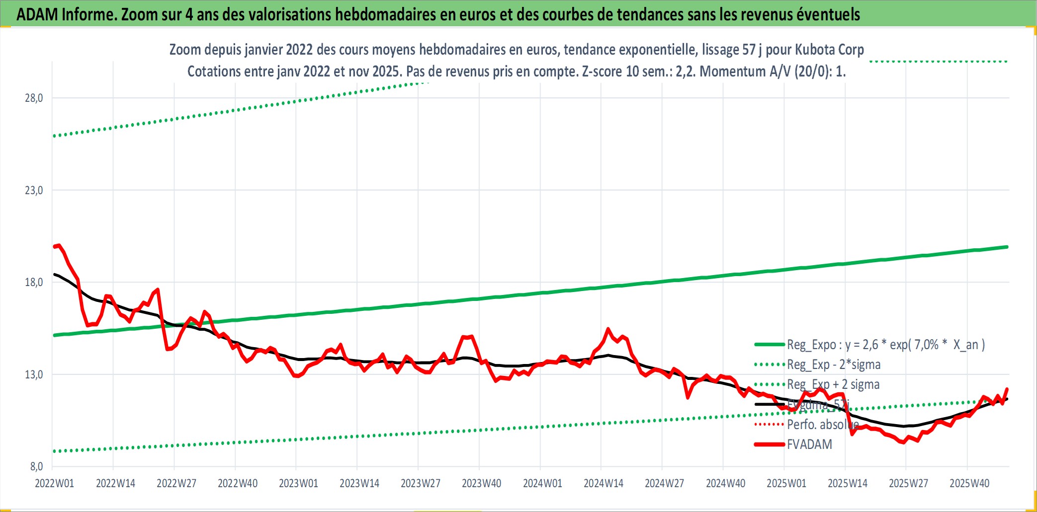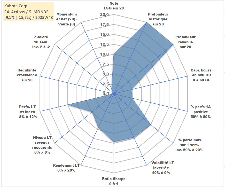 Site dédié aux investisseursPage dédiée sur site financeAnalyse des valorisations hebdomadaires de l'action Kubota Corp. Cet actif est cote en JPY. Les valorisations sont en contrevaleur EURO et couvrent les semaines 1997W01 a 2025W48. Les revenus de cet actif financier sont pris en compte depuis la semaine 1997W13. La note globale ESG de cet actif est estimee a 10.0 (apres rebasage entre 0 et 20).