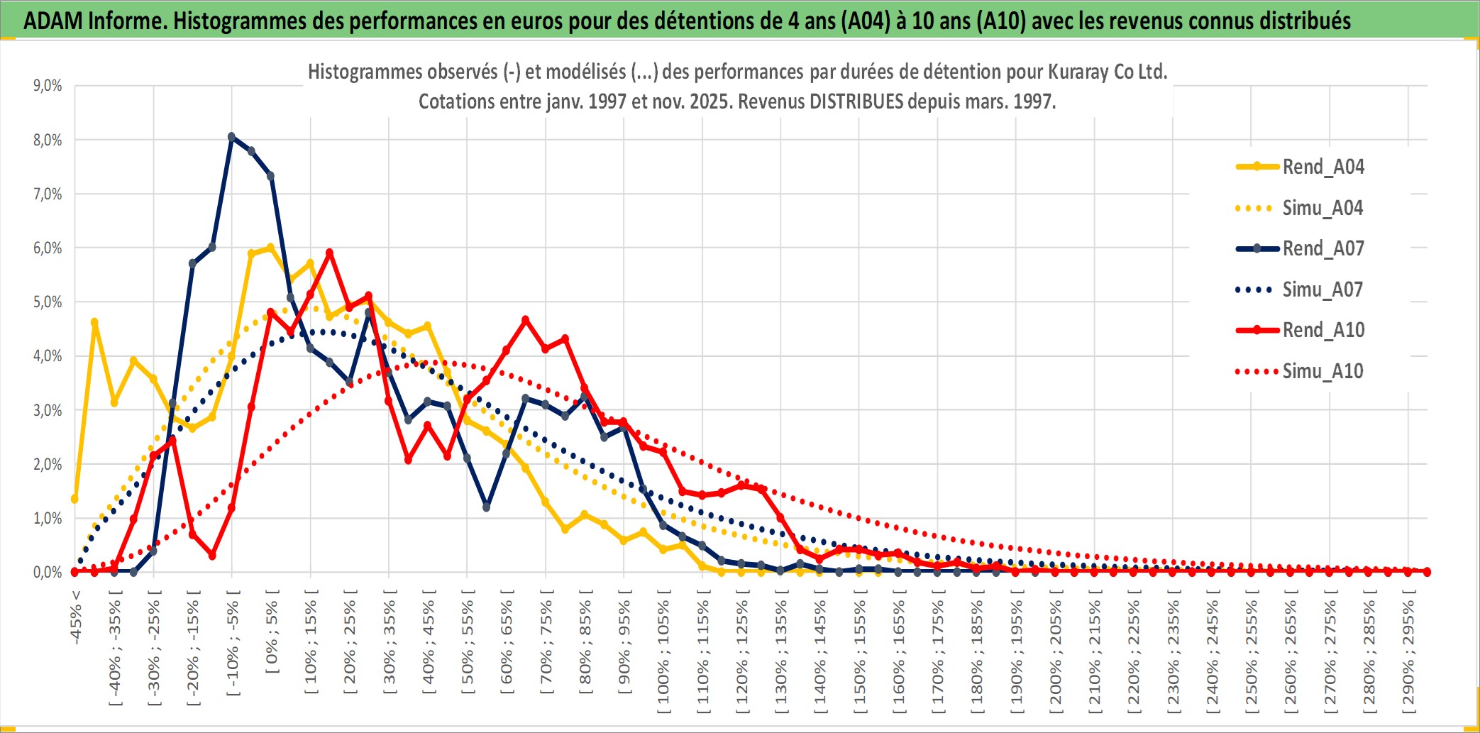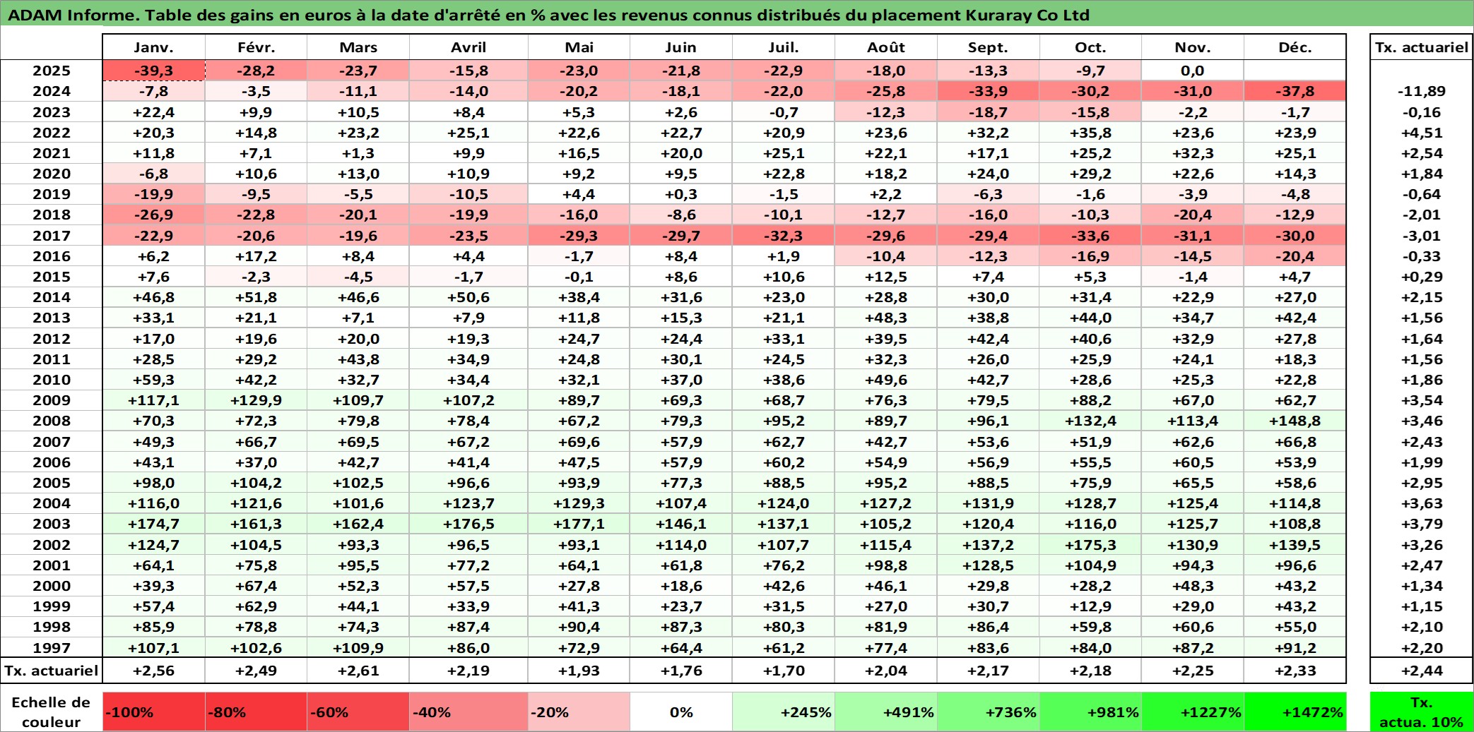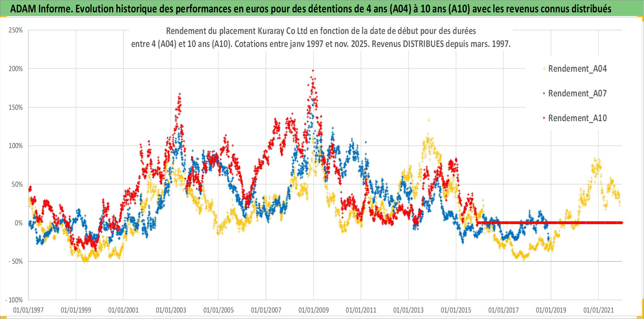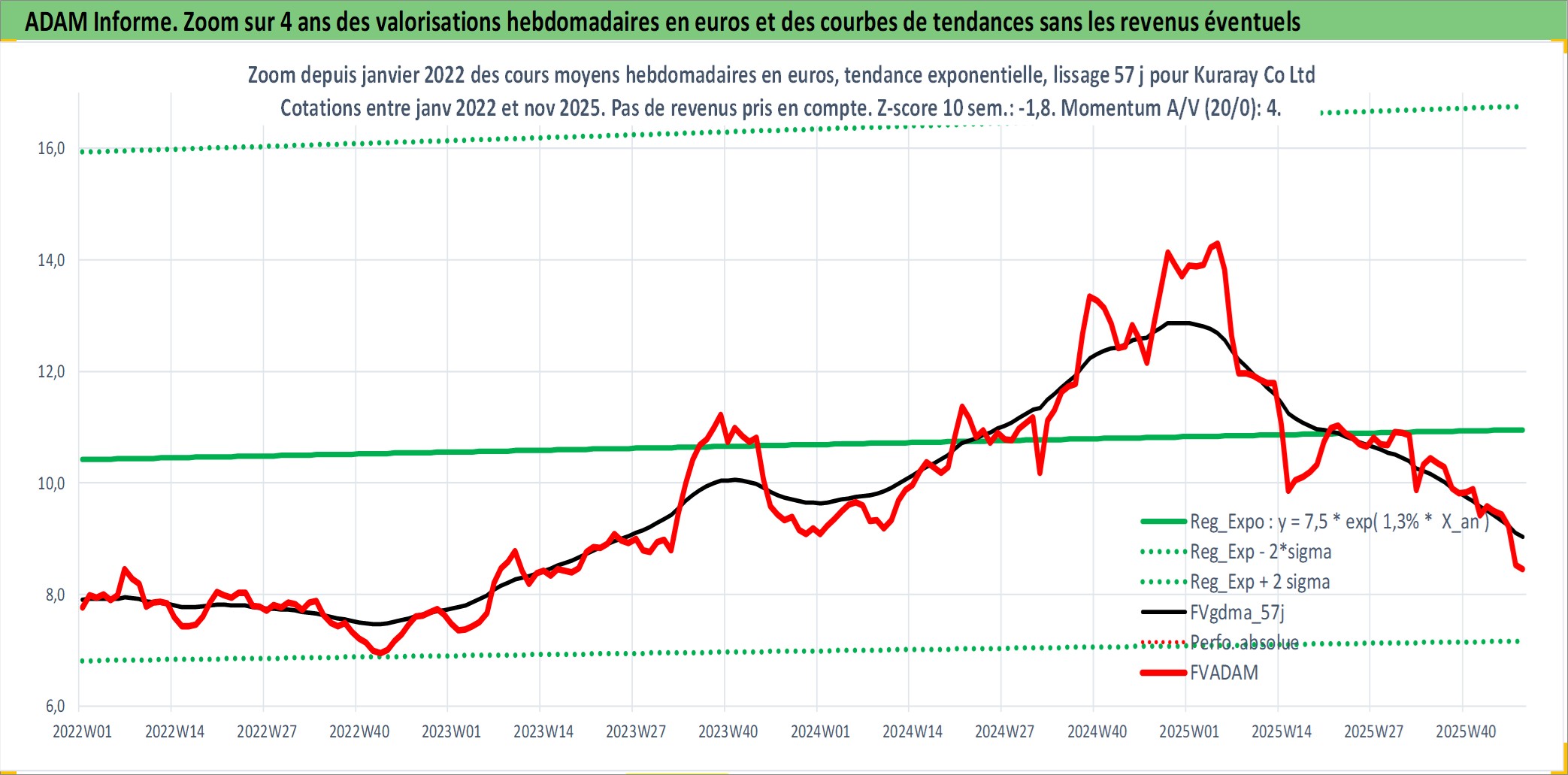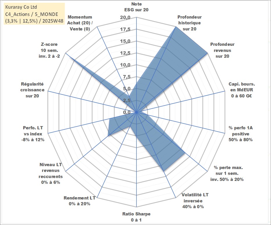 Site dédié aux investisseursPage dédiée sur site financeAnalyse des valorisations hebdomadaires de l'action Kuraray Co Ltd. Cet actif est cote en JPY. Les valorisations sont en contrevaleur EURO et couvrent les semaines 1997W01 a 2025W48. Les revenus de cet actif financier sont pris en compte depuis la semaine 1997W13. La note globale ESG de cet actif est estimee a 6.0 (apres rebasage entre 0 et 20).