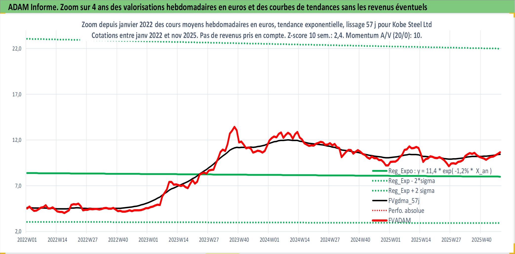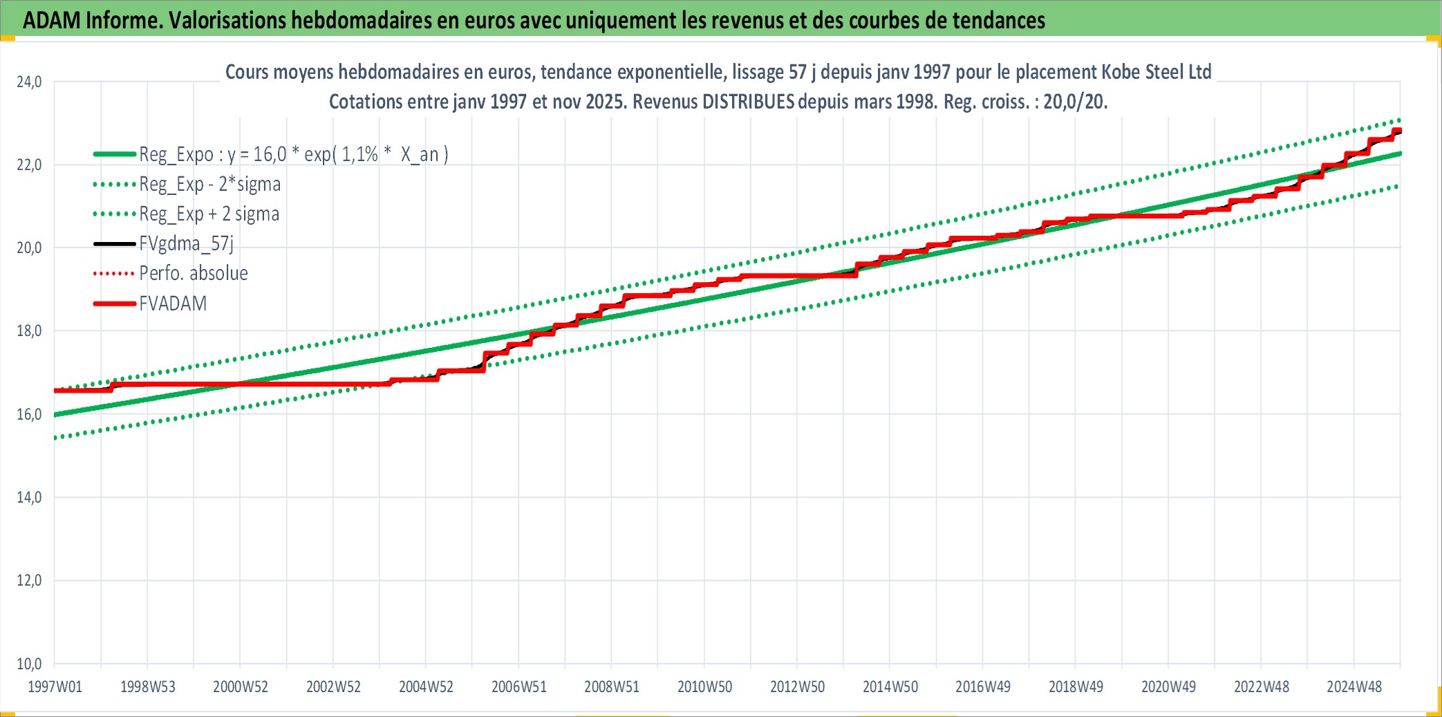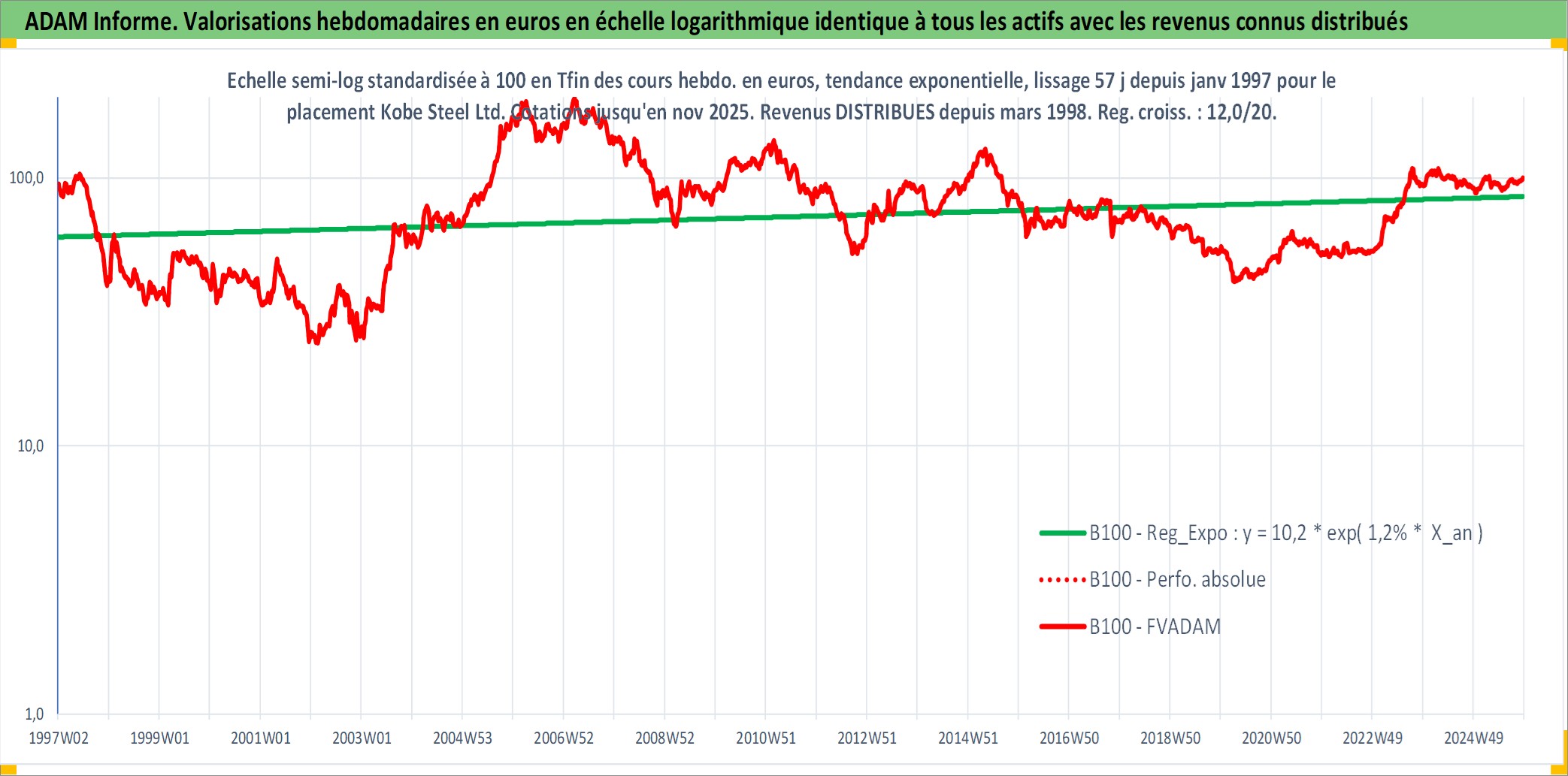 Site dédié aux investisseursPage dédiée sur site financeAnalyse des valorisations hebdomadaires de l'action Kobe Steel Ltd. Cet actif est cote en JPY. Les valorisations sont en contrevaleur EURO et couvrent les semaines 1997W01 a 2025W48. Les revenus de cet actif financier sont pris en compte depuis la semaine 1998W13. La note ESG de cet actif n'est pas connue.
