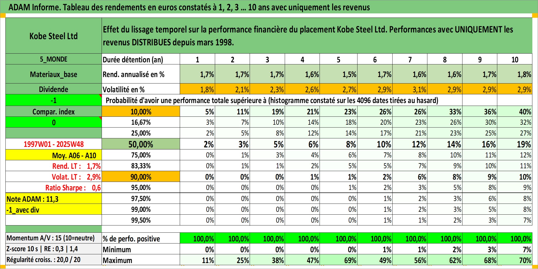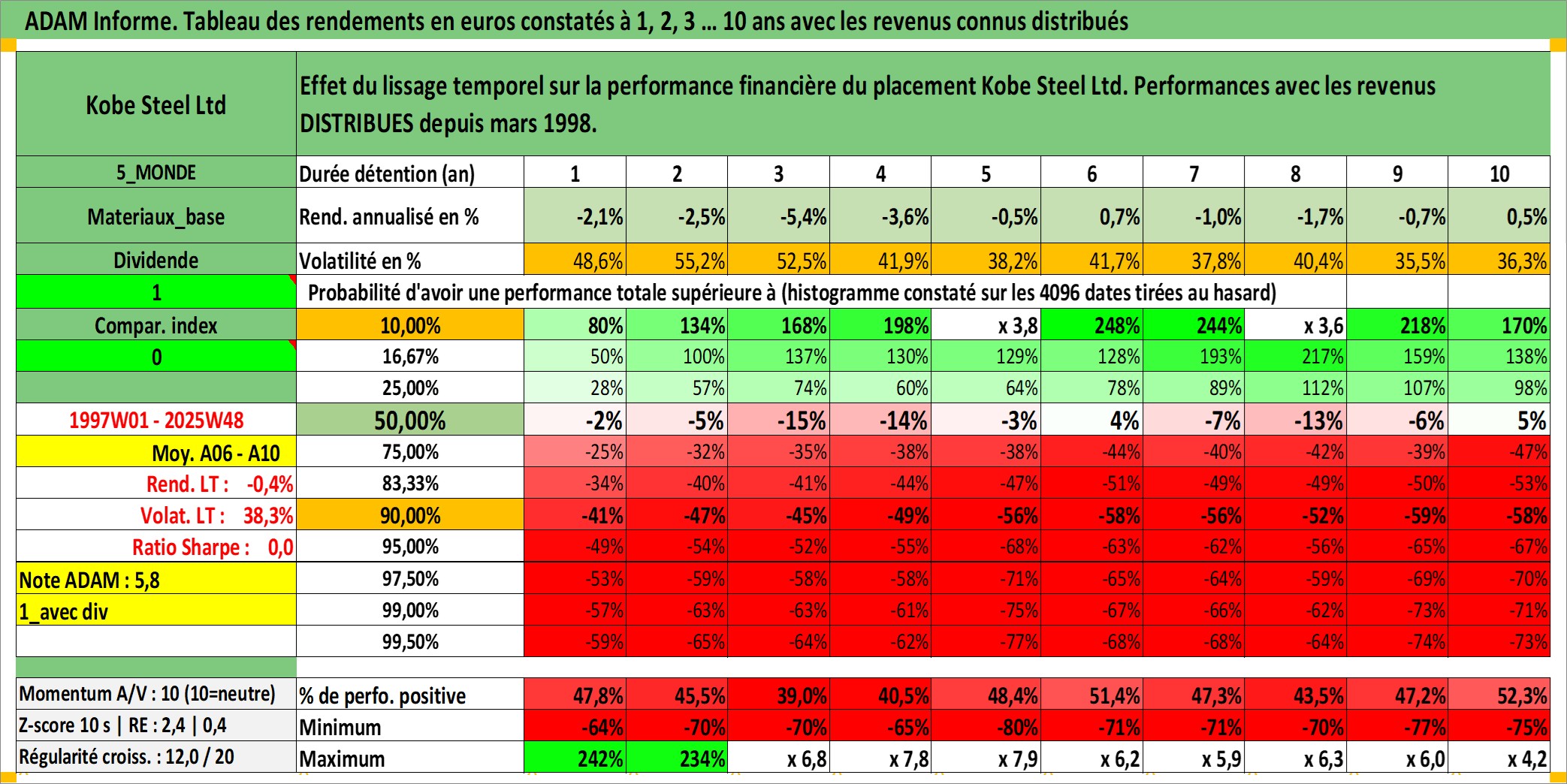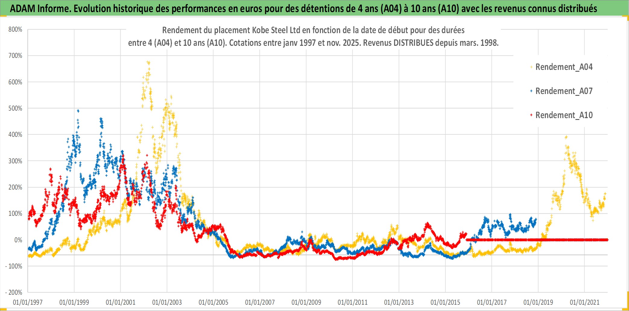 Site dédié aux investisseursPage dédiée sur site financeAnalyse des valorisations hebdomadaires de l'action Kobe Steel Ltd. Cet actif est cote en JPY. Les valorisations sont en contrevaleur EURO et couvrent les semaines 1997W01 a 2025W48. Les revenus de cet actif financier sont pris en compte depuis la semaine 1998W13. La note ESG de cet actif n'est pas connue.