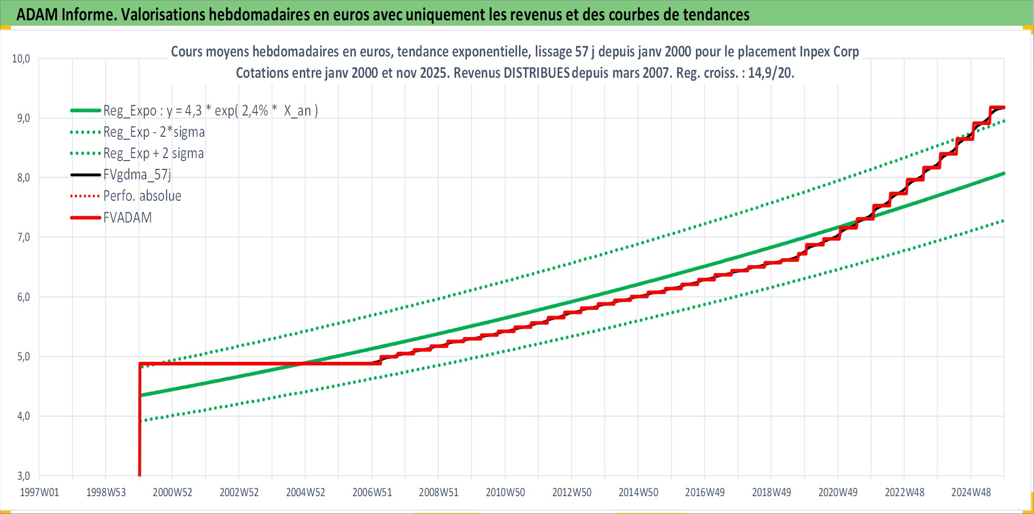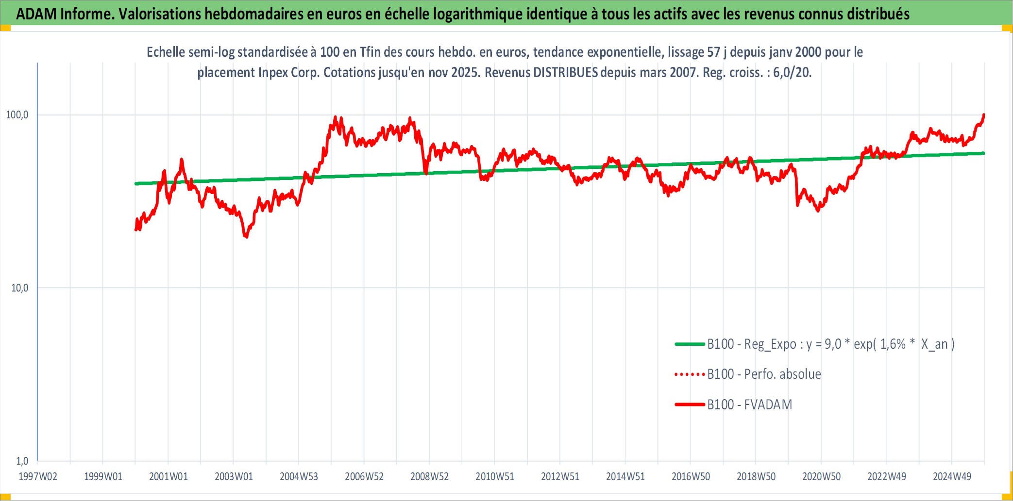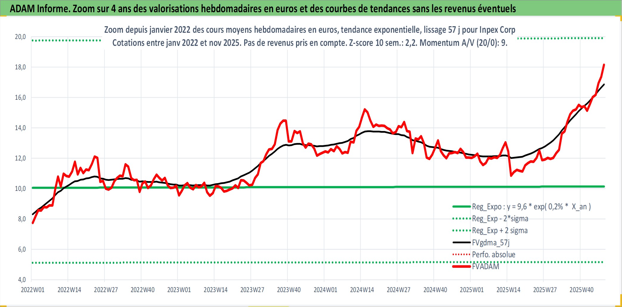 Site dédié aux investisseursPage dédiée sur site financeAnalyse des valorisations hebdomadaires de l'action Inpex Corp. Cet actif est cote en JPY. Les valorisations sont en contrevaleur EURO et couvrent les semaines 2000W01 a 2025W48. Les revenus de cet actif financier sont pris en compte depuis la semaine 2007W13. La note globale ESG de cet actif est estimee a 3.0 (apres rebasage entre 0 et 20).