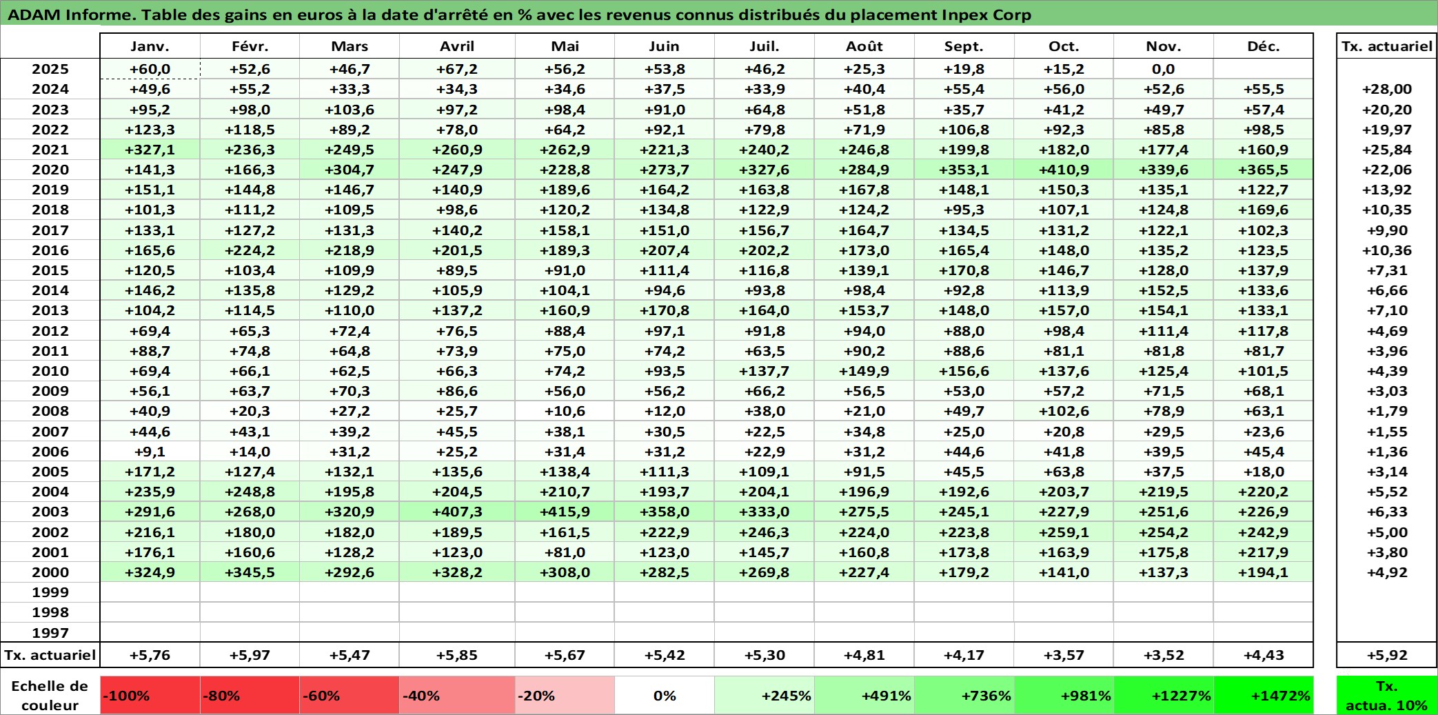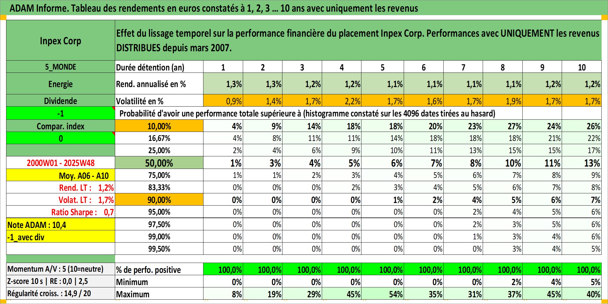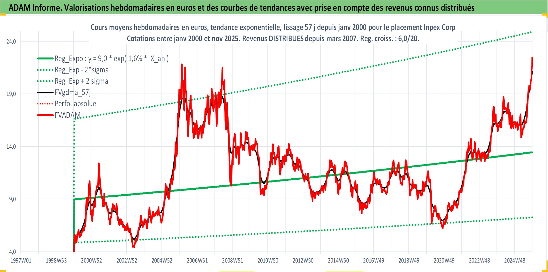 Site dédié aux investisseursPage dédiée sur site financeAnalyse des valorisations hebdomadaires de l'action Inpex Corp. Cet actif est cote en JPY. Les valorisations sont en contrevaleur EURO et couvrent les semaines 2000W01 a 2025W48. Les revenus de cet actif financier sont pris en compte depuis la semaine 2007W13. La note globale ESG de cet actif est estimee a 3.0 (apres rebasage entre 0 et 20).