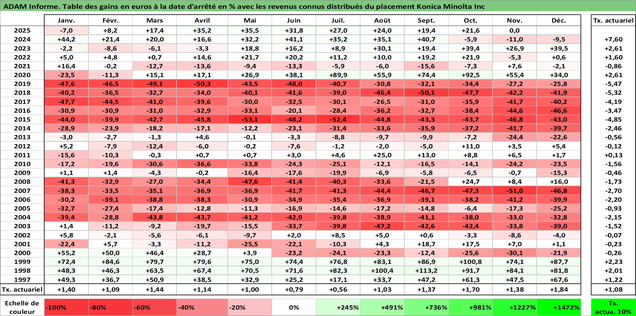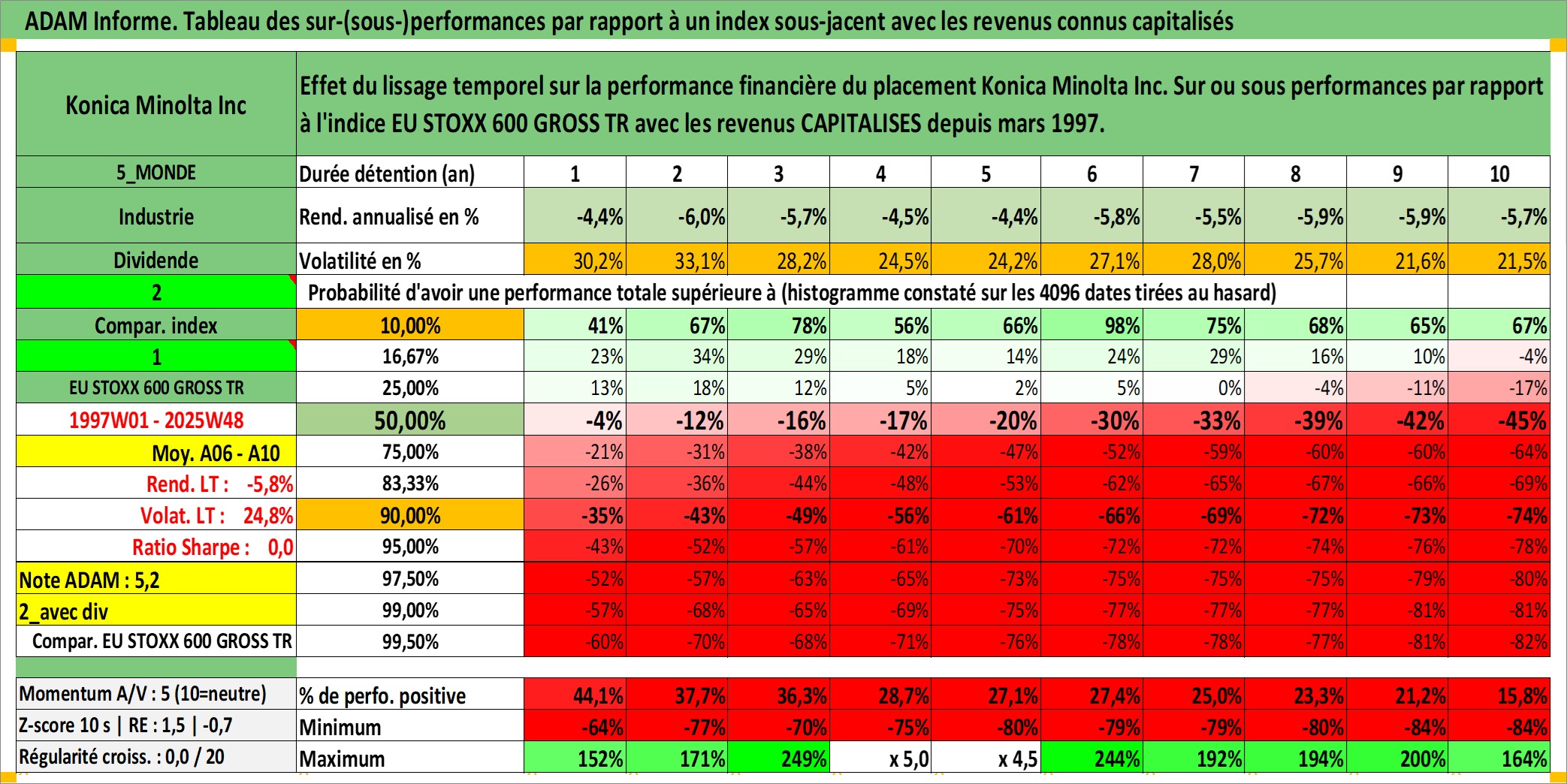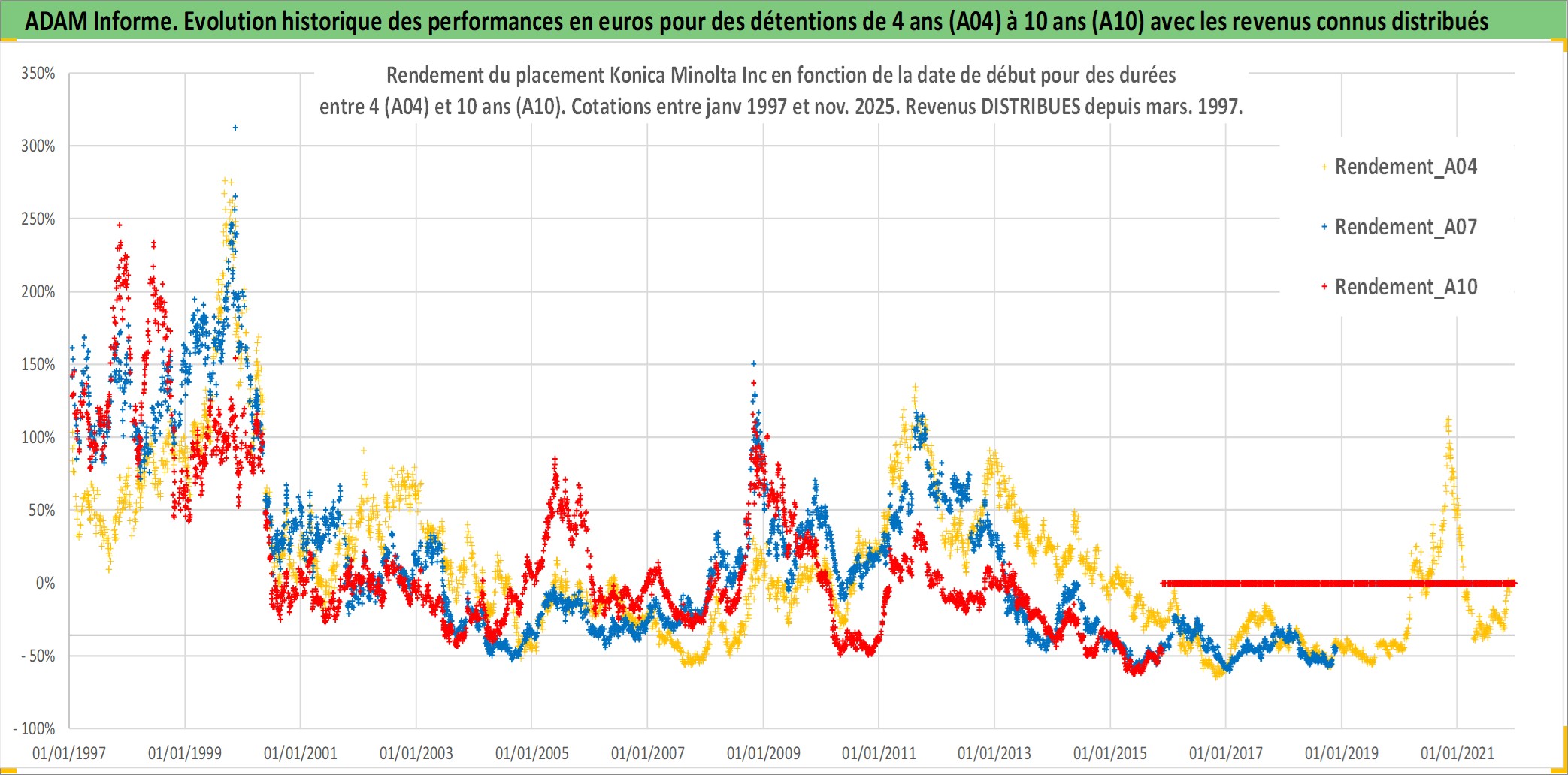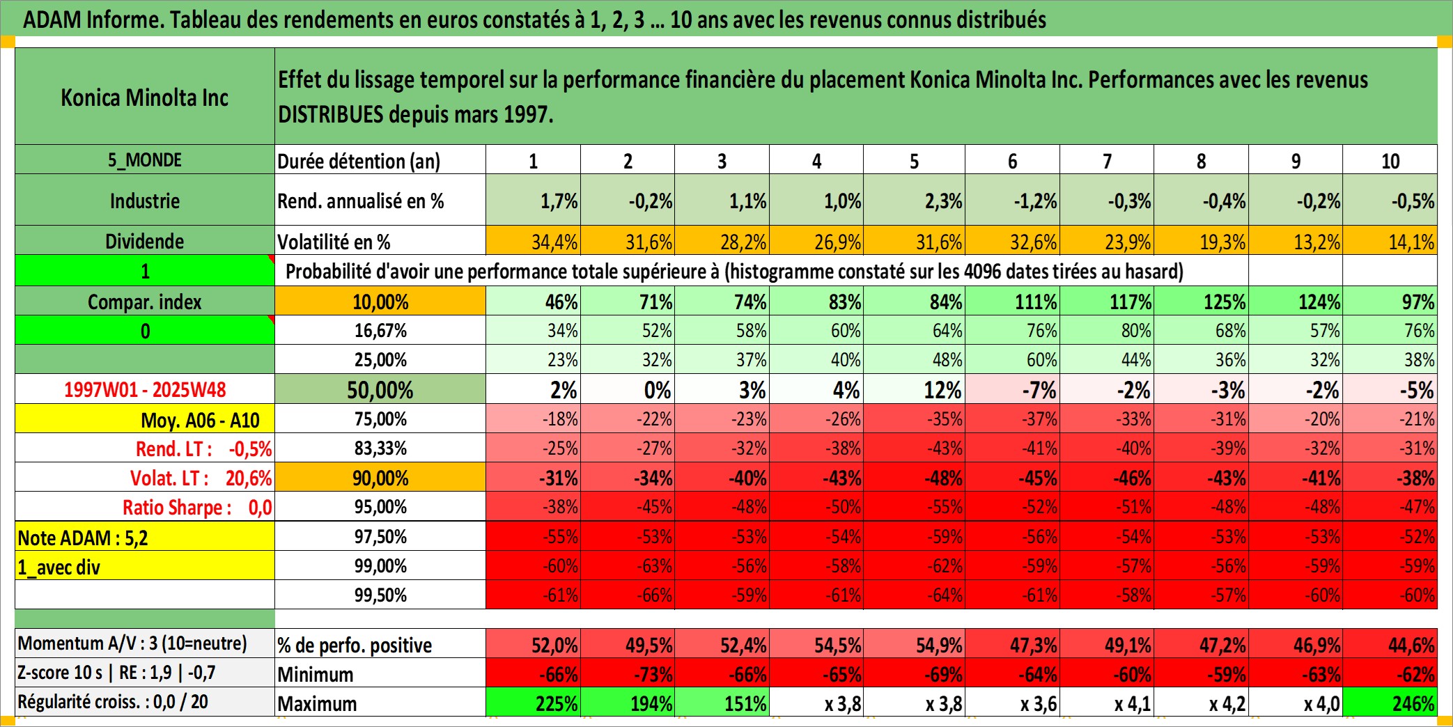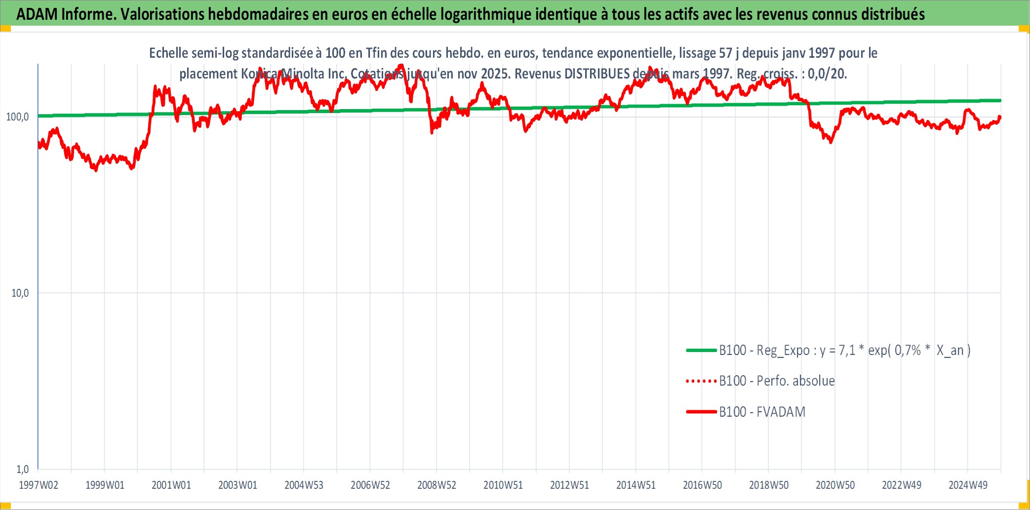Site dédié aux investisseursPage dédiée sur site financeAnalyse des valorisations hebdomadaires de l'action Konica Minolta Inc. Cet actif est cote en JPY. Les valorisations sont en contrevaleur EURO et couvrent les semaines 1997W01 a 2025W48. Les revenus de cet actif financier sont pris en compte depuis la semaine 1997W13. La note ESG de cet actif n'est pas connue.