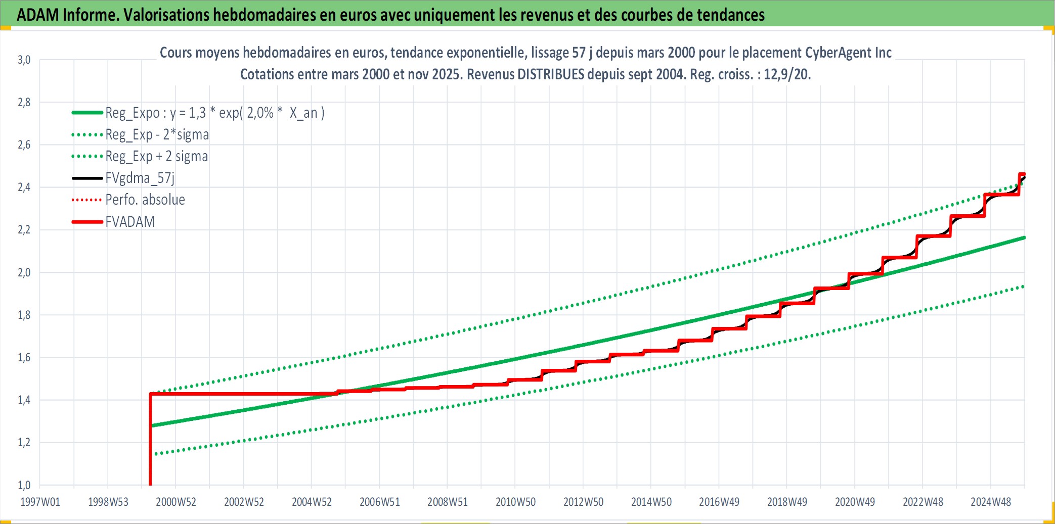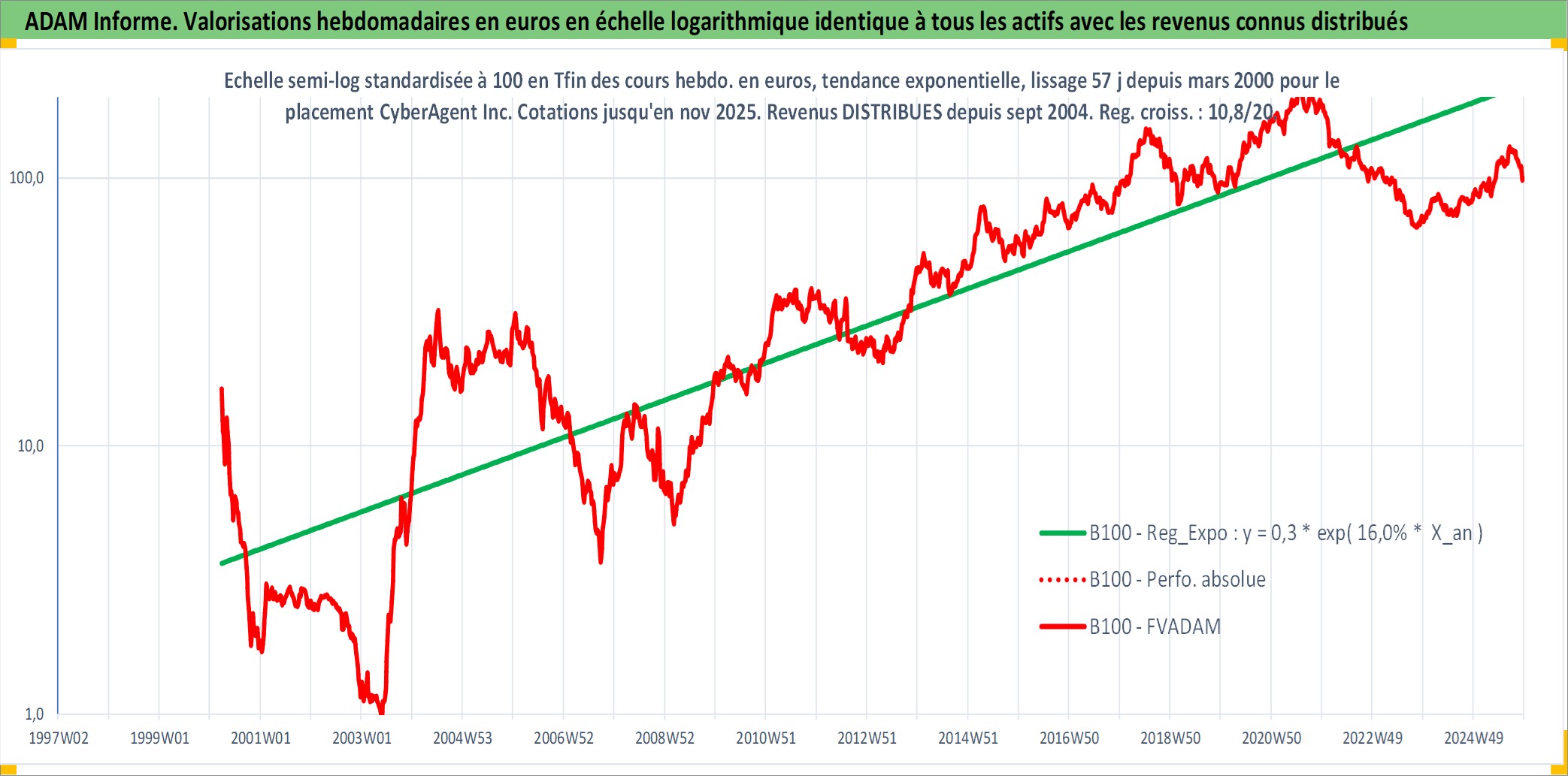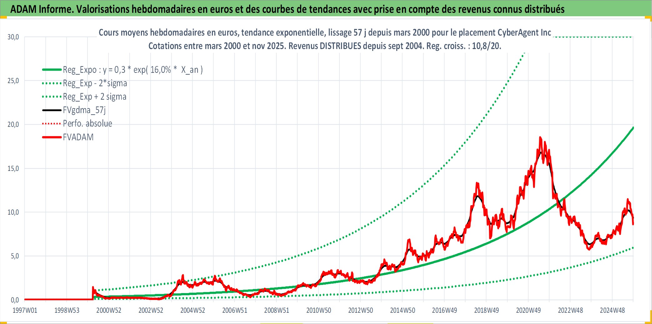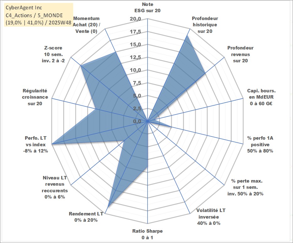Site dédié aux investisseursPage dédiée sur site financeAnalyse des valorisations hebdomadaires de l'action CyberAgent Inc. Cet actif est cote en JPY. Les valorisations sont en contrevaleur EURO et couvrent les semaines 2000W13 a 2025W48. Les revenus de cet actif financier sont pris en compte depuis la semaine 2004W40. La note ESG de cet actif n'est pas connue.