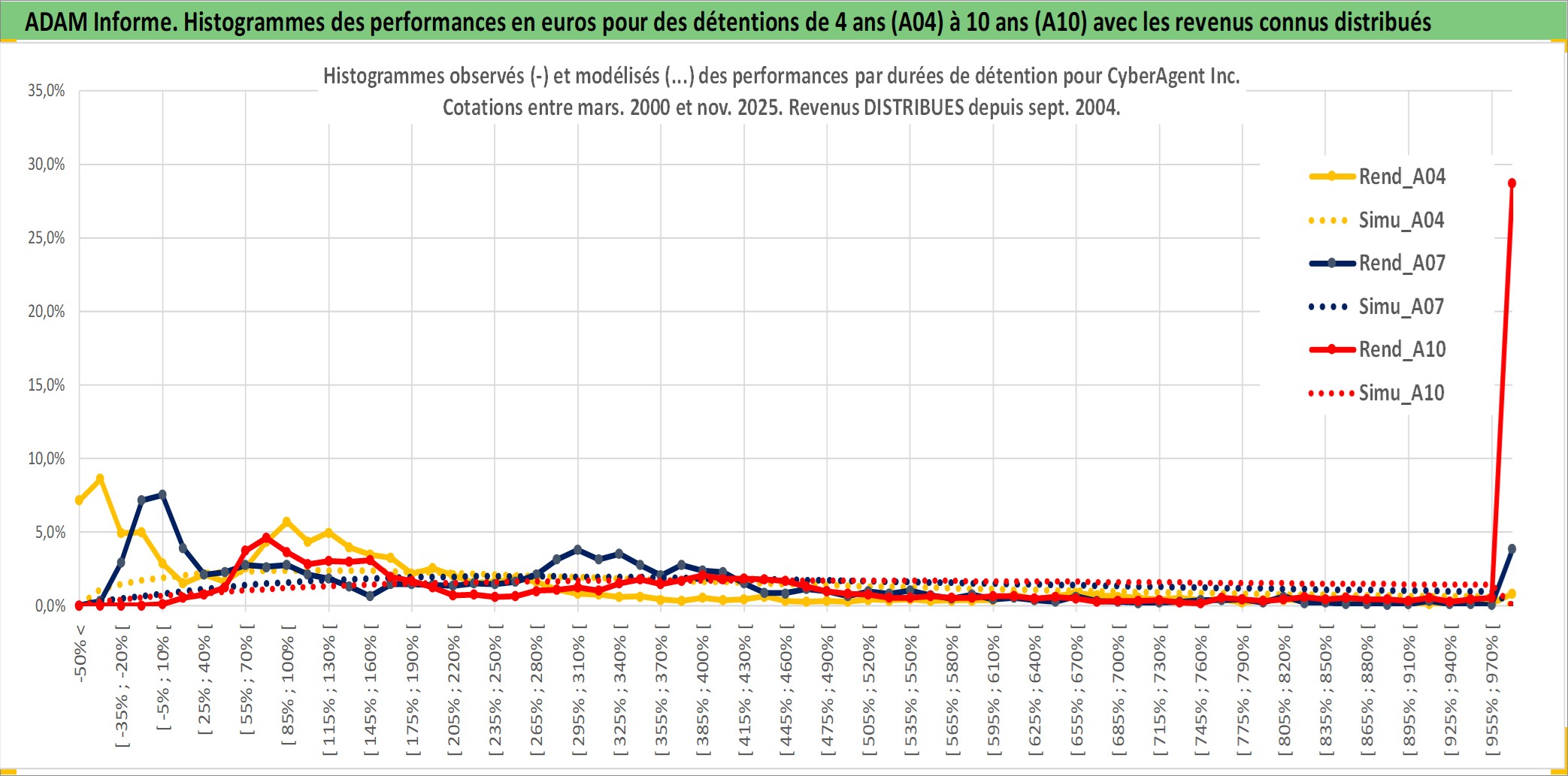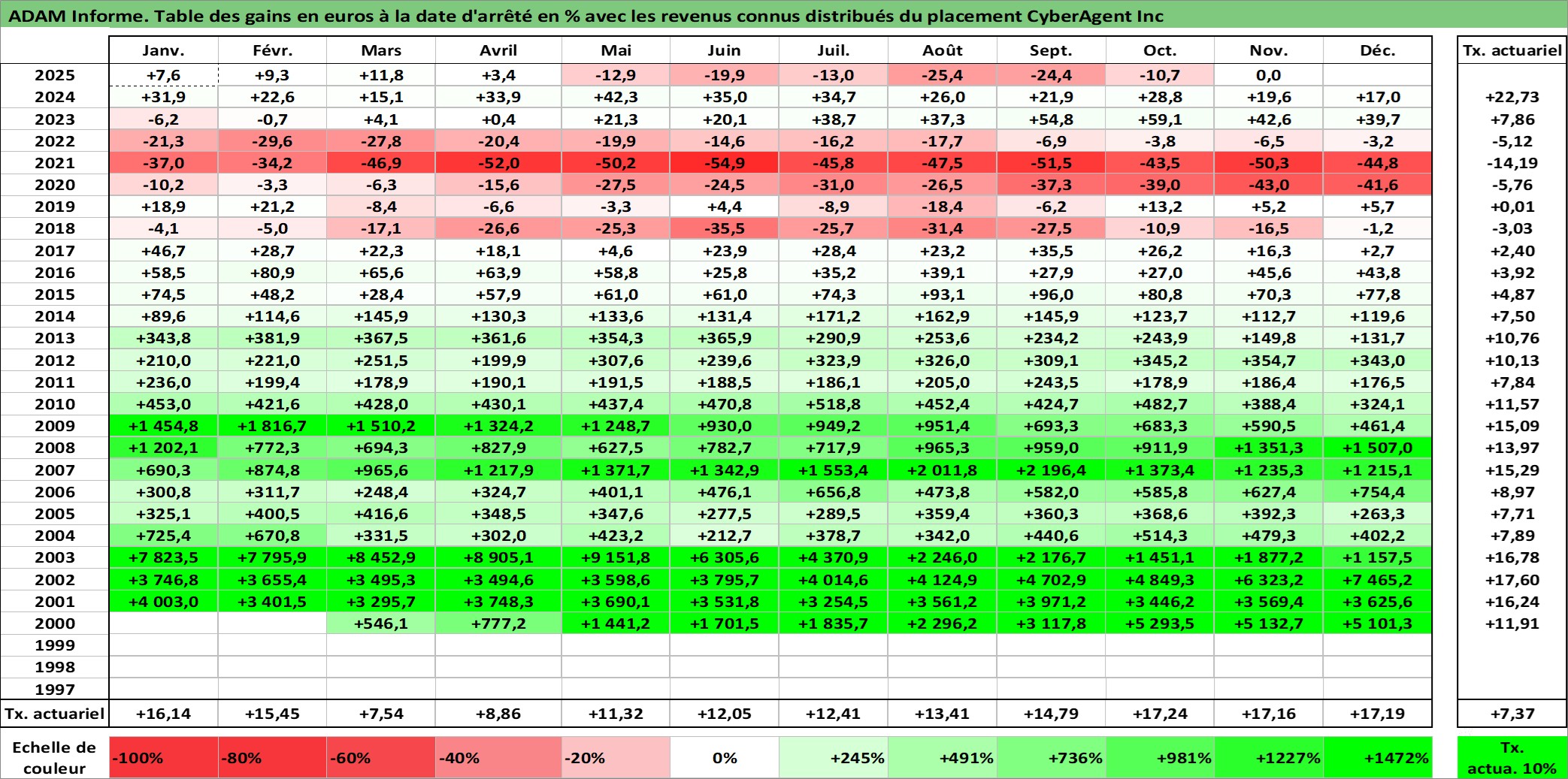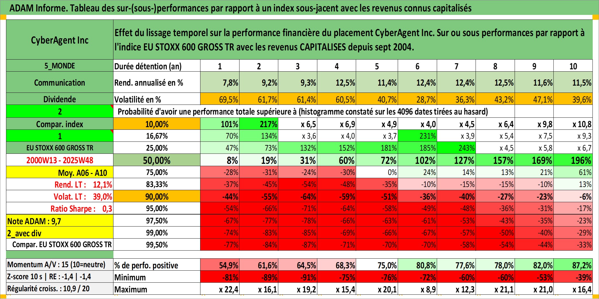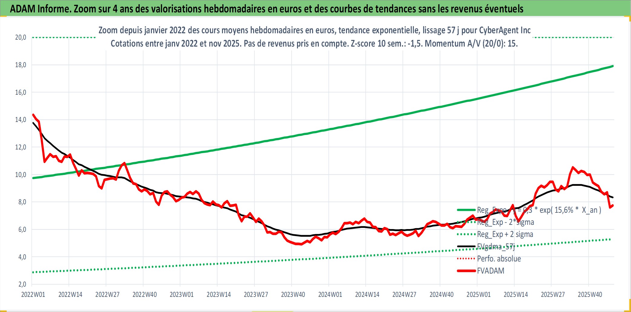 Site dédié aux investisseursPage dédiée sur site financeAnalyse des valorisations hebdomadaires de l'action CyberAgent Inc. Cet actif est cote en JPY. Les valorisations sont en contrevaleur EURO et couvrent les semaines 2000W13 a 2025W48. Les revenus de cet actif financier sont pris en compte depuis la semaine 2004W40. La note ESG de cet actif n'est pas connue.