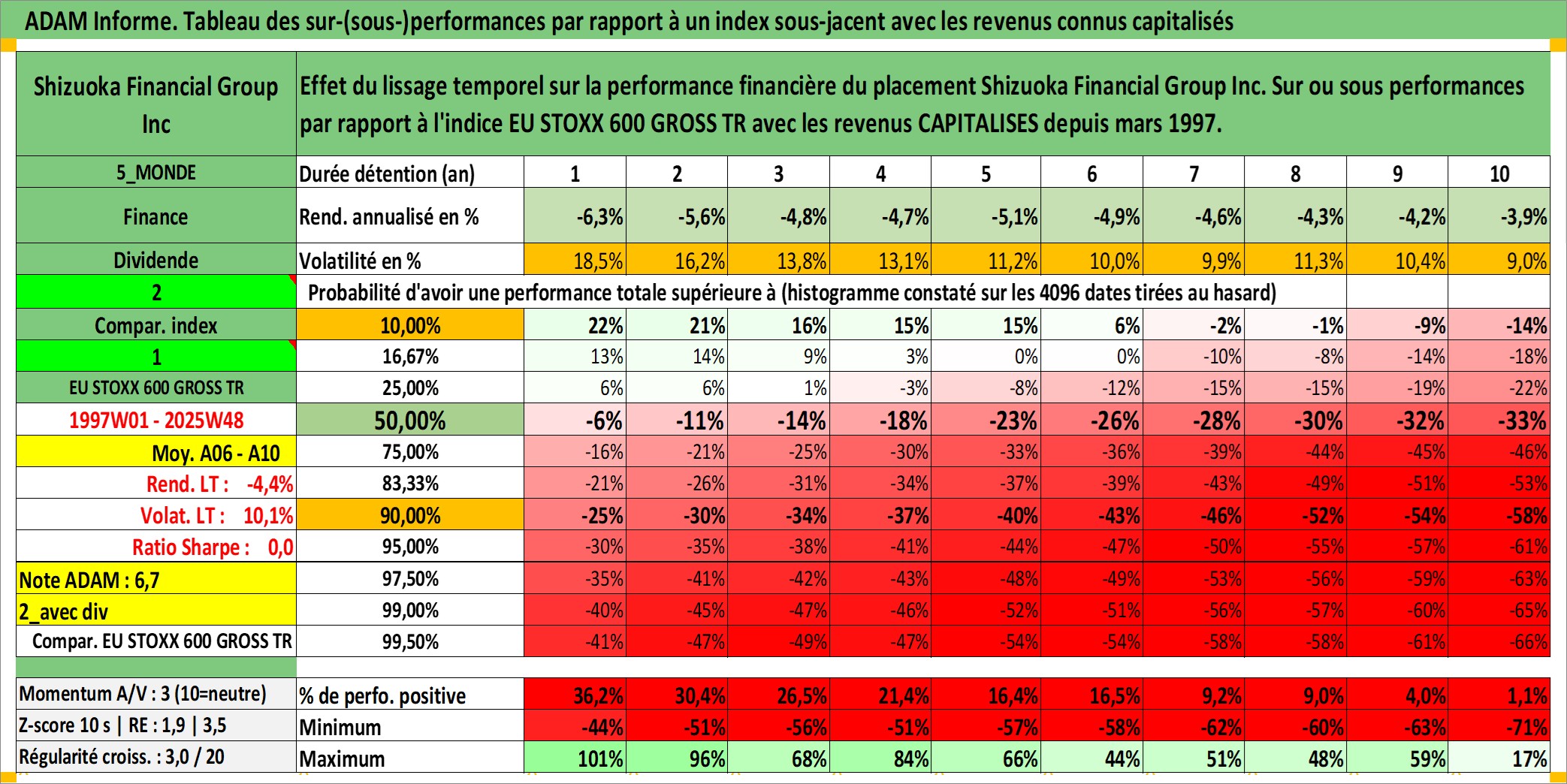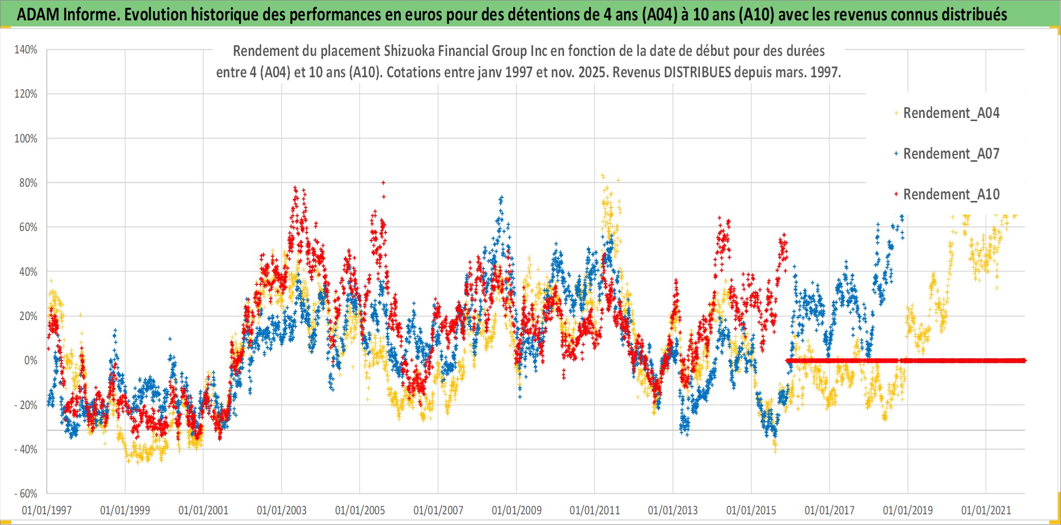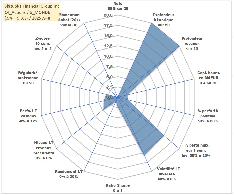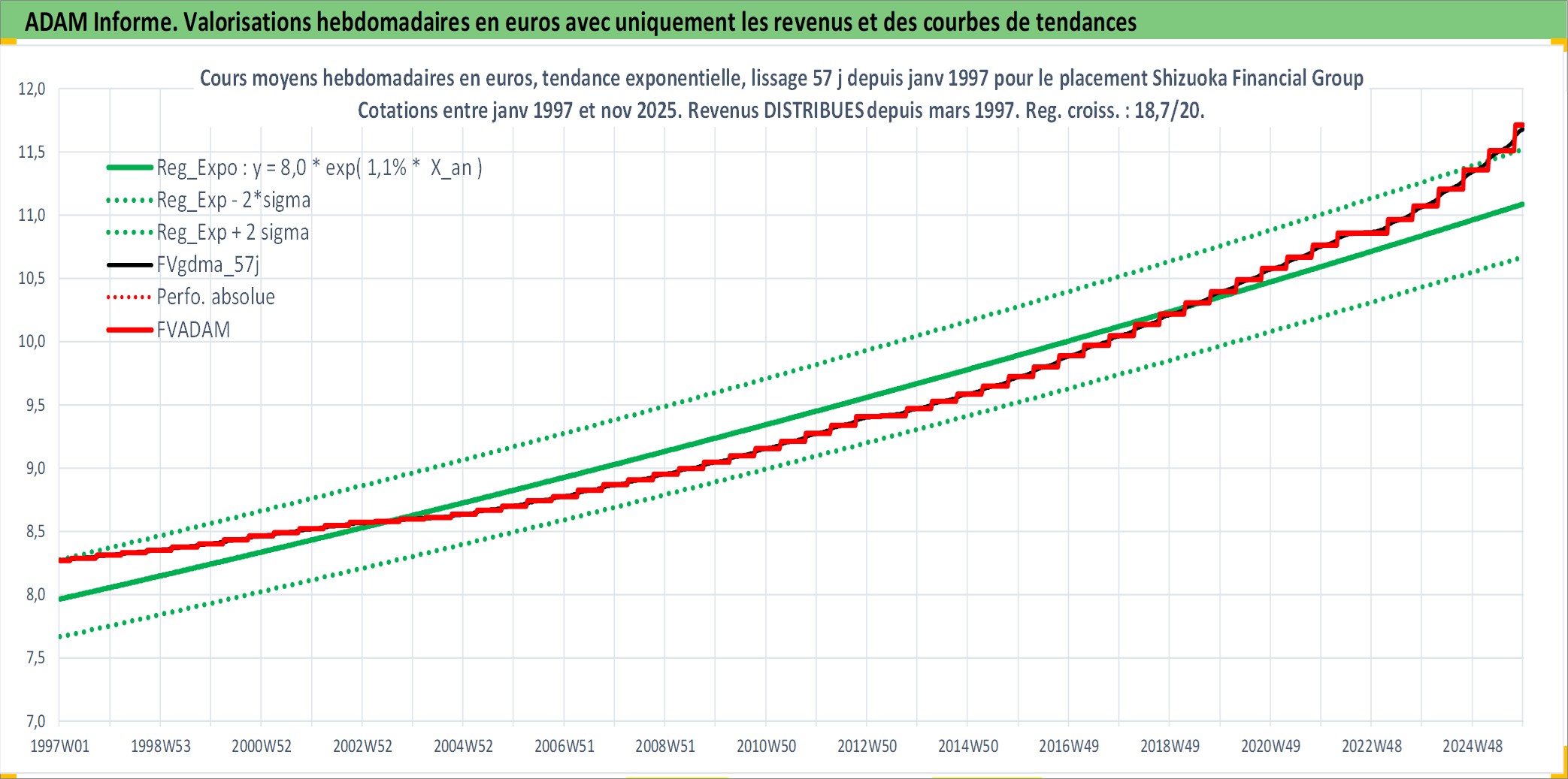 Site dédié aux investisseursPage dédiée sur site financeAnalyse des valorisations hebdomadaires de l'action Shizuoka Financial Group Inc. Cet actif est cote en JPY. Les valorisations sont en contrevaleur EURO et couvrent les semaines 1997W01 a 2025W48. Les revenus de cet actif financier sont pris en compte depuis la semaine 1997W13. La note ESG de cet actif n'est pas connue.