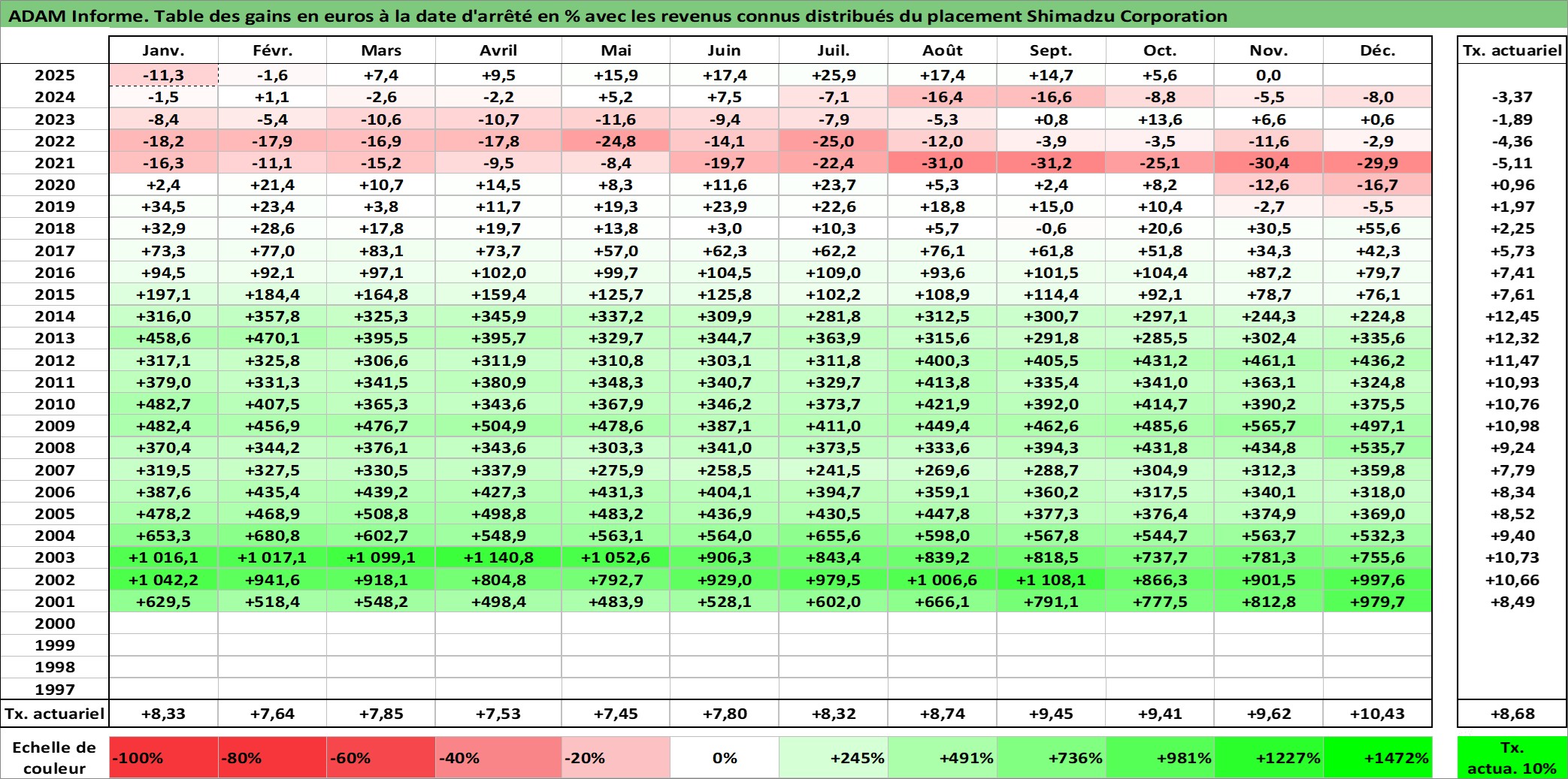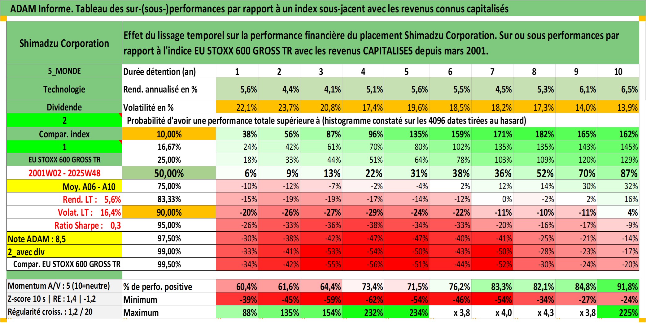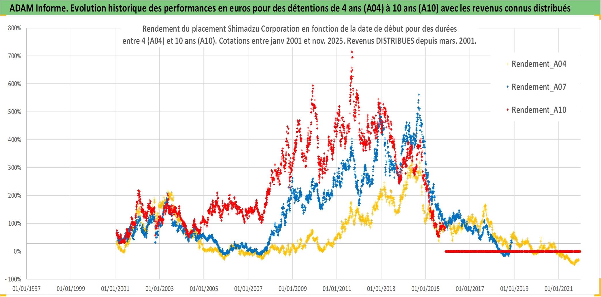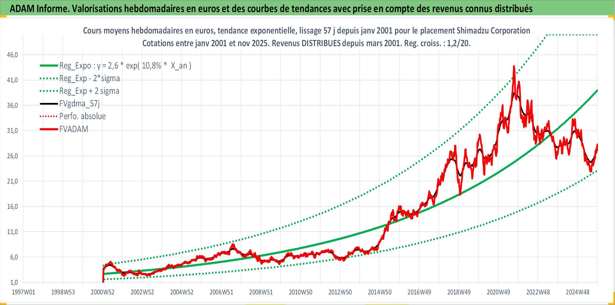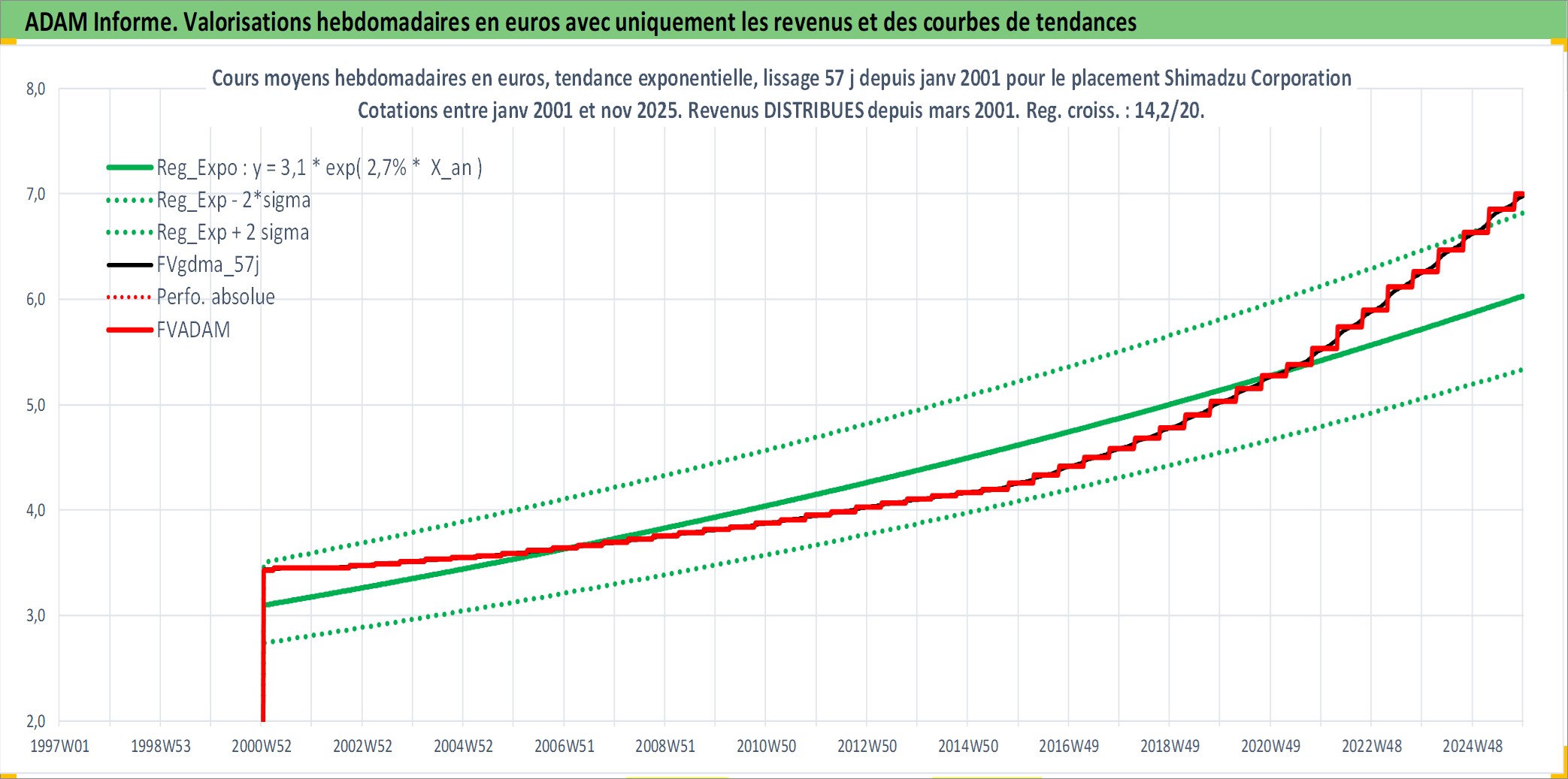 Site dédié aux investisseursPage dédiée sur site financeAnalyse des valorisations hebdomadaires de l'action Shimadzu Corporation. Cet actif est cote en JPY. Les valorisations sont en contrevaleur EURO et couvrent les semaines 2001W02 a 2025W48. Les revenus de cet actif financier sont pris en compte depuis la semaine 2001W13. La note ESG de cet actif n'est pas connue.