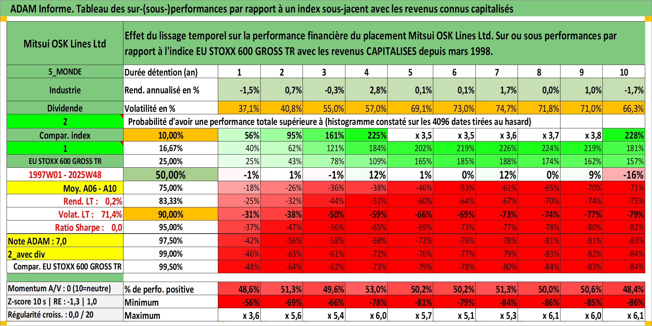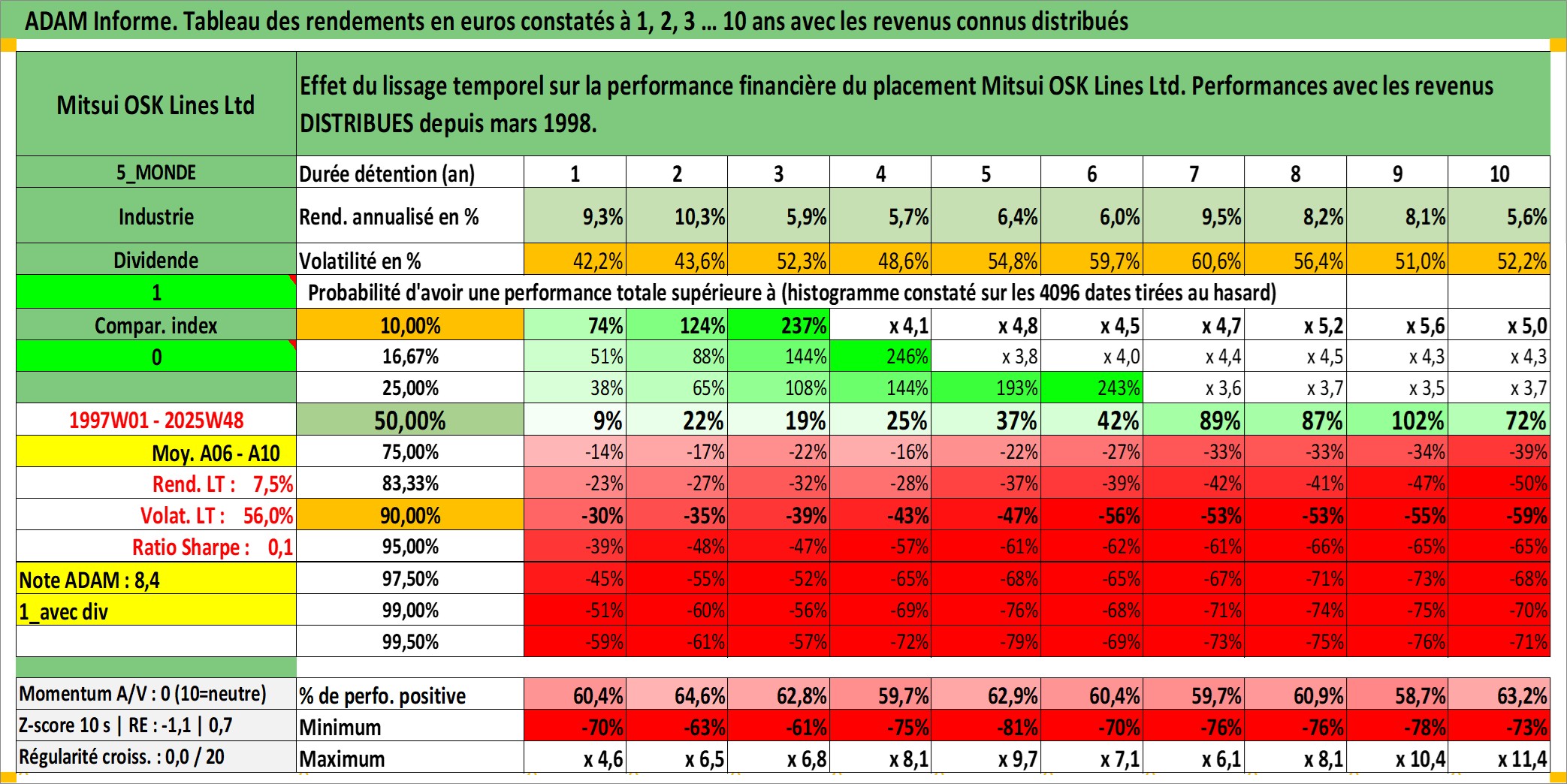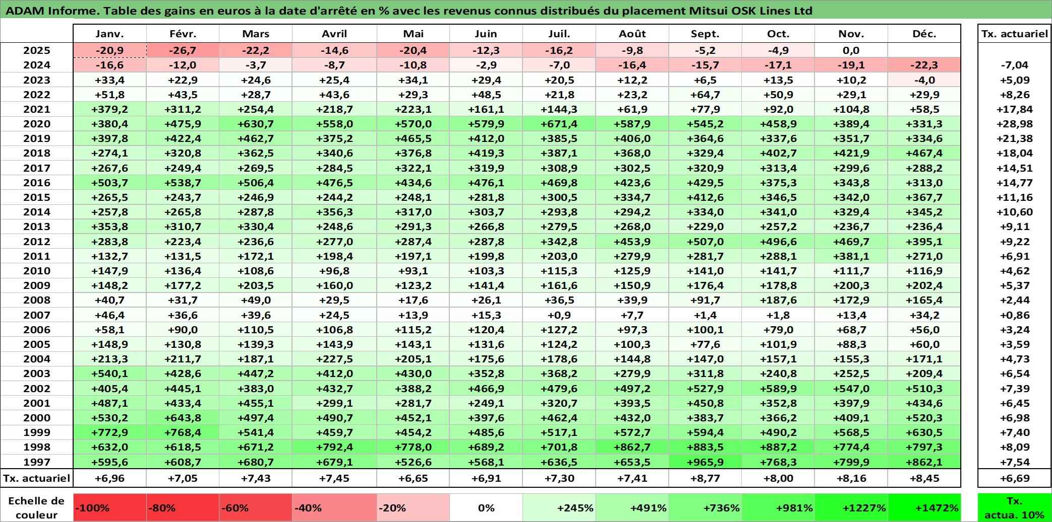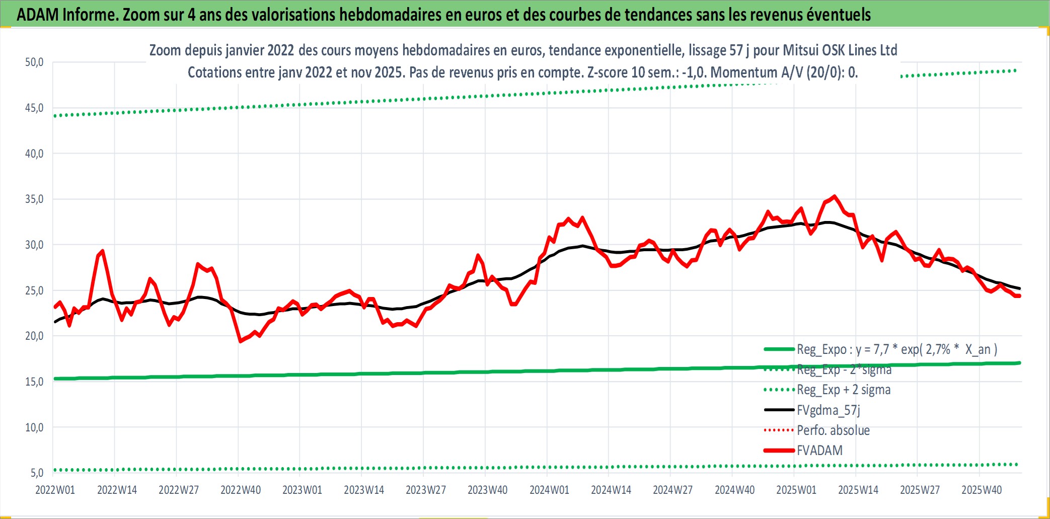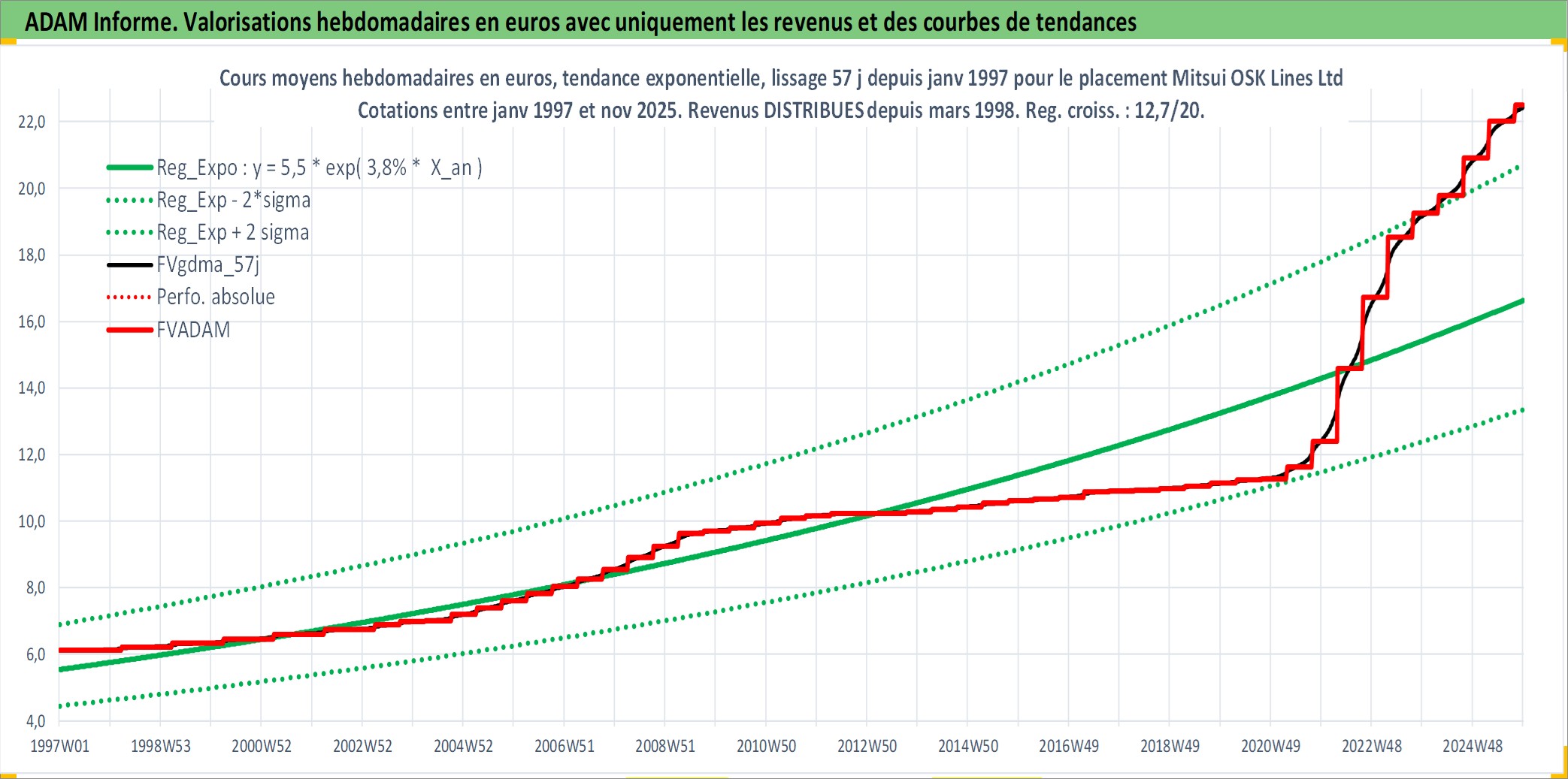 Site dédié aux investisseursPage dédiée sur site financeAnalyse des valorisations hebdomadaires de l'action Mitsui OSK Lines Ltd. Cet actif est cote en JPY. Les valorisations sont en contrevaleur EURO et couvrent les semaines 1997W01 a 2025W48. Les revenus de cet actif financier sont pris en compte depuis la semaine 1998W13. La note ESG de cet actif n'est pas connue.