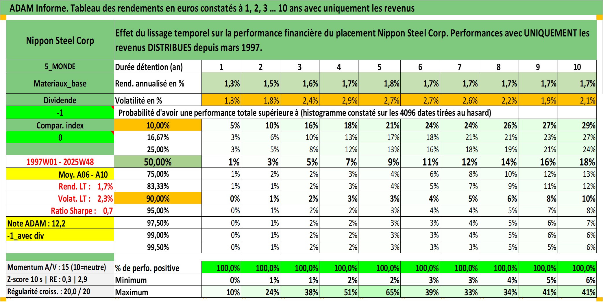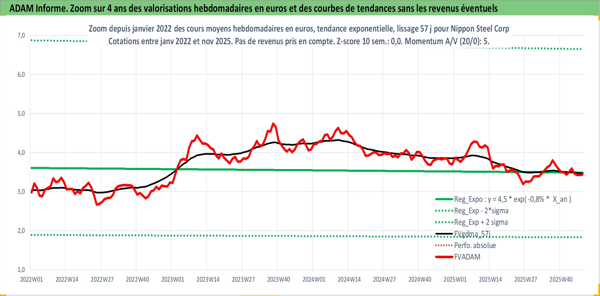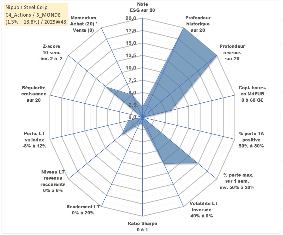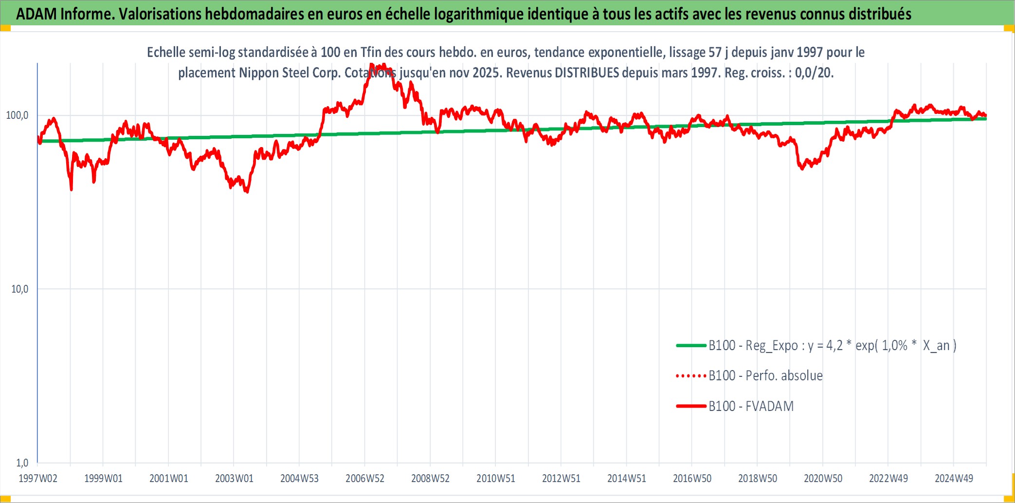 Site dédié aux investisseursPage dédiée sur site financeAnalyse des valorisations hebdomadaires de l'action Nippon Steel Corp. Cet actif est cote en JPY. Les valorisations sont en contrevaleur EURO et couvrent les semaines 1997W01 a 2025W48. Les revenus de cet actif financier sont pris en compte depuis la semaine 1997W13. La note globale ESG de cet actif est estimee a 2.0 (apres rebasage entre 0 et 20).
