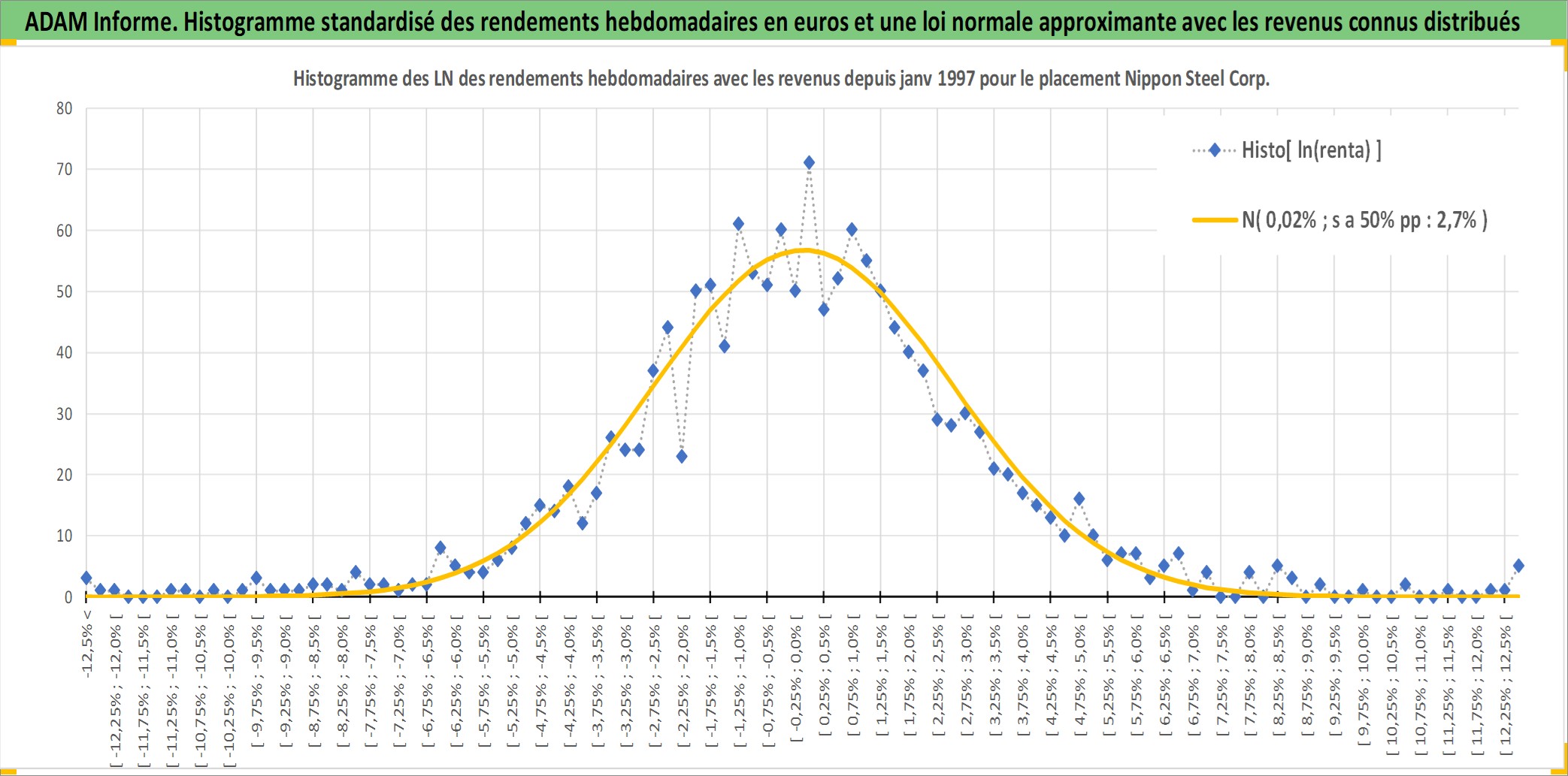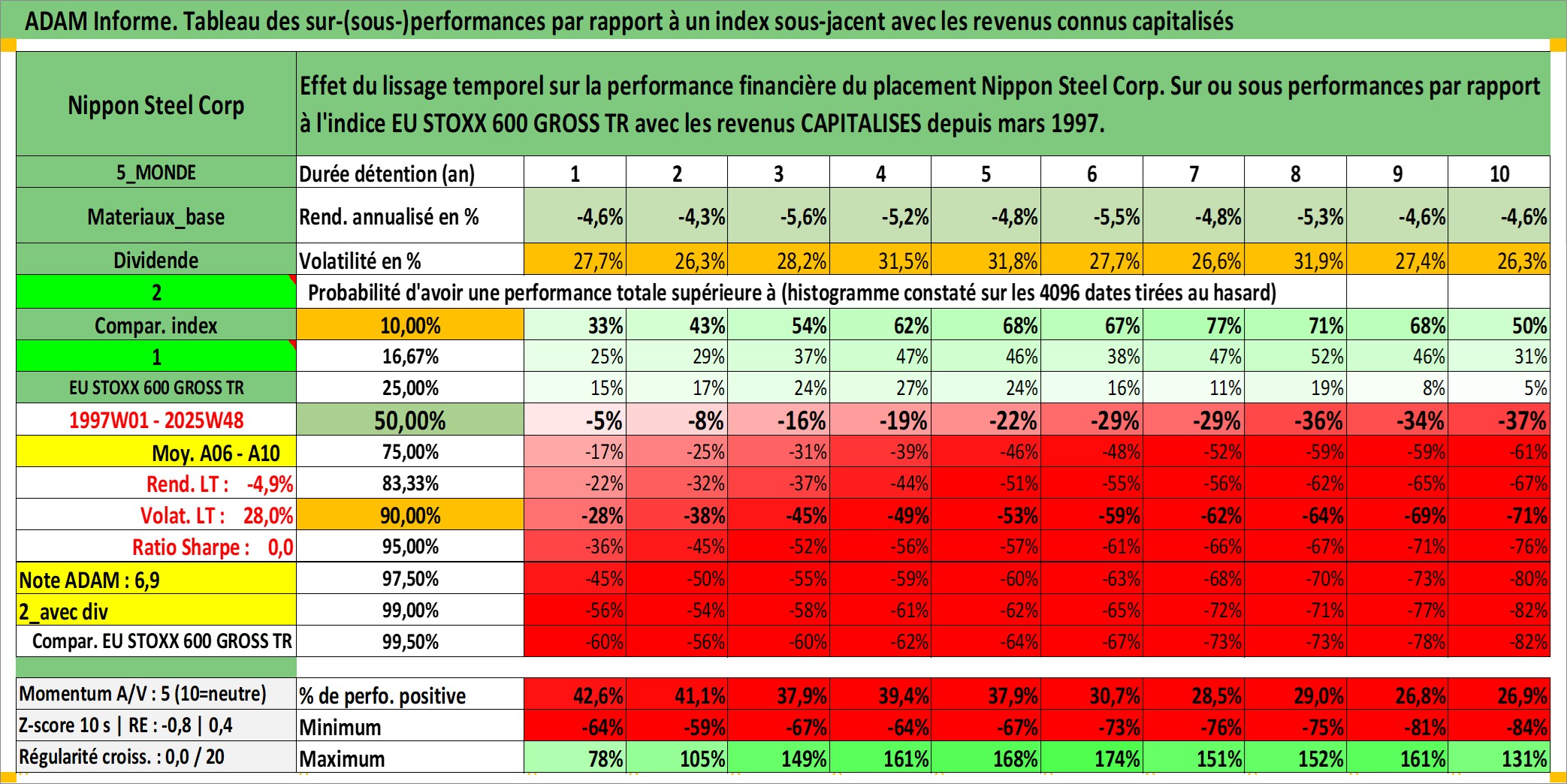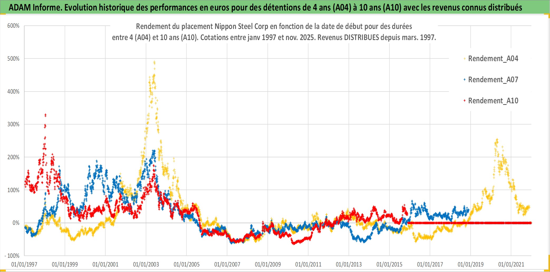 Site dédié aux investisseursPage dédiée sur site financeAnalyse des valorisations hebdomadaires de l'action Nippon Steel Corp. Cet actif est cote en JPY. Les valorisations sont en contrevaleur EURO et couvrent les semaines 1997W01 a 2025W48. Les revenus de cet actif financier sont pris en compte depuis la semaine 1997W13. La note globale ESG de cet actif est estimee a 2.0 (apres rebasage entre 0 et 20).