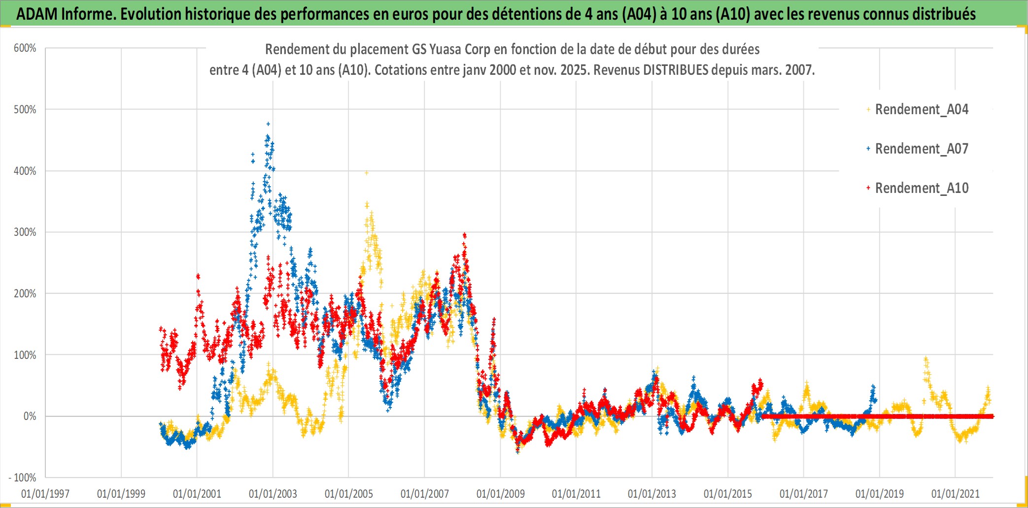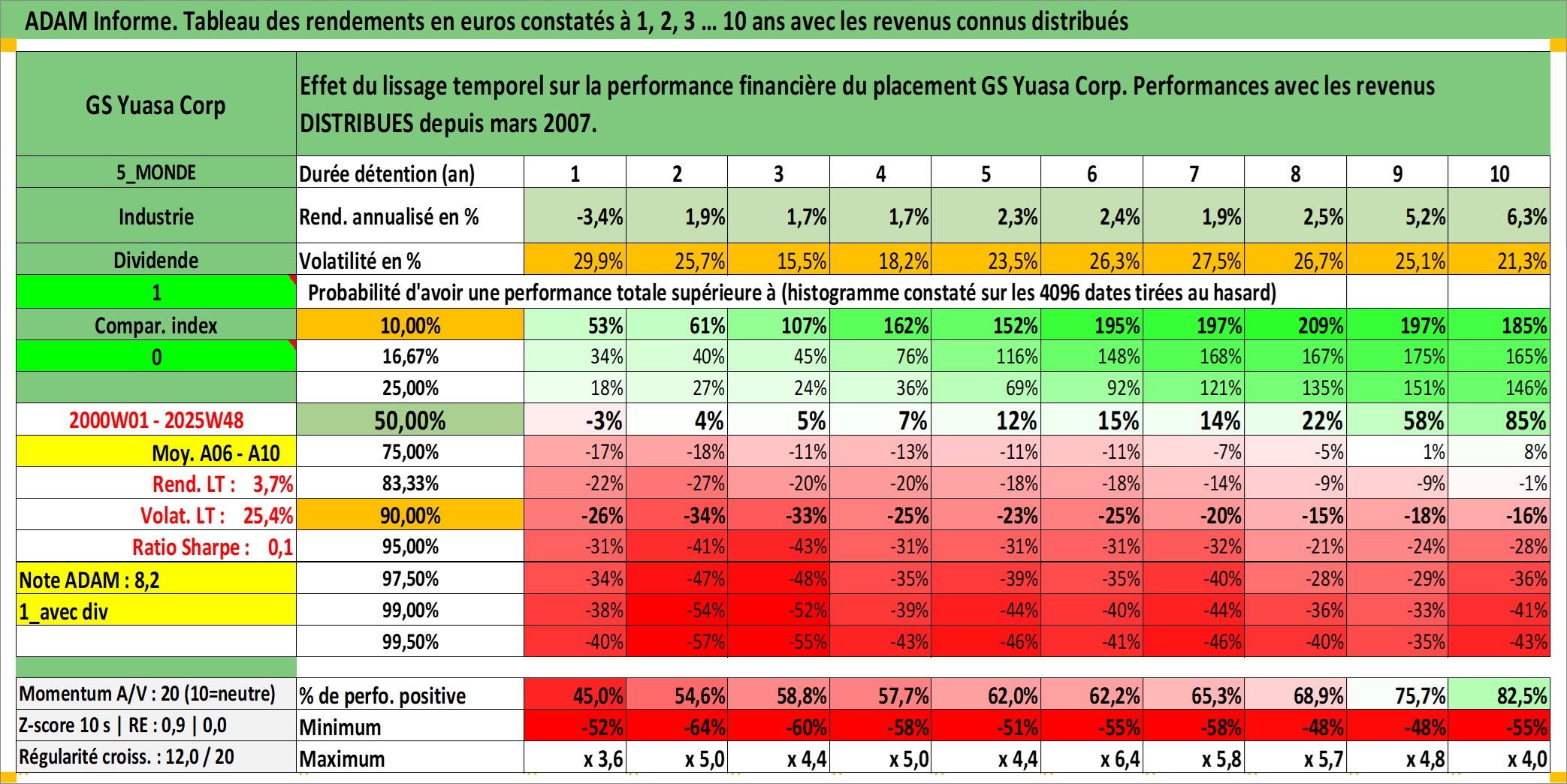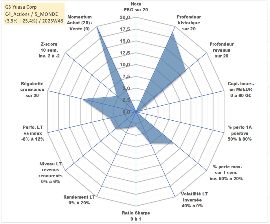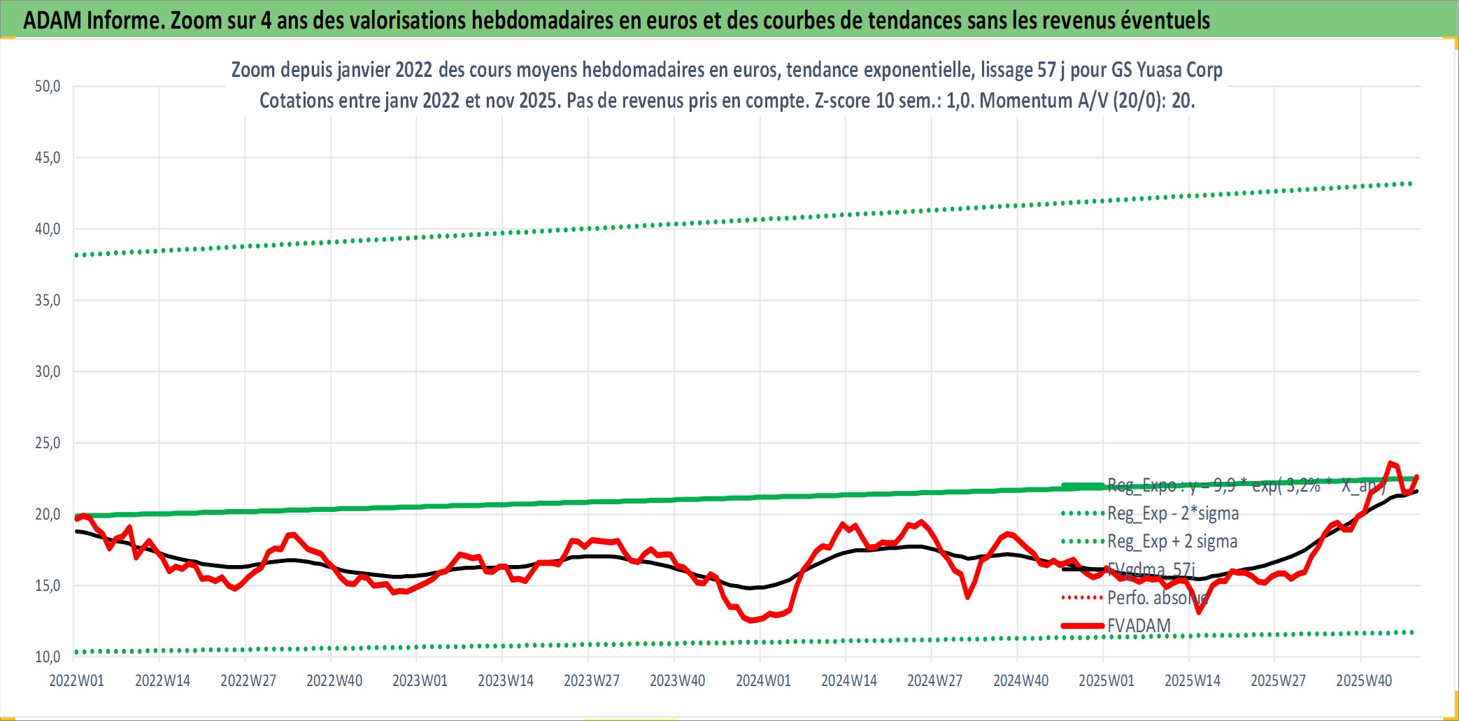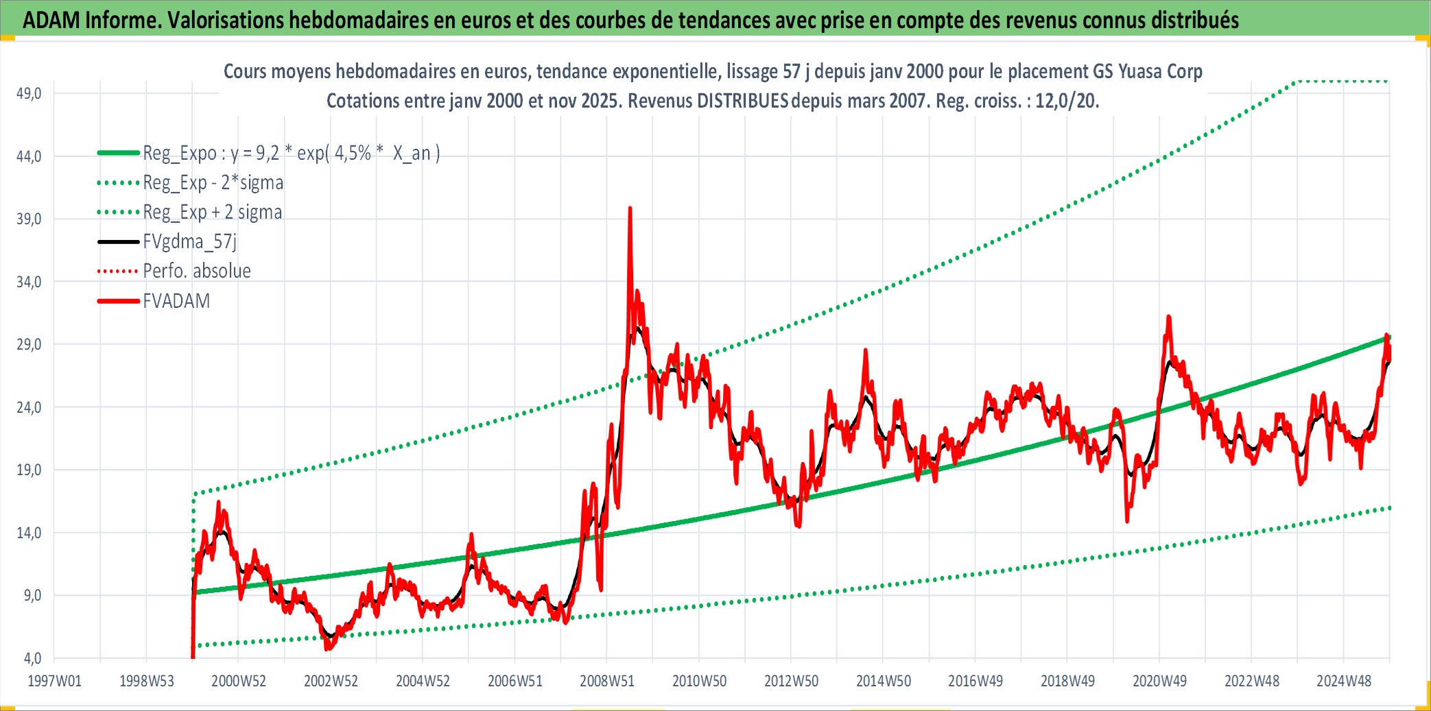 Site dédié aux investisseursPage dédiée sur site financeAnalyse des valorisations hebdomadaires de l'action GS Yuasa Corp. Cet actif est cote en JPY. Les valorisations sont en contrevaleur EURO et couvrent les semaines 2000W01 a 2025W48. Les revenus de cet actif financier sont pris en compte depuis la semaine 2007W13. La note ESG de cet actif n'est pas connue.