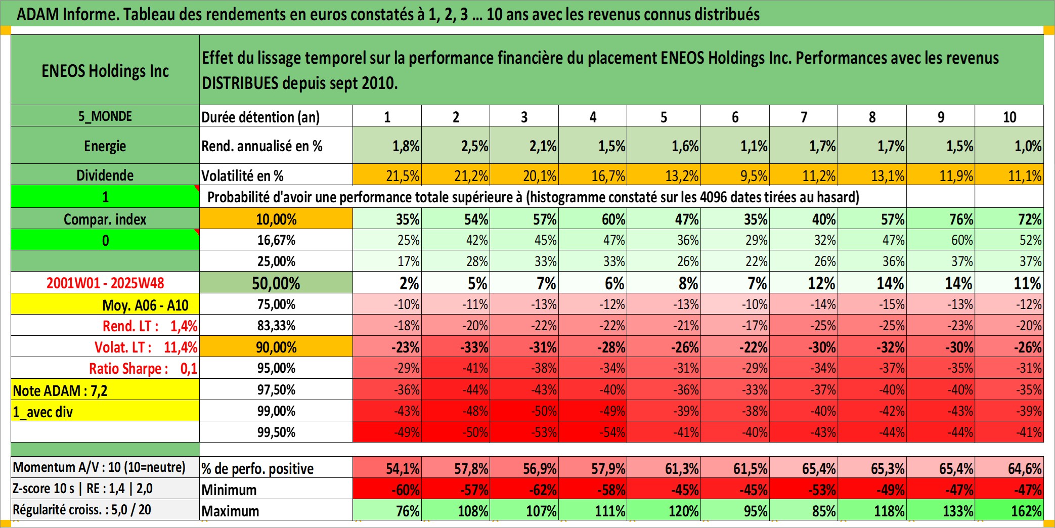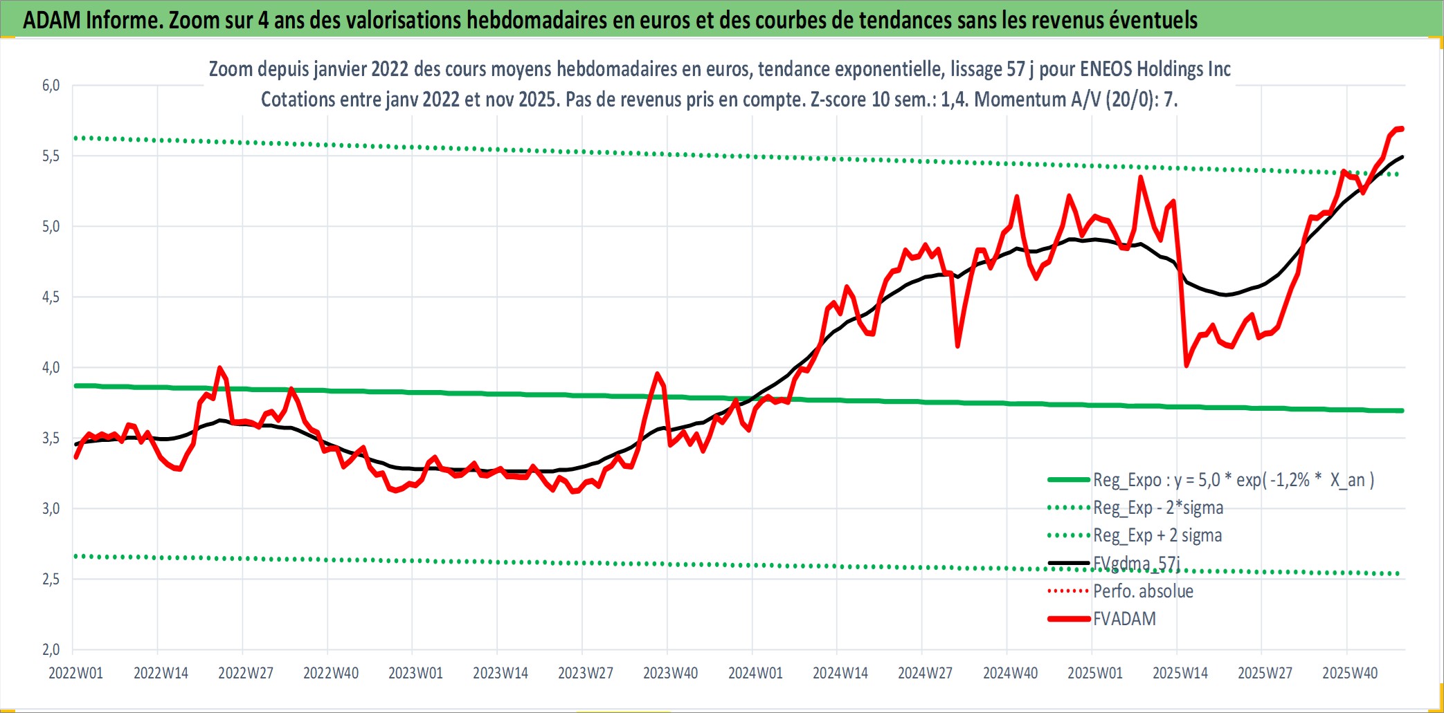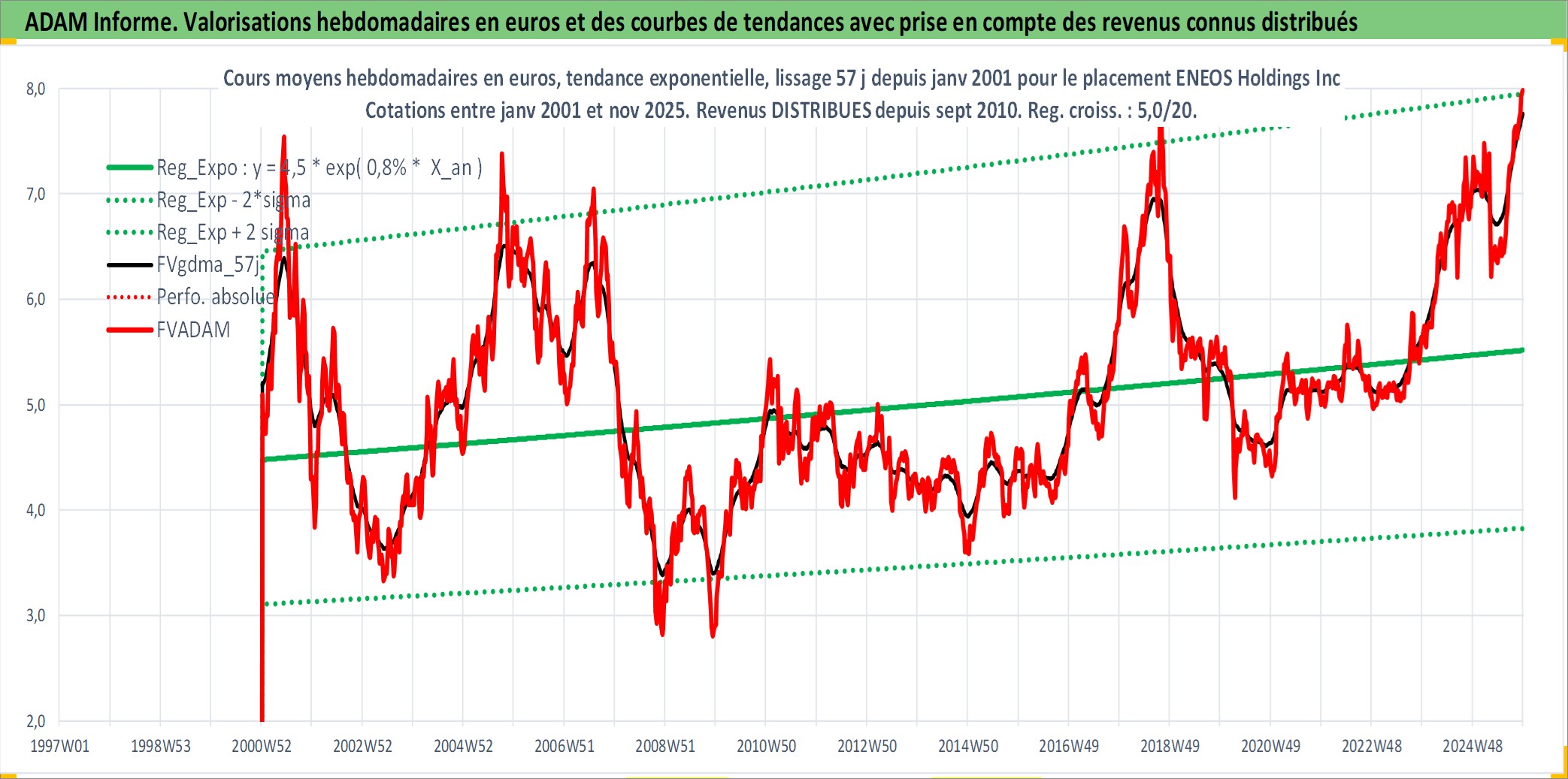Site dédié aux investisseursPage dédiée sur site financeAnalyse des valorisations hebdomadaires de l'action ENEOS Holdings Inc. Cet actif est cote en JPY. Les valorisations sont en contrevaleur EURO et couvrent les semaines 2001W01 a 2025W48. Les revenus de cet actif financier sont pris en compte depuis la semaine 2010W39. La note globale ESG de cet actif est estimee a 5.0 (apres rebasage entre 0 et 20).