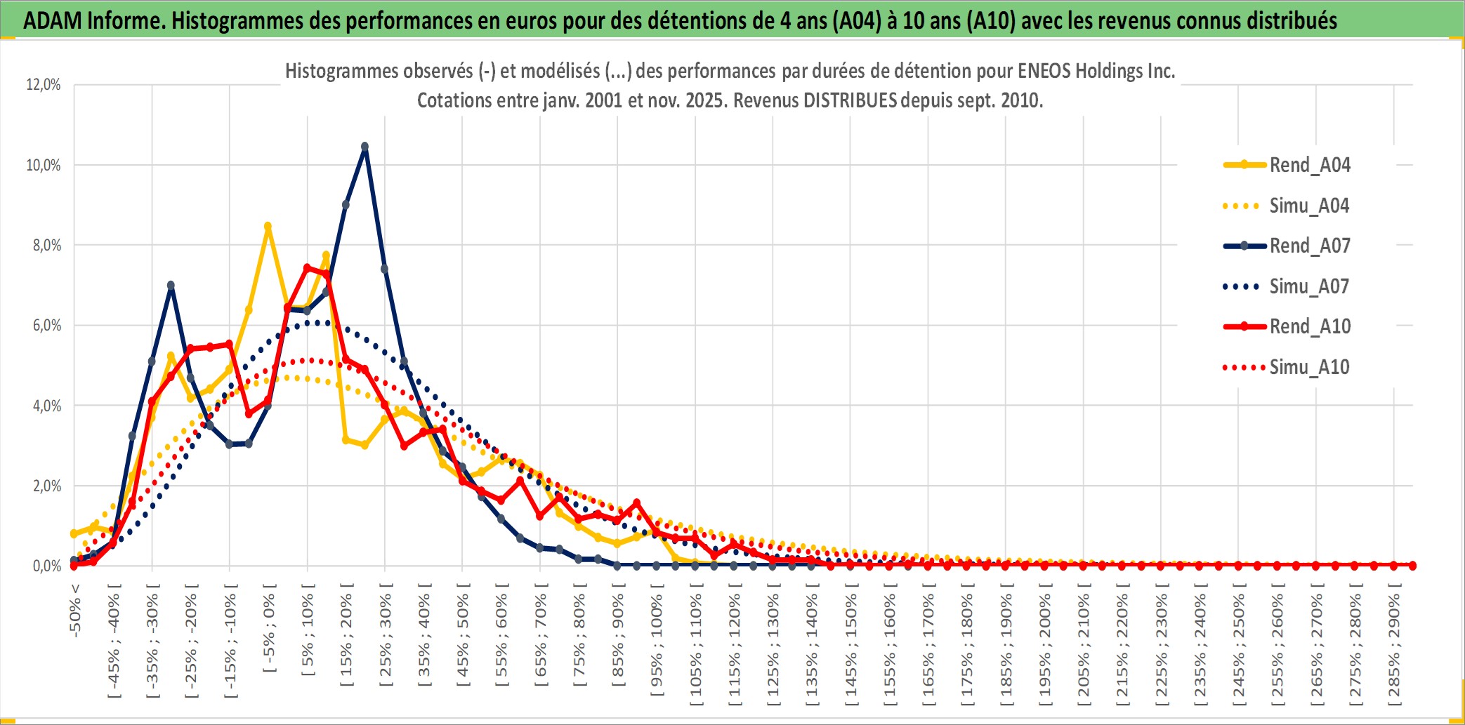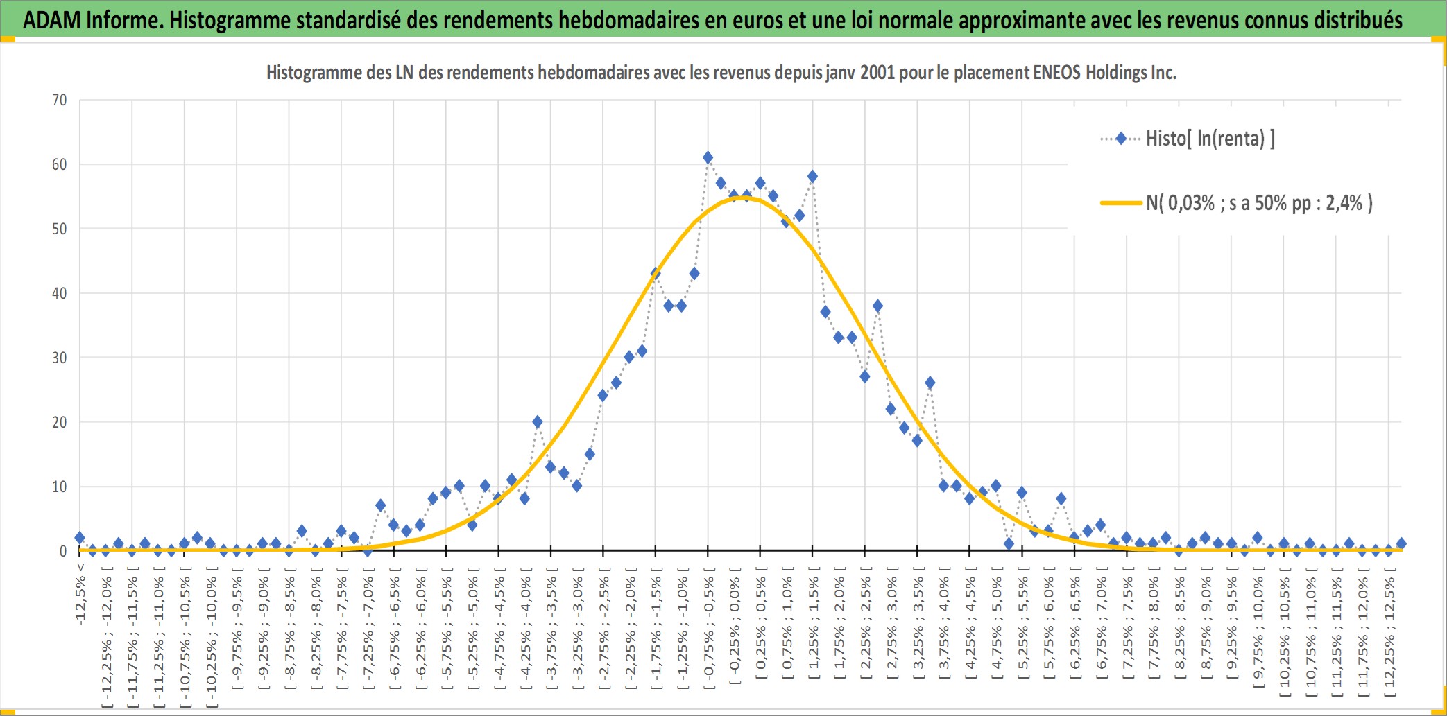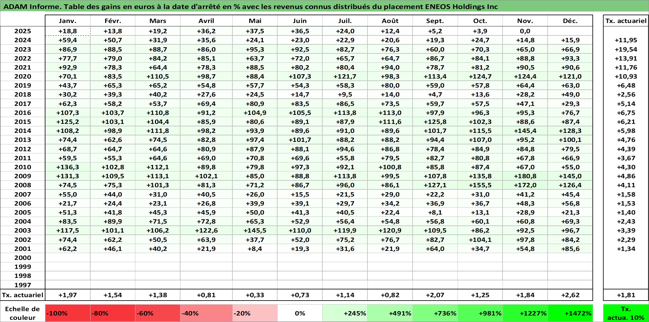 Site dédié aux investisseursPage dédiée sur site financeAnalyse des valorisations hebdomadaires de l'action ENEOS Holdings Inc. Cet actif est cote en JPY. Les valorisations sont en contrevaleur EURO et couvrent les semaines 2001W01 a 2025W48. Les revenus de cet actif financier sont pris en compte depuis la semaine 2010W39. La note globale ESG de cet actif est estimee a 5.0 (apres rebasage entre 0 et 20).
