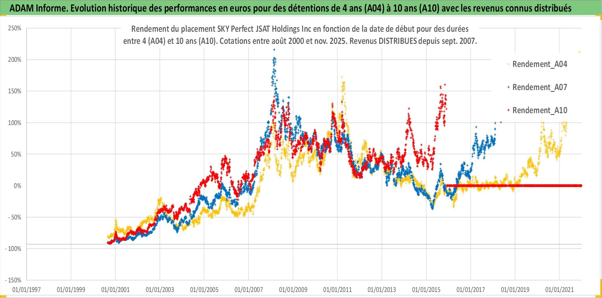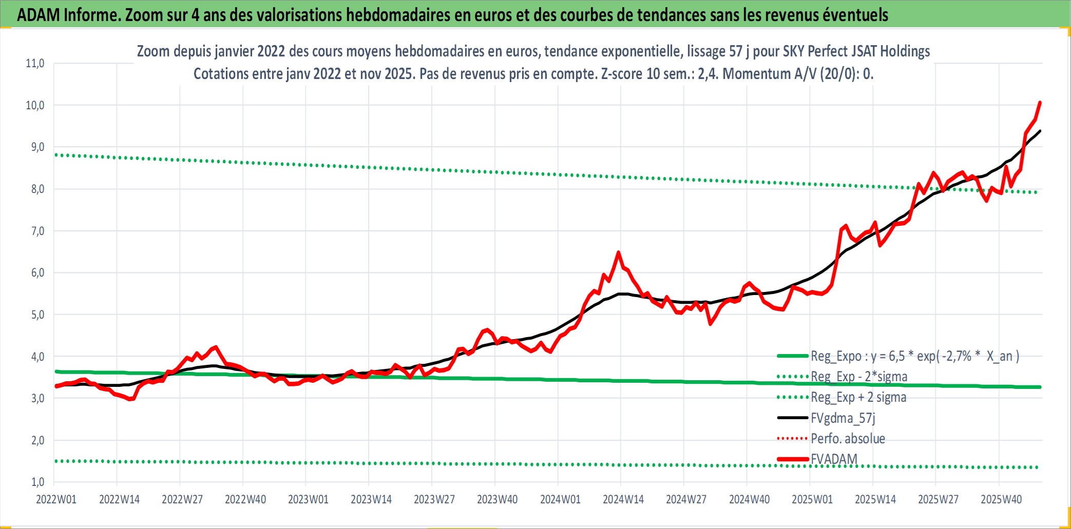 Site dédié aux investisseursPage dédiée sur site financeAnalyse des valorisations hebdomadaires de l'action SKY Perfect JSAT Holdings Inc. Cet actif est cote en JPY. Les valorisations sont en contrevaleur EURO et couvrent les semaines 2000W33 a 2025W48. Les revenus de cet actif financier sont pris en compte depuis la semaine 2007W39. La note ESG de cet actif n'est pas connue.