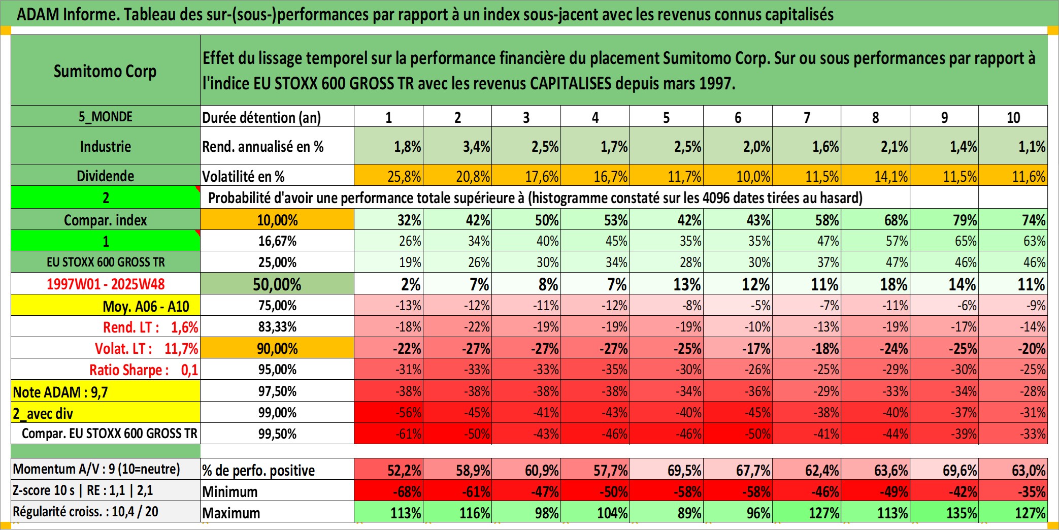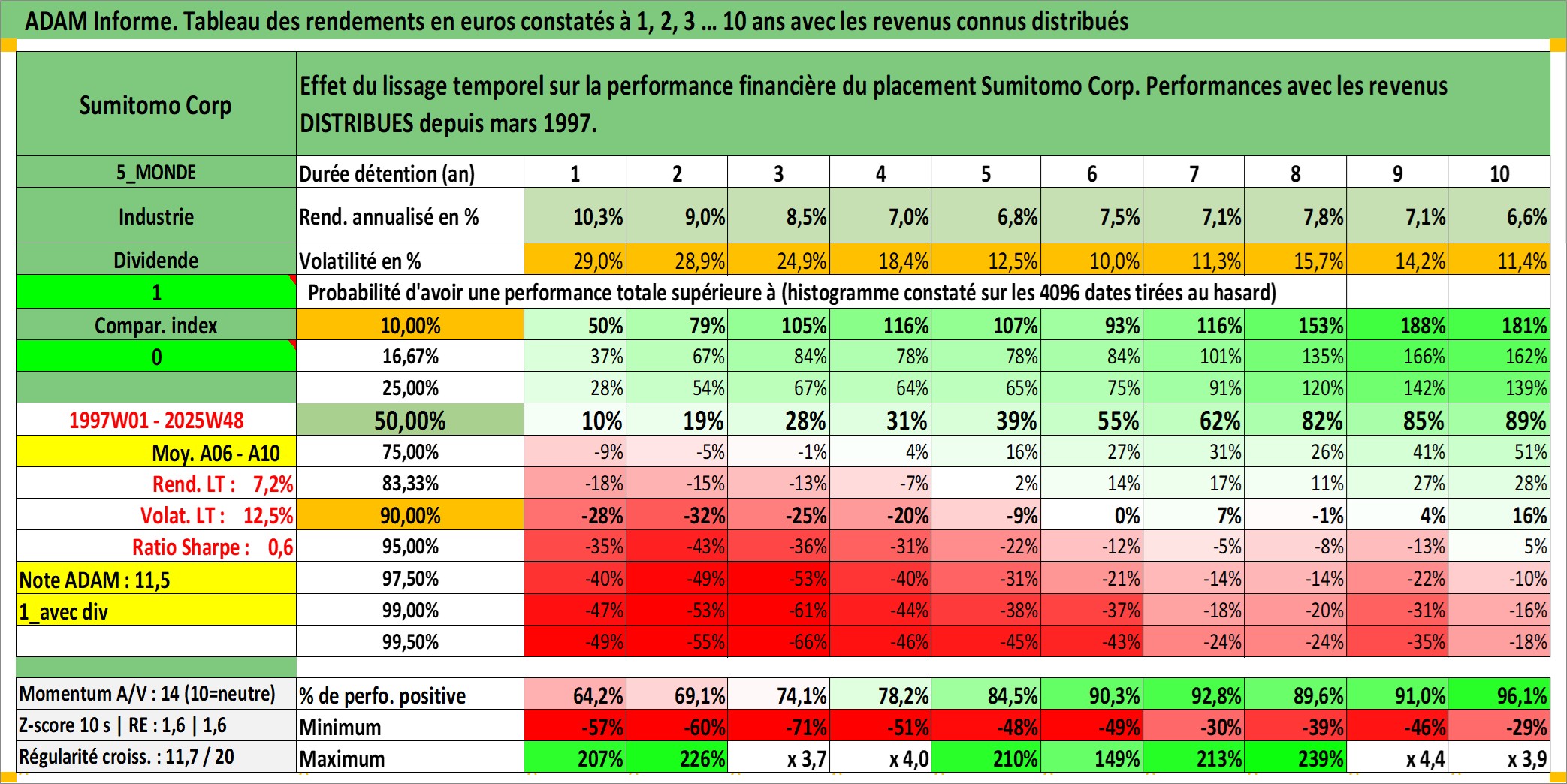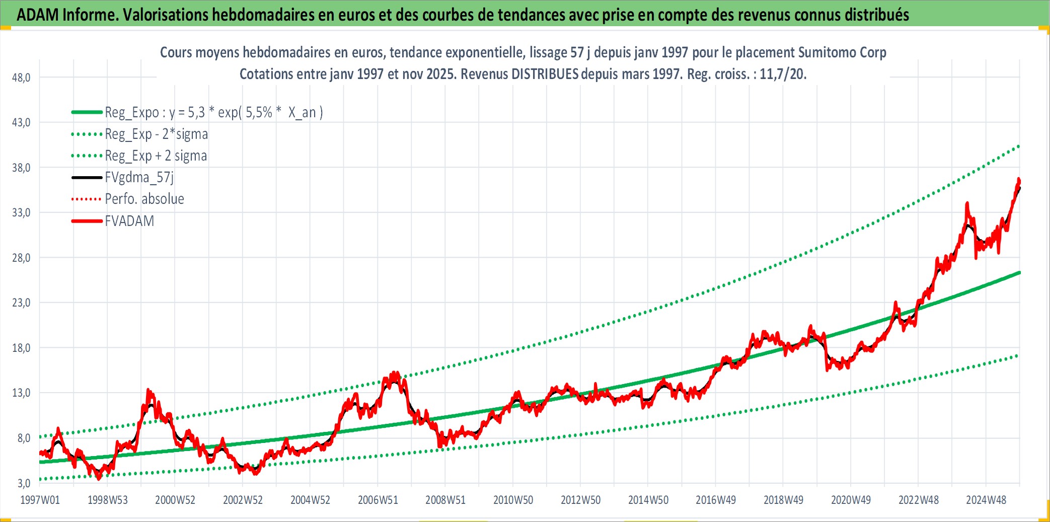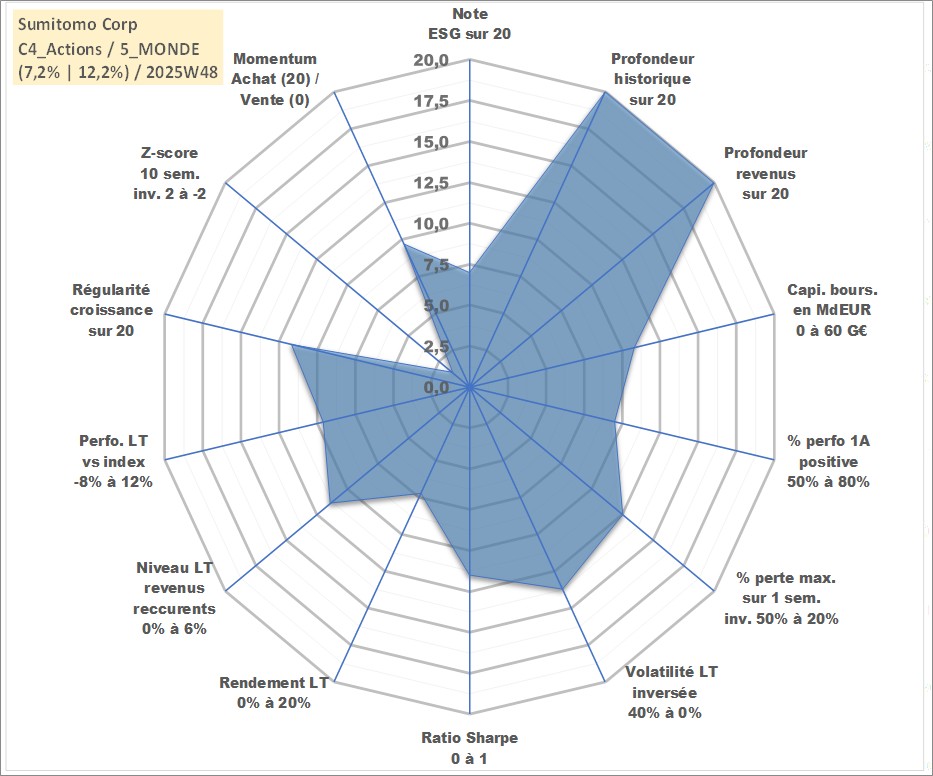 Site dédié aux investisseursPage dédiée sur site financeAnalyse des valorisations hebdomadaires de l'action Sumitomo Corp. Cet actif est cote en JPY. Les valorisations sont en contrevaleur EURO et couvrent les semaines 1997W01 a 2025W48. Les revenus de cet actif financier sont pris en compte depuis la semaine 1997W13. La note globale ESG de cet actif est estimee a 7.0 (apres rebasage entre 0 et 20).