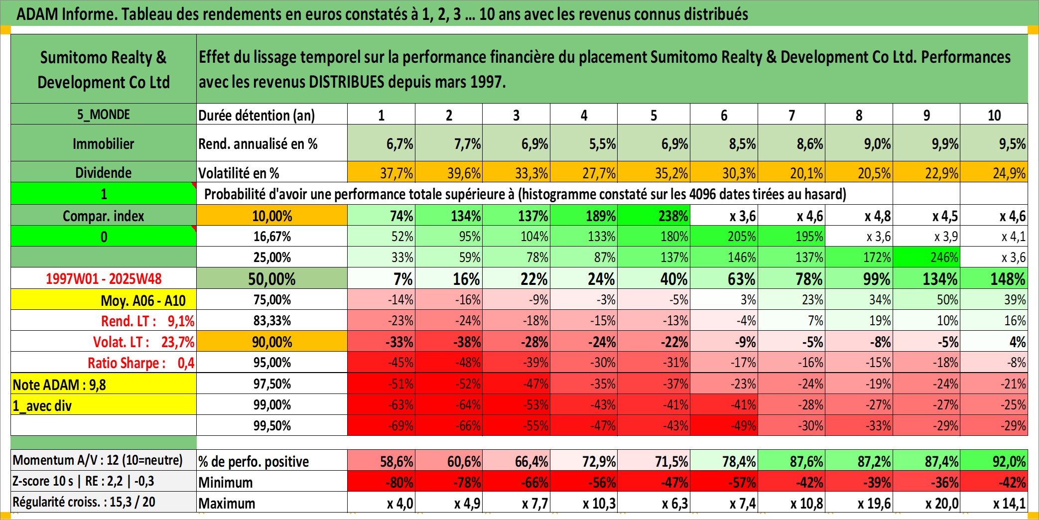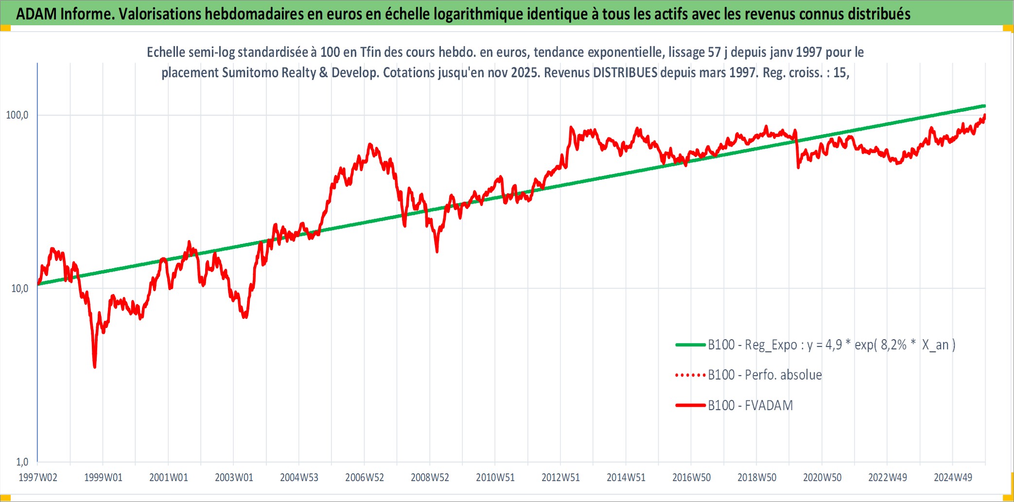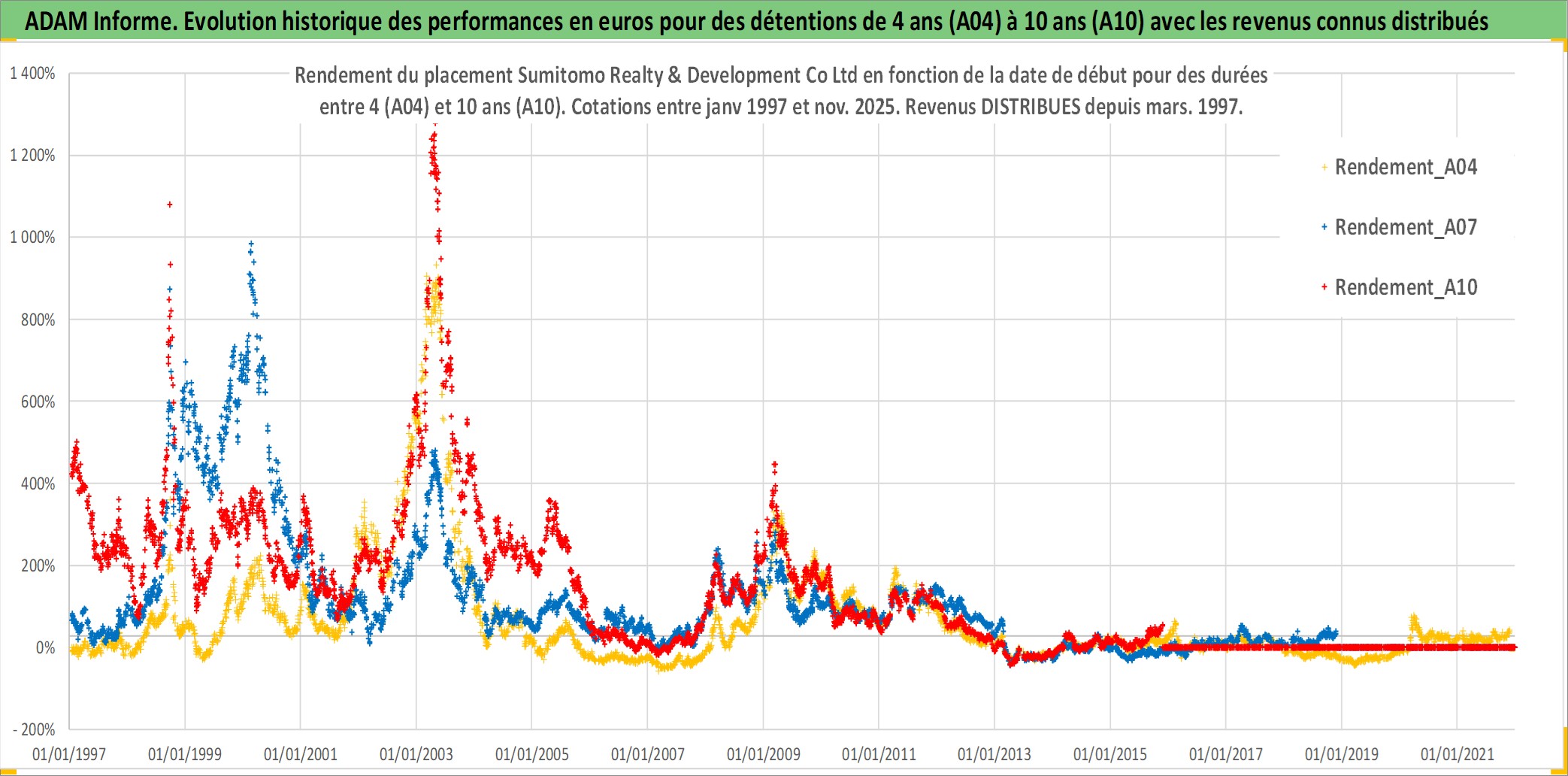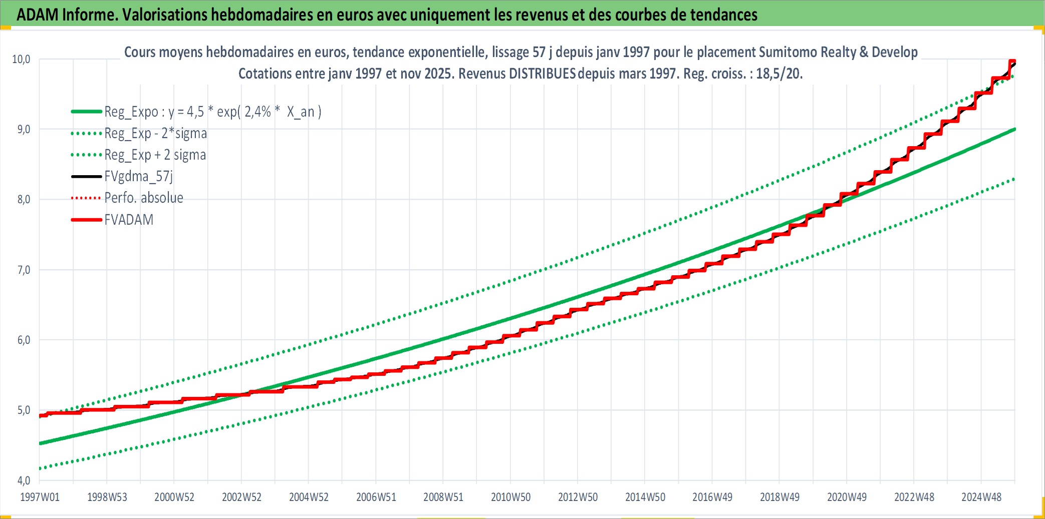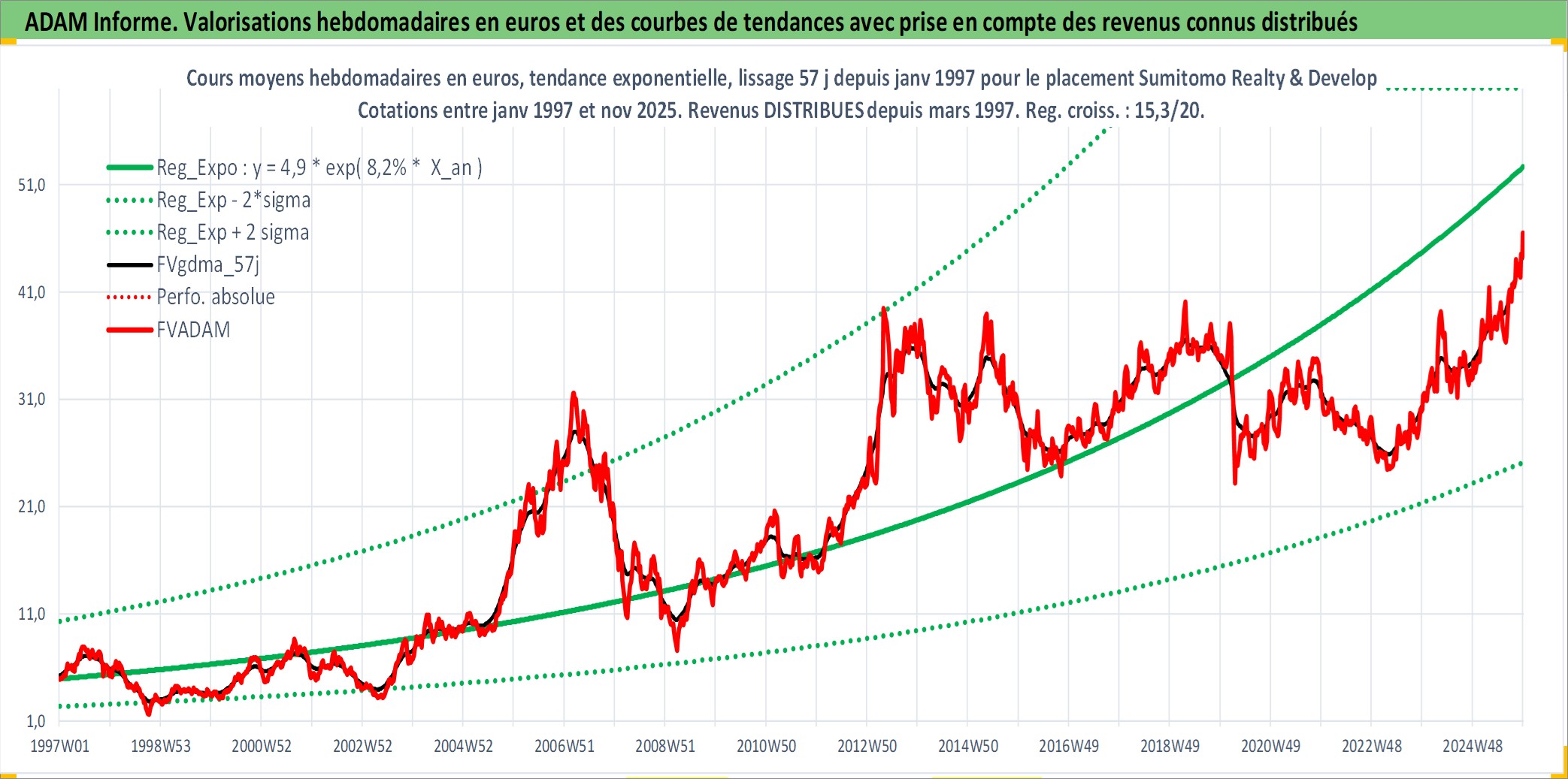 Site dédié aux investisseursPage dédiée sur site financeAnalyse des valorisations hebdomadaires de l'action Sumitomo Realty & Development Co Ltd. Cet actif est cote en JPY. Les valorisations sont en contrevaleur EURO et couvrent les semaines 1997W01 a 2025W48. Les revenus de cet actif financier sont pris en compte depuis la semaine 1997W13. La note globale ESG de cet actif est estimee a 8.0 (apres rebasage entre 0 et 20).