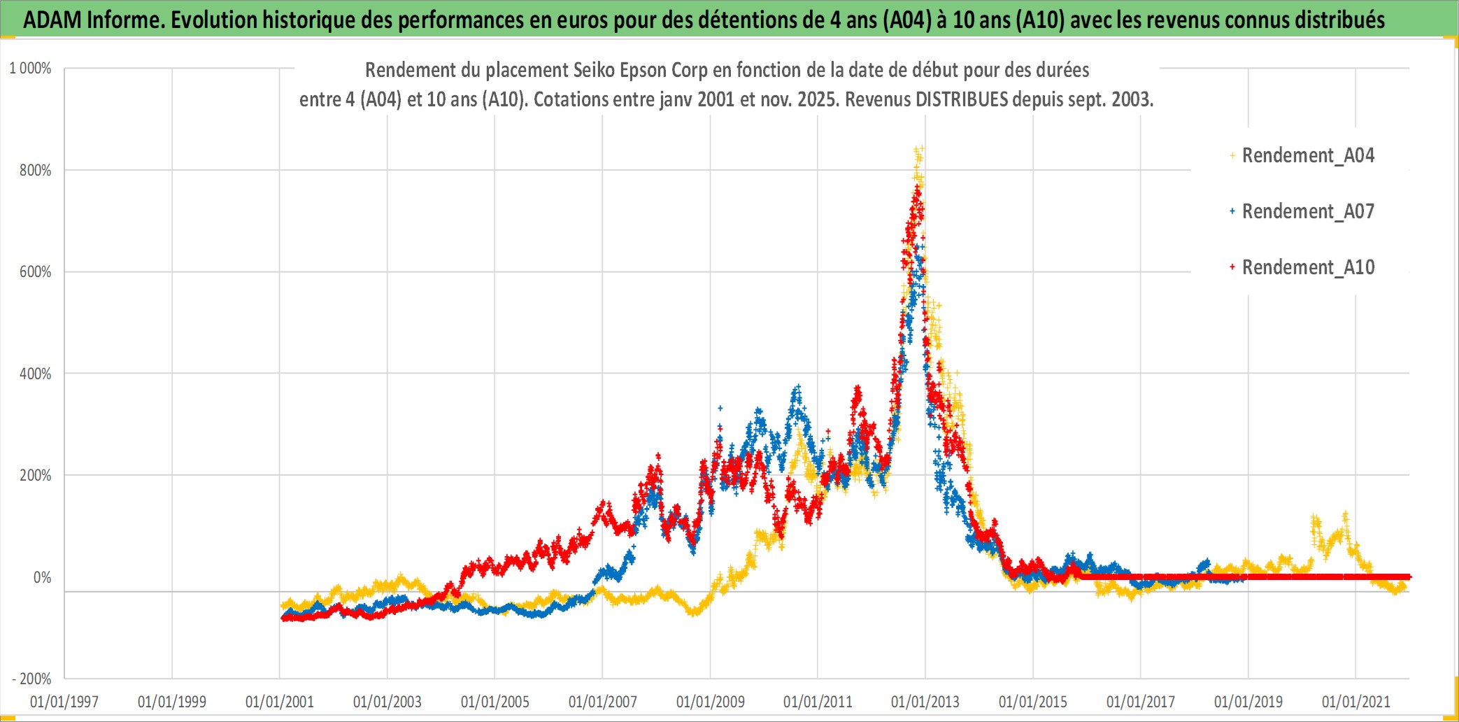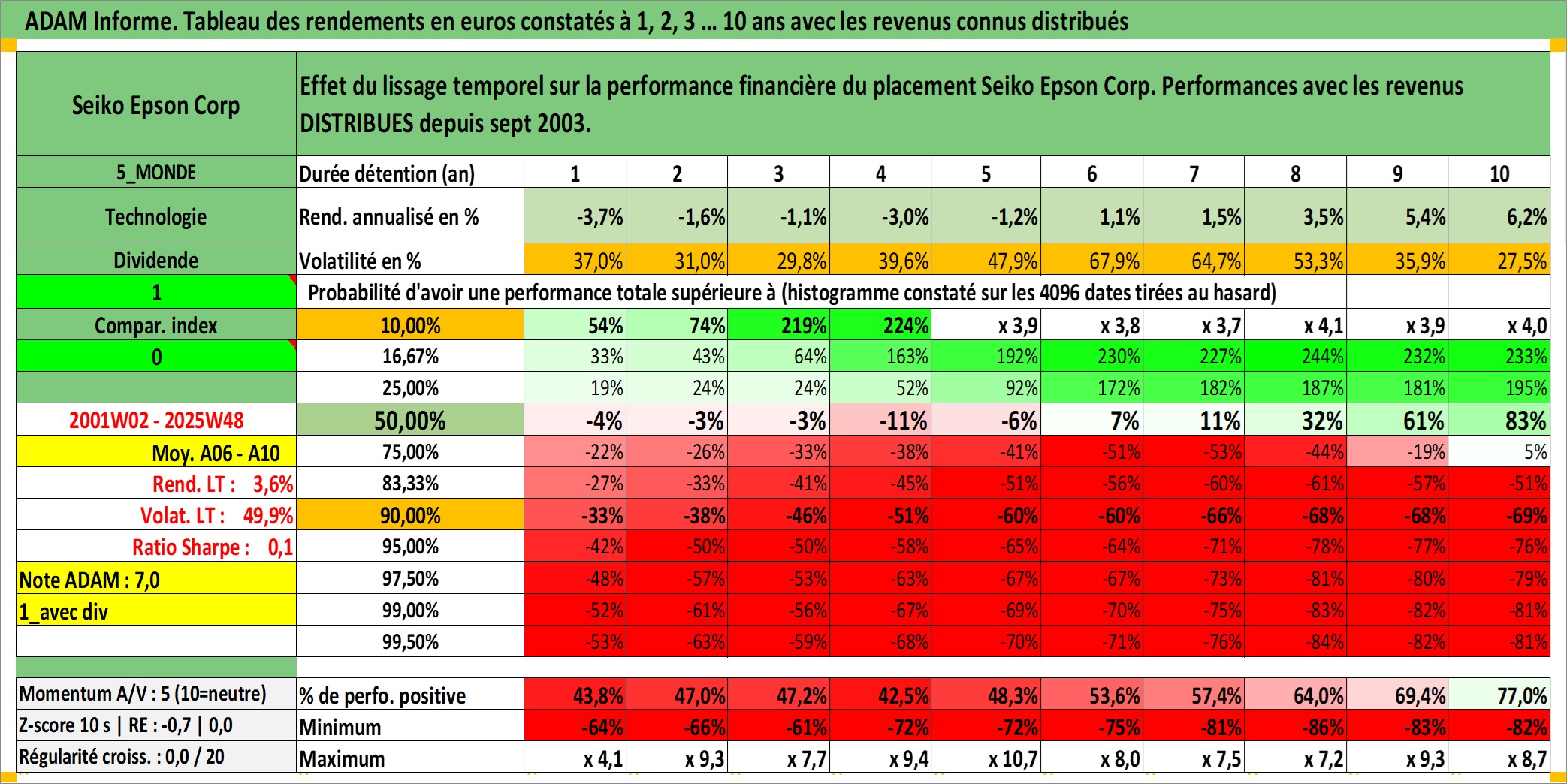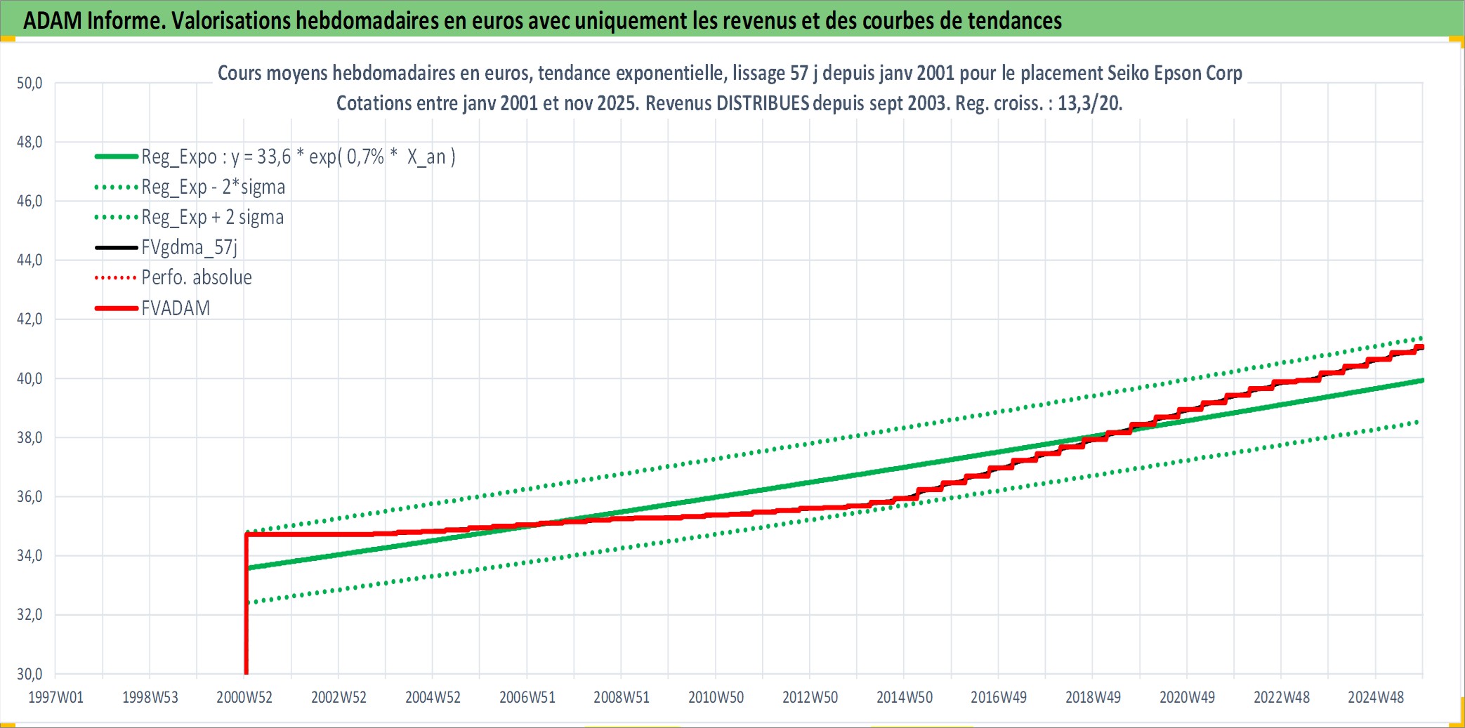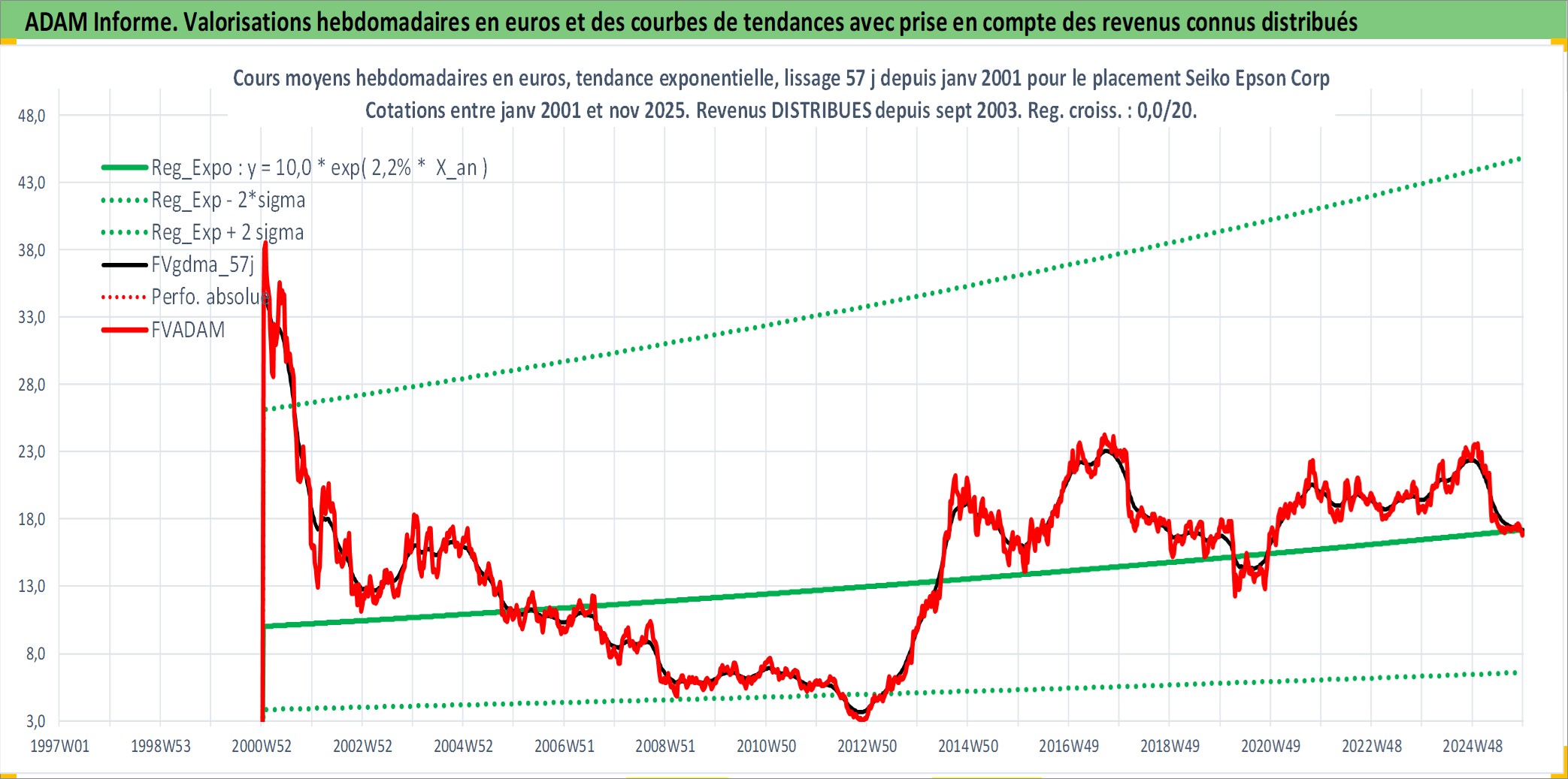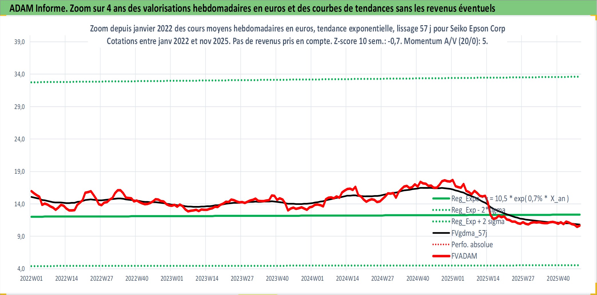 Site dédié aux investisseursPage dédiée sur site financeAnalyse des valorisations hebdomadaires de l'action Seiko Epson Corp. Cet actif est cote en JPY. Les valorisations sont en contrevaleur EURO et couvrent les semaines 2001W02 a 2025W48. Les revenus de cet actif financier sont pris en compte depuis la semaine 2003W39. La note globale ESG de cet actif est estimee a 14.0 (apres rebasage entre 0 et 20).