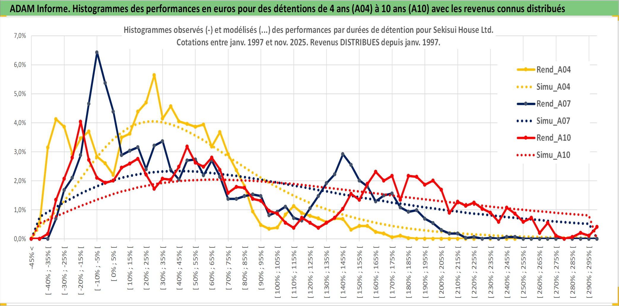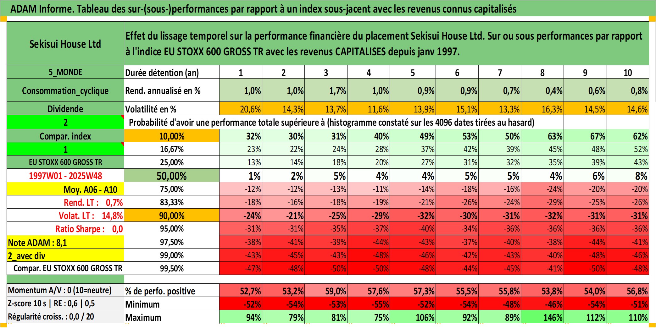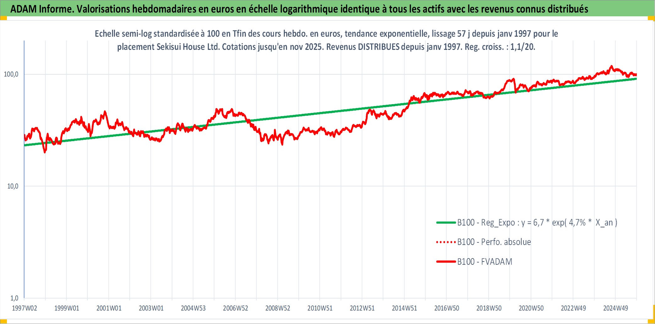 Site dédié aux investisseursPage dédiée sur site financeAnalyse des valorisations hebdomadaires de l'action Sekisui House Ltd. Cet actif est cote en JPY. Les valorisations sont en contrevaleur EURO et couvrent les semaines 1997W01 a 2025W48. Les revenus de cet actif financier sont pris en compte depuis la semaine 1997W05. La note globale ESG de cet actif est estimee a 13.0 (apres rebasage entre 0 et 20).
