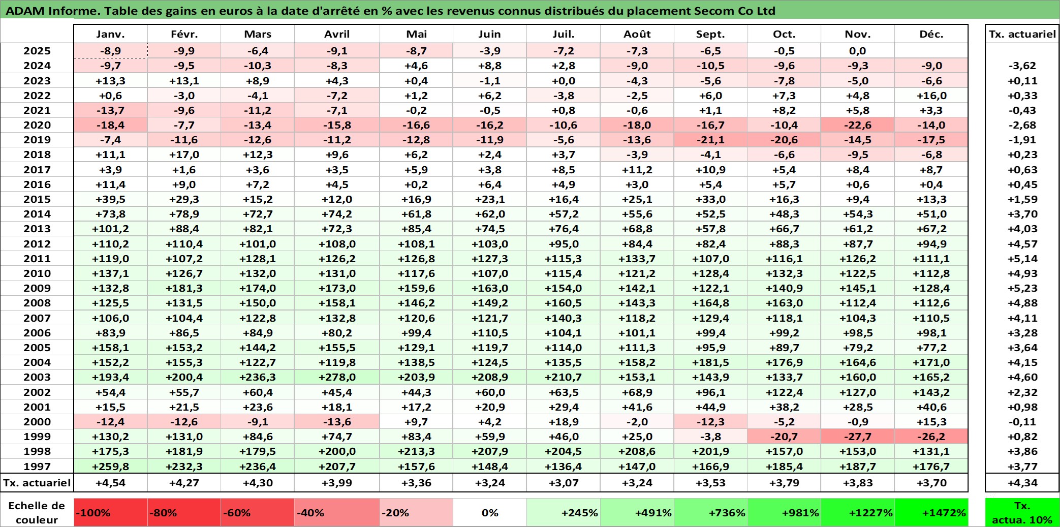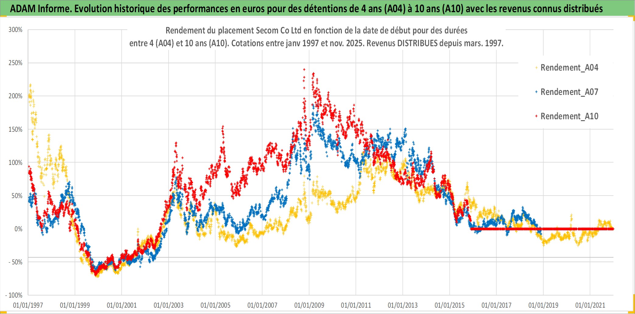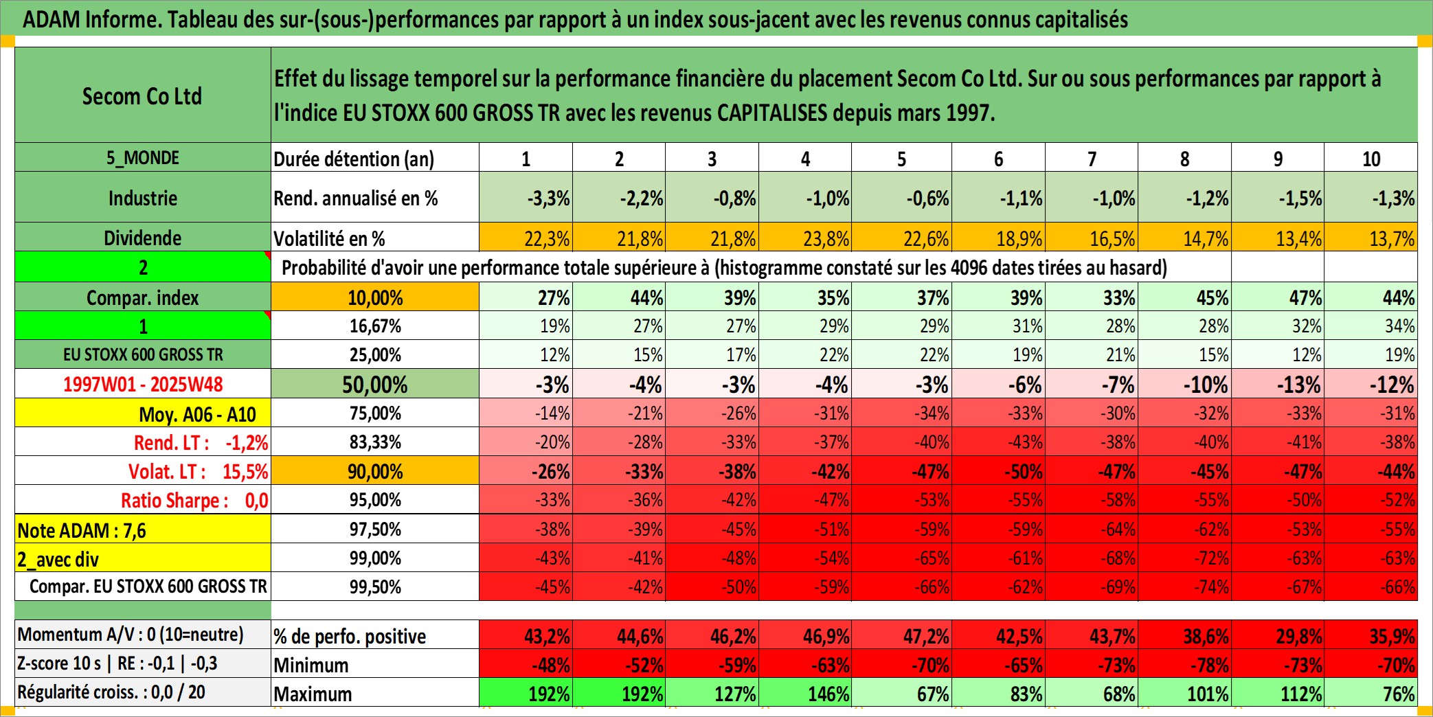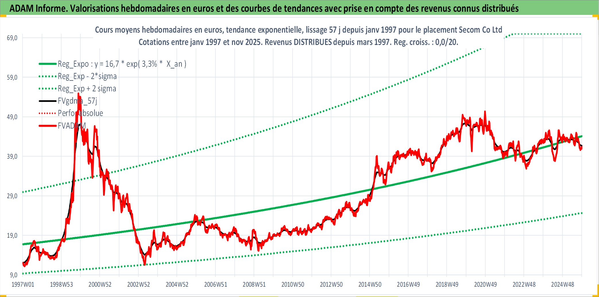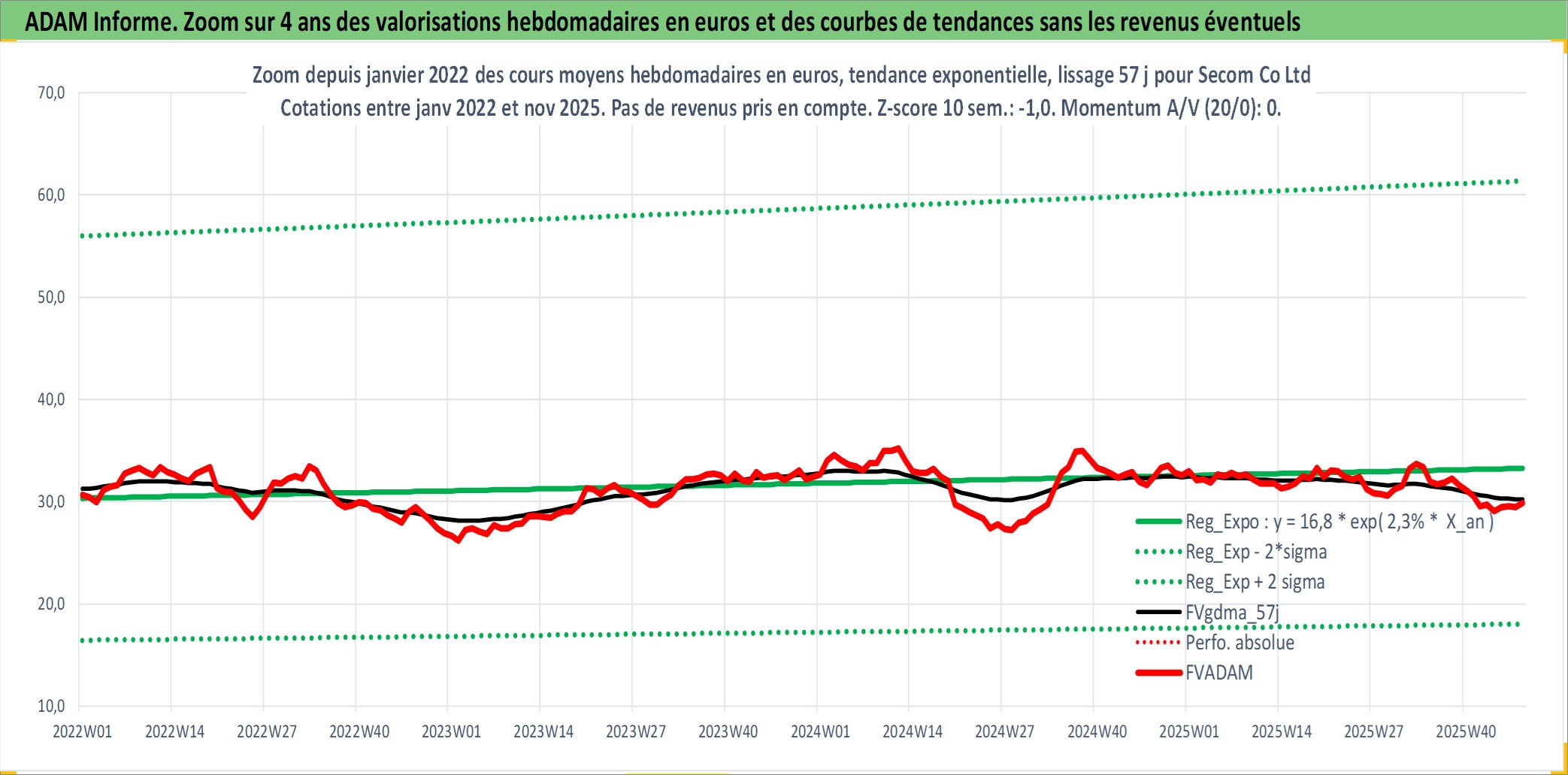 Site dédié aux investisseursPage dédiée sur site financeAnalyse des valorisations hebdomadaires de l'action Secom Co Ltd. Cet actif est cote en JPY. Les valorisations sont en contrevaleur EURO et couvrent les semaines 1997W01 a 2025W48. Les revenus de cet actif financier sont pris en compte depuis la semaine 1997W13. La note globale ESG de cet actif est estimee a 11.0 (apres rebasage entre 0 et 20).