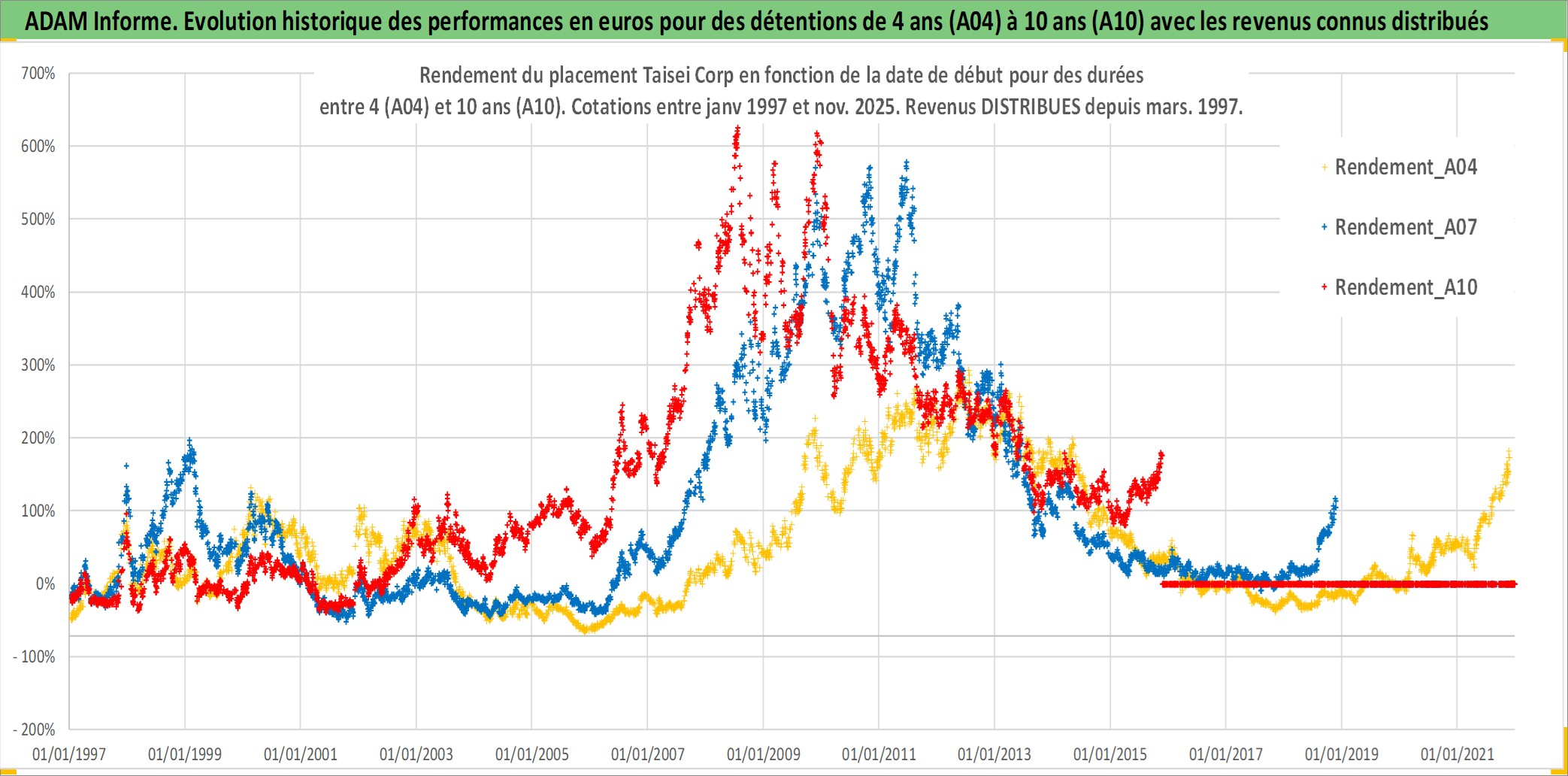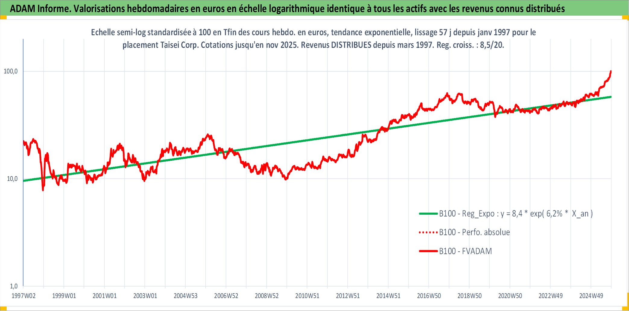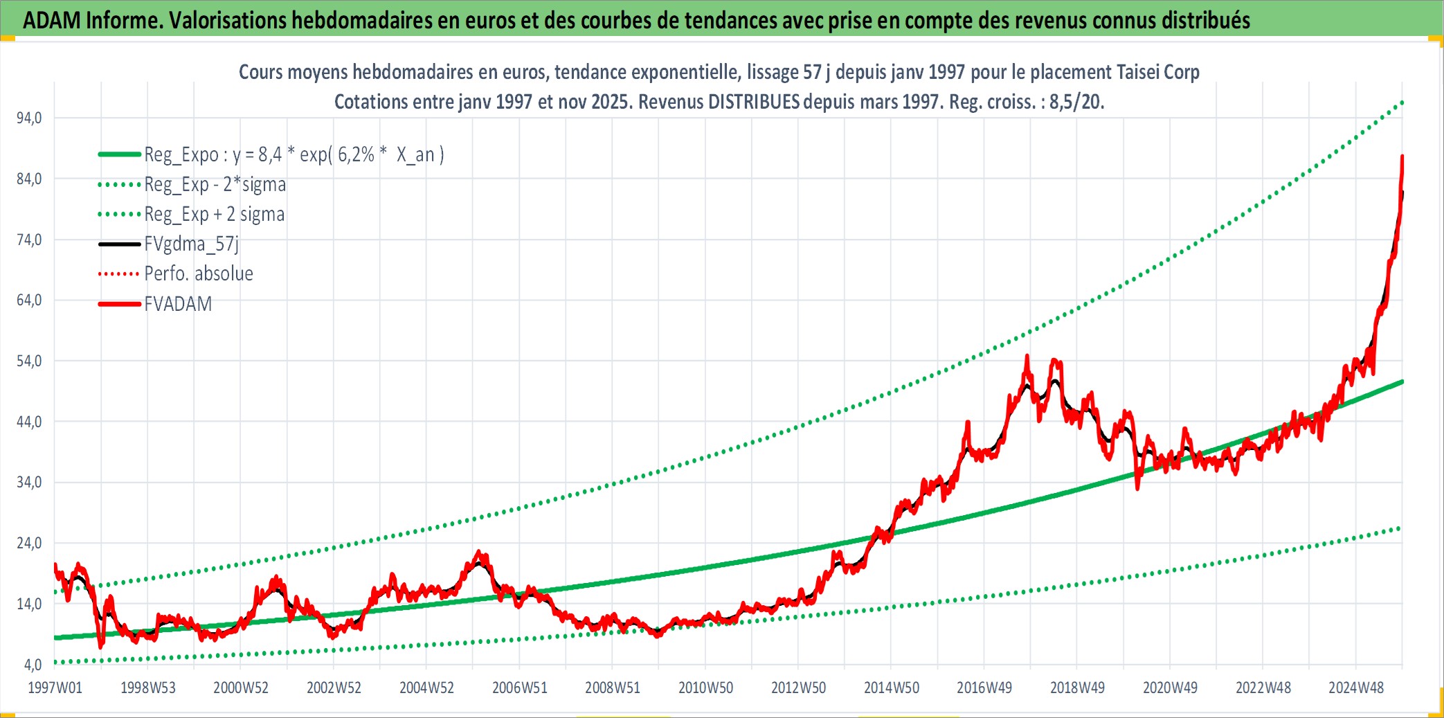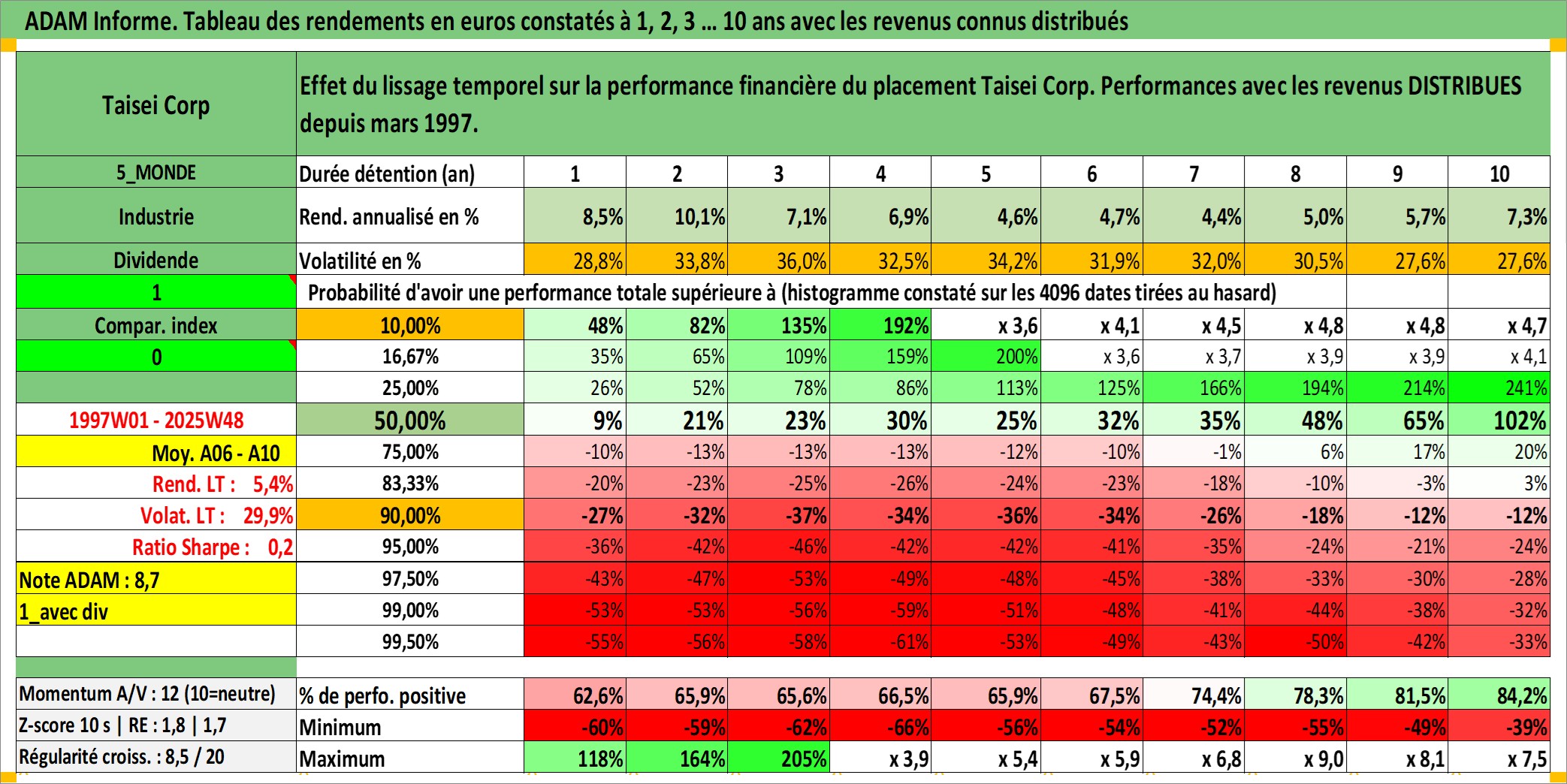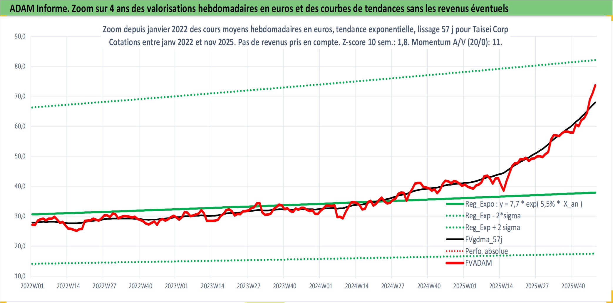 Site dédié aux investisseursPage dédiée sur site financeAnalyse des valorisations hebdomadaires de l'action Taisei Corp. Cet actif est cote en JPY. Les valorisations sont en contrevaleur EURO et couvrent les semaines 1997W01 a 2025W48. Les revenus de cet actif financier sont pris en compte depuis la semaine 1997W13. La note globale ESG de cet actif est estimee a 6.0 (apres rebasage entre 0 et 20).