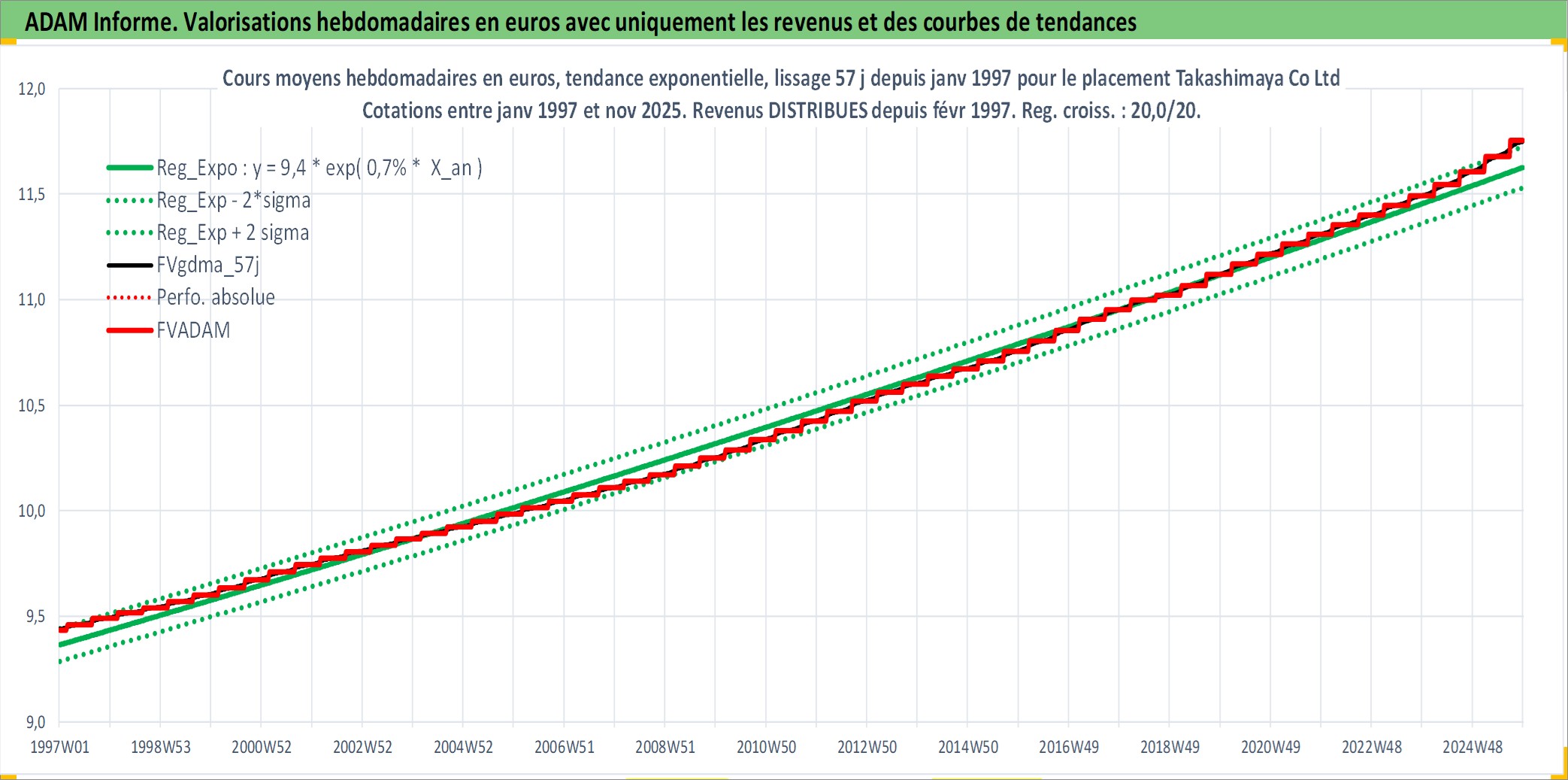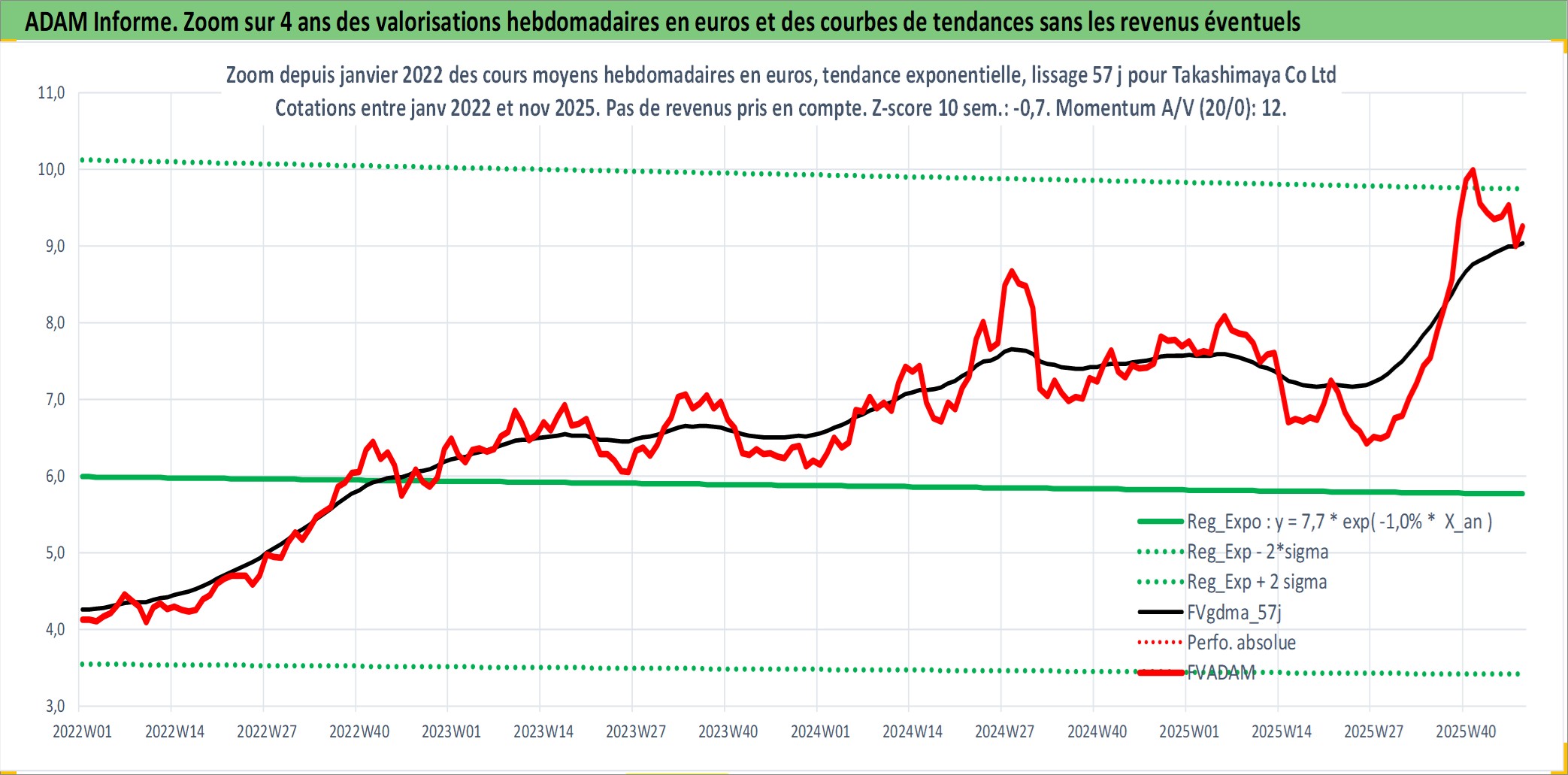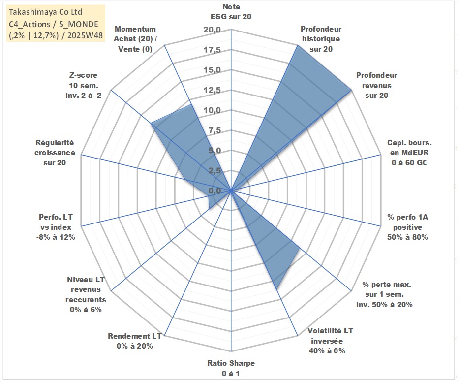 Site dédié aux investisseursPage dédiée sur site financeAnalyse des valorisations hebdomadaires de l'action Takashimaya Co Ltd. Cet actif est cote en JPY. Les valorisations sont en contrevaleur EURO et couvrent les semaines 1997W01 a 2025W48. Les revenus de cet actif financier sont pris en compte depuis la semaine 1997W09. La note ESG de cet actif n'est pas connue.