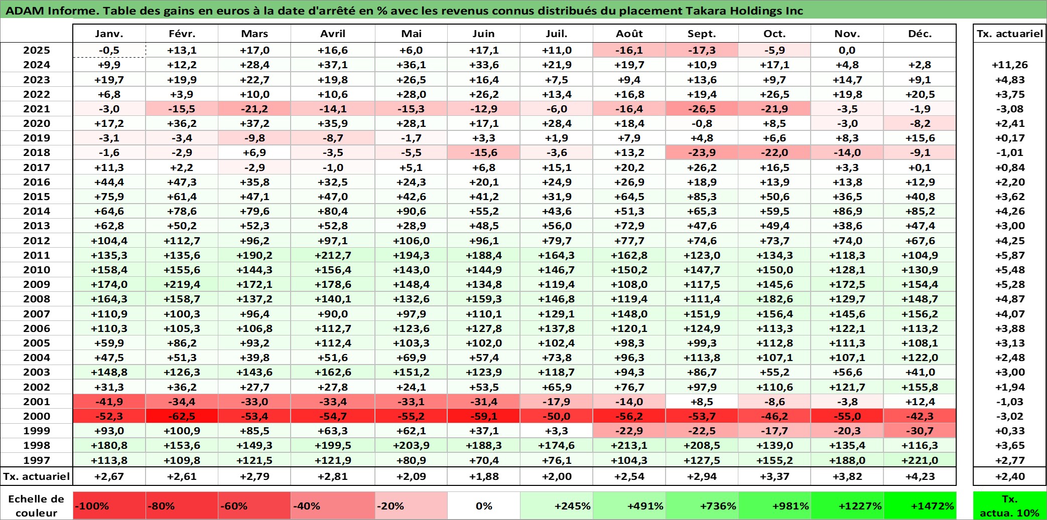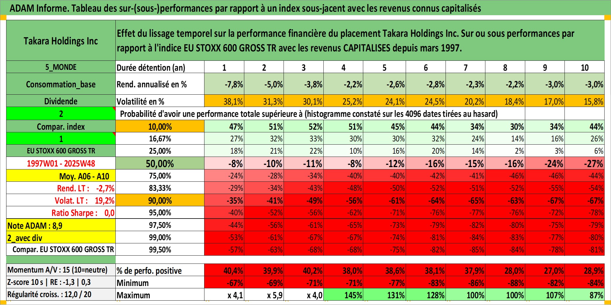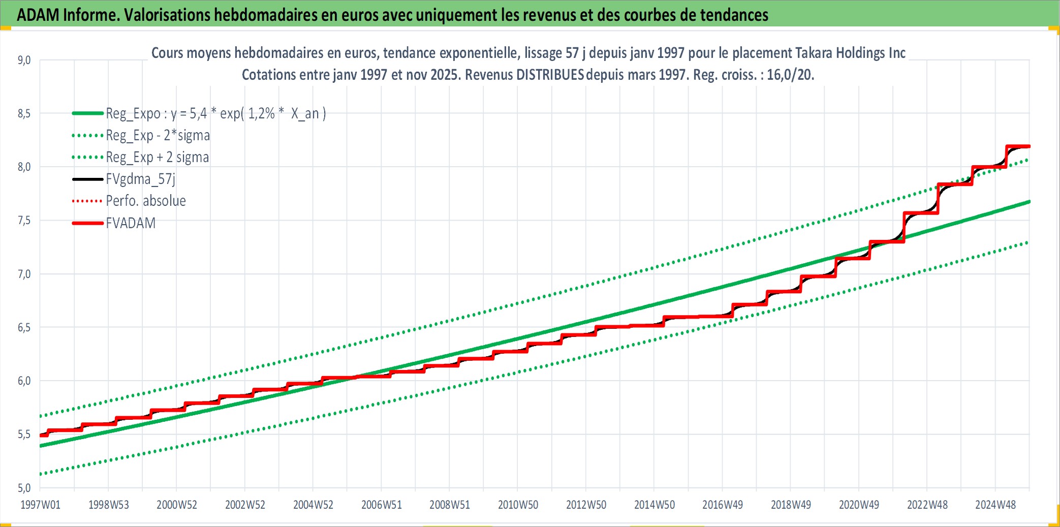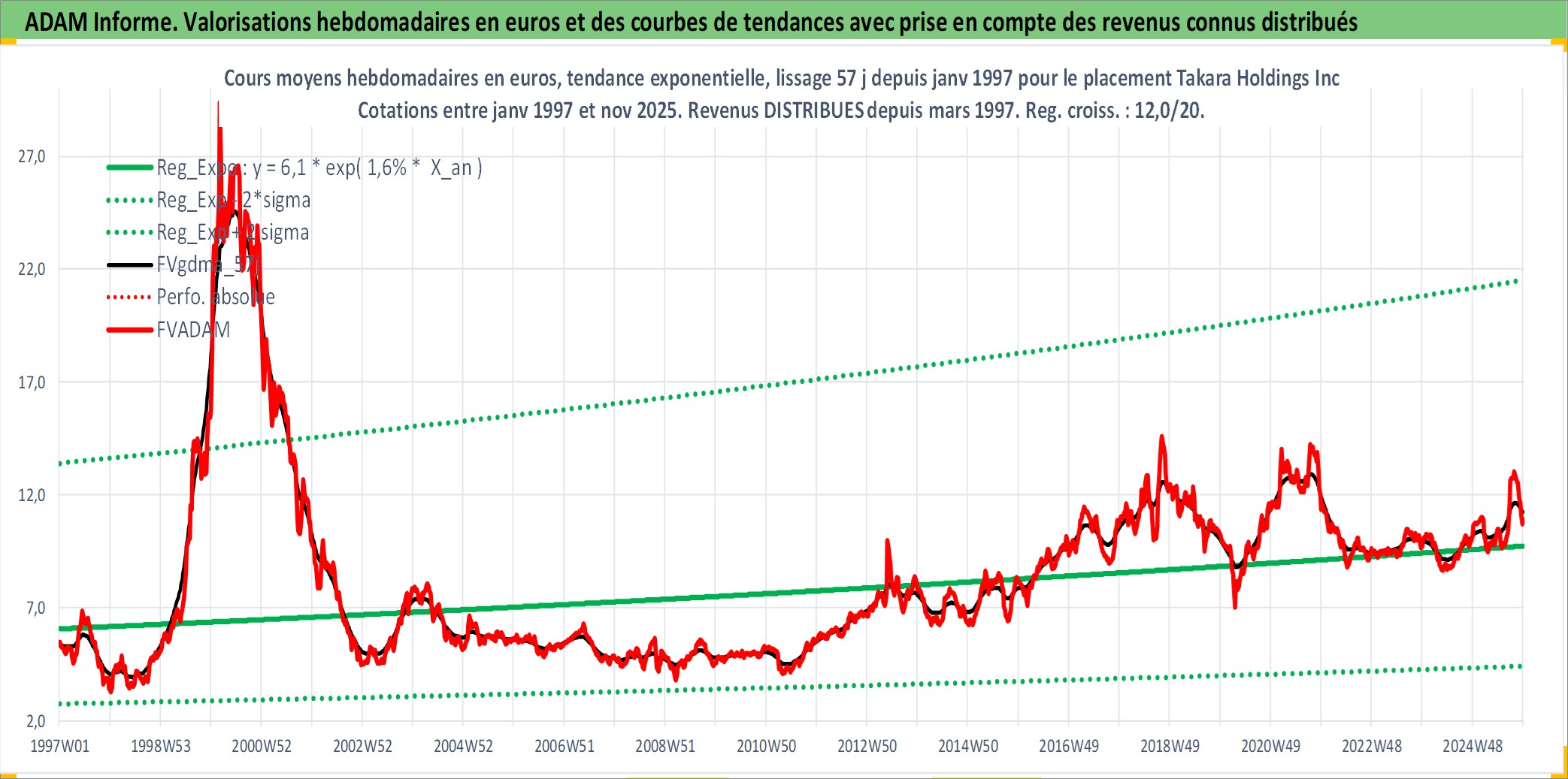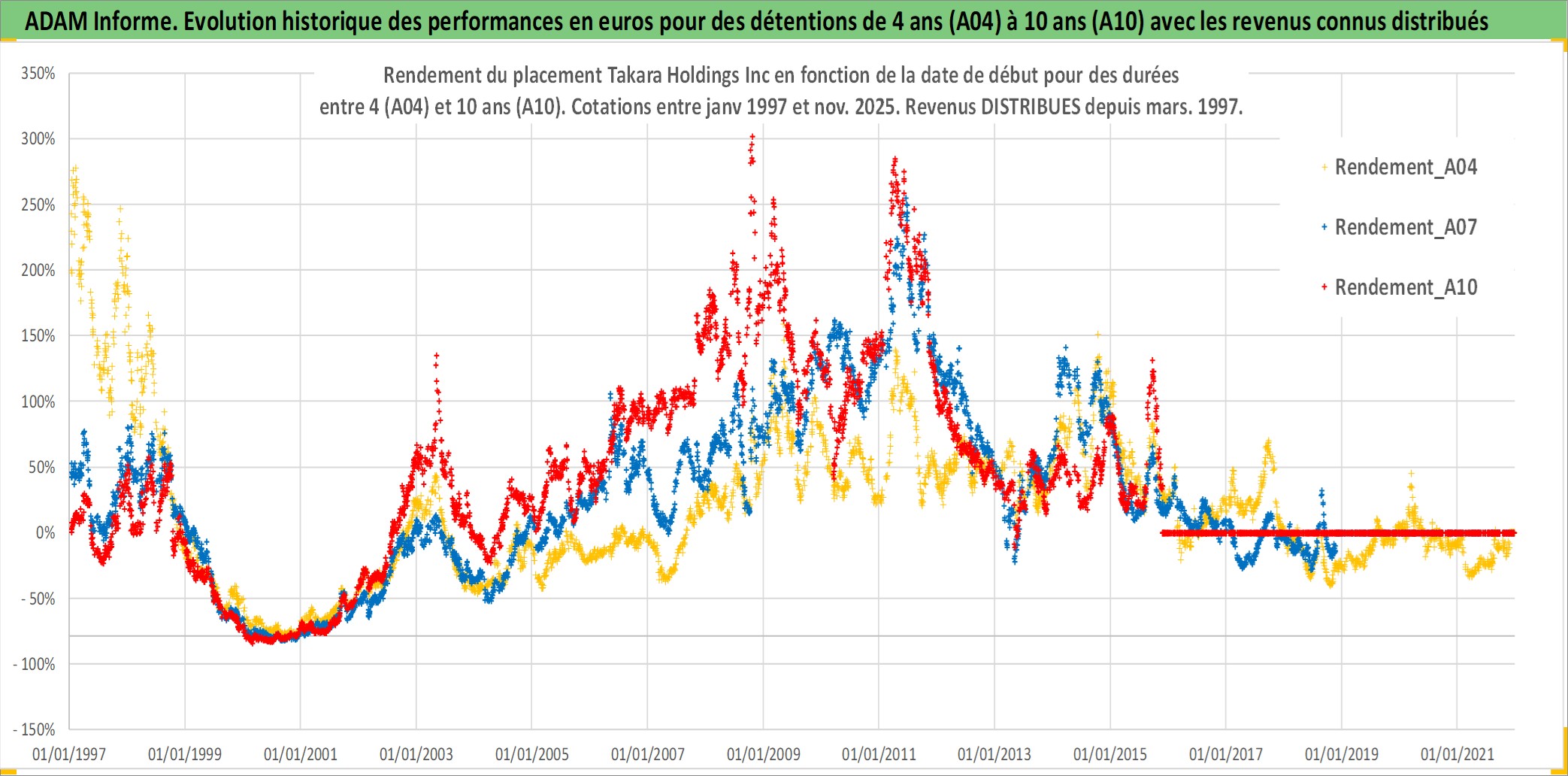 Site dédié aux investisseursPage dédiée sur site financeAnalyse des valorisations hebdomadaires de l'action Takara Holdings Inc. Cet actif est cote en JPY. Les valorisations sont en contrevaleur EURO et couvrent les semaines 1997W01 a 2025W48. Les revenus de cet actif financier sont pris en compte depuis la semaine 1997W13. La note ESG de cet actif n'est pas connue.