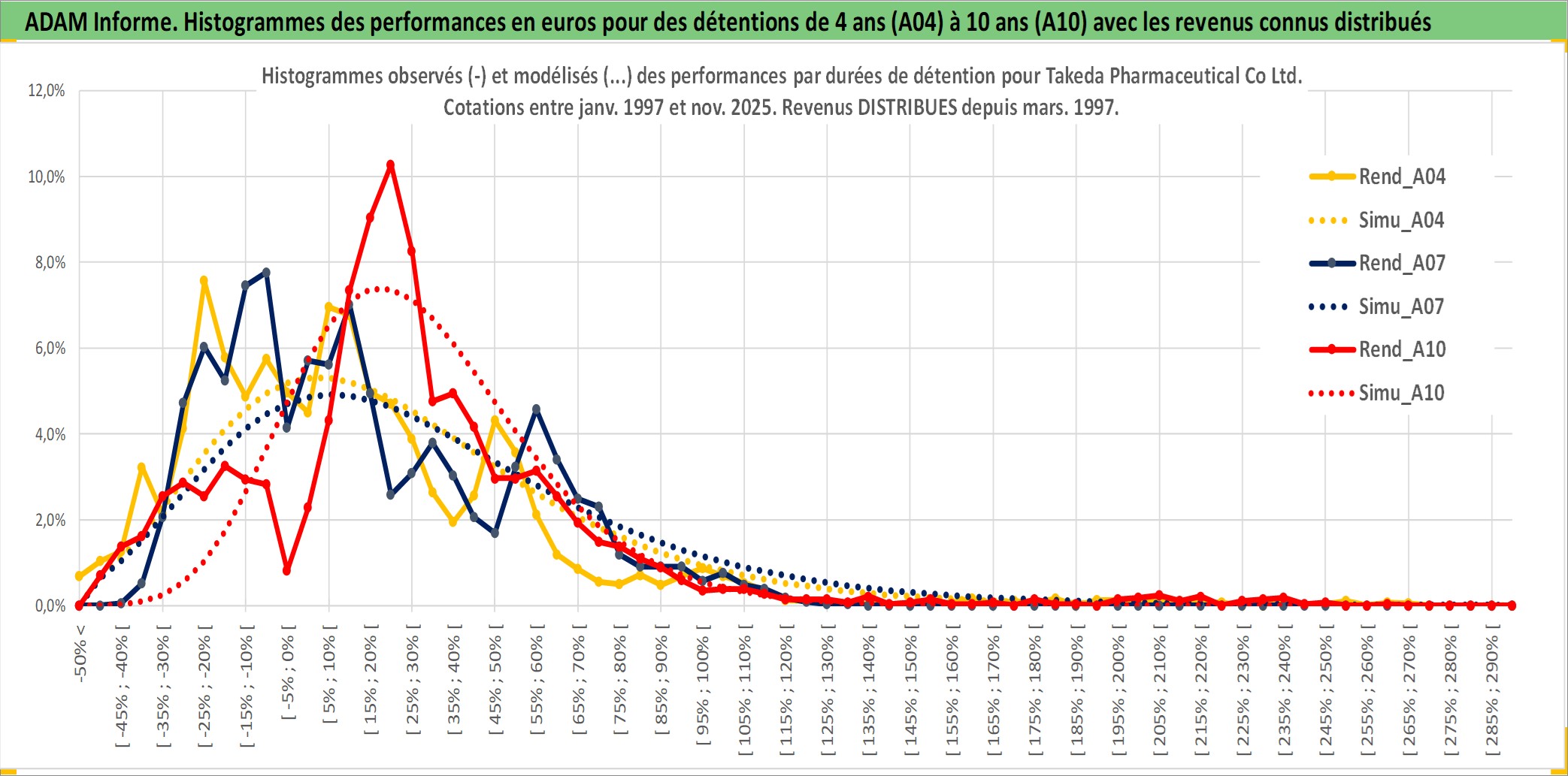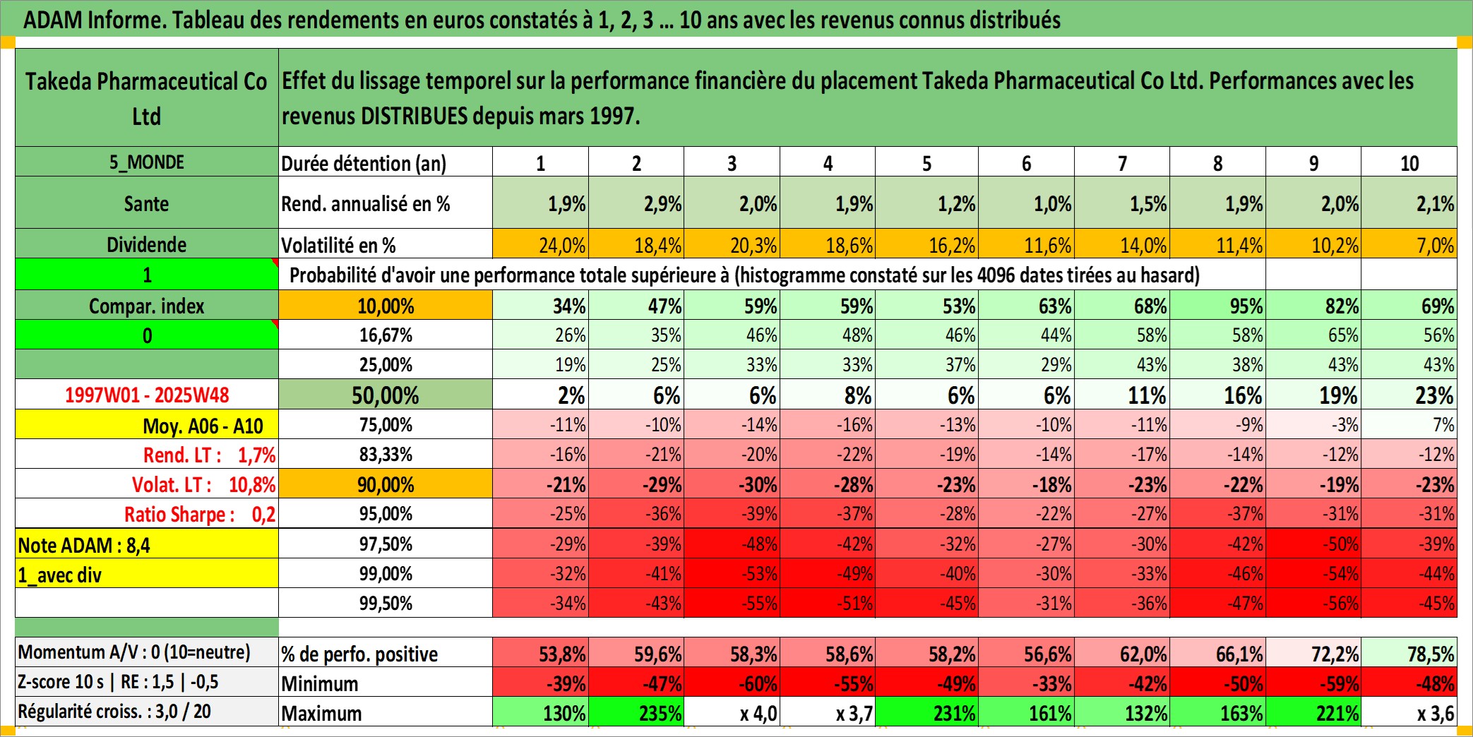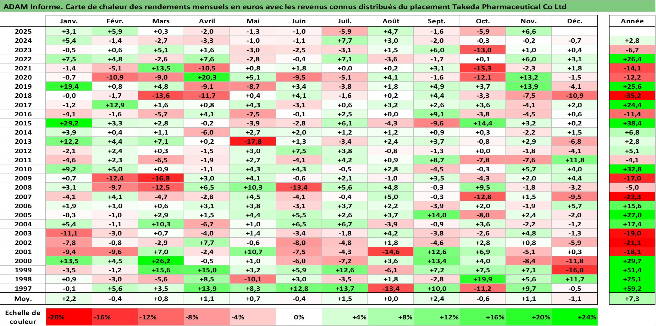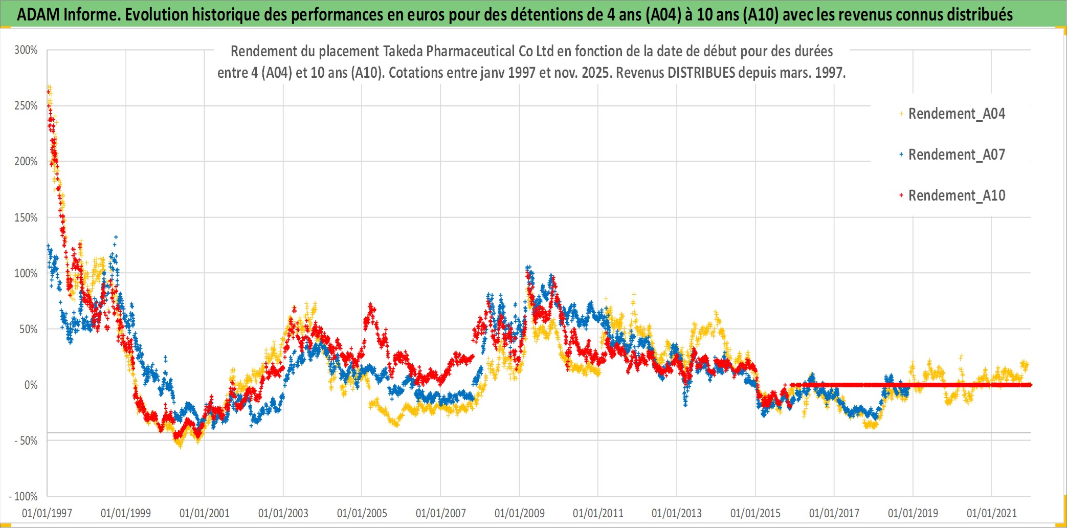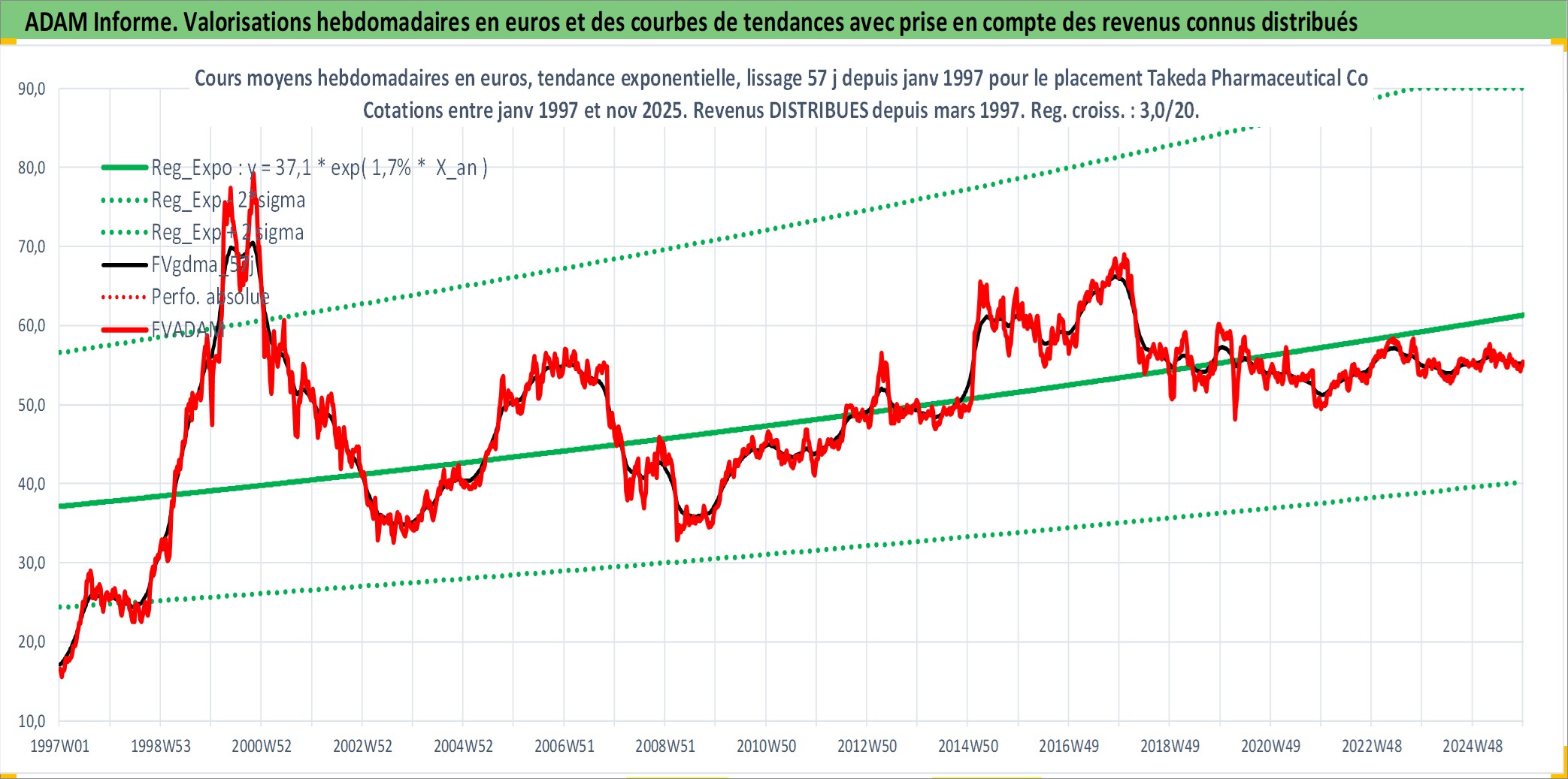 Site dédié aux investisseursPage dédiée sur site financeAnalyse des valorisations hebdomadaires de l'action Takeda Pharmaceutical Co Ltd. Cet actif est cote en JPY. Les valorisations sont en contrevaleur EURO et couvrent les semaines 1997W01 a 2025W48. Les revenus de cet actif financier sont pris en compte depuis la semaine 1997W13. La note globale ESG de cet actif est estimee a 7.0 (apres rebasage entre 0 et 20).