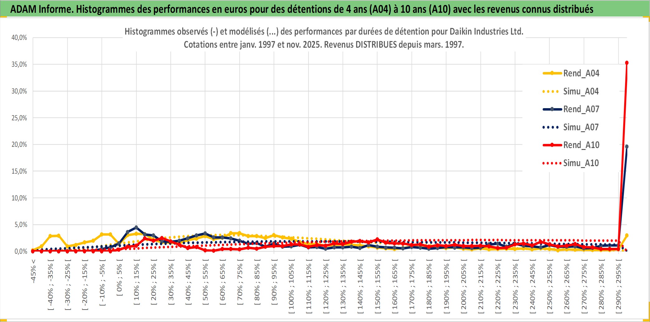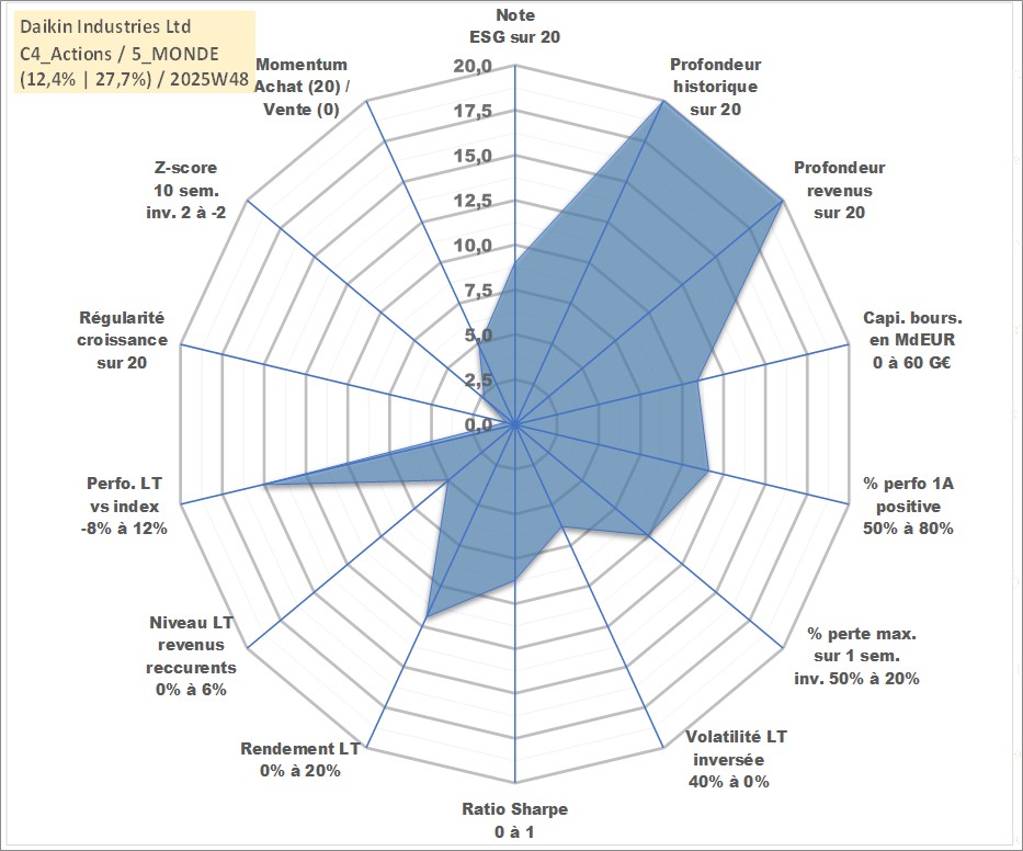 Site dédié aux investisseursPage dédiée sur site financeAnalyse des valorisations hebdomadaires de l'action Daikin Industries Ltd. Cet actif est cote en JPY. Les valorisations sont en contrevaleur EURO et couvrent les semaines 1997W01 a 2025W48. Les revenus de cet actif financier sont pris en compte depuis la semaine 1997W13. La note globale ESG de cet actif est estimee a 9.0 (apres rebasage entre 0 et 20).