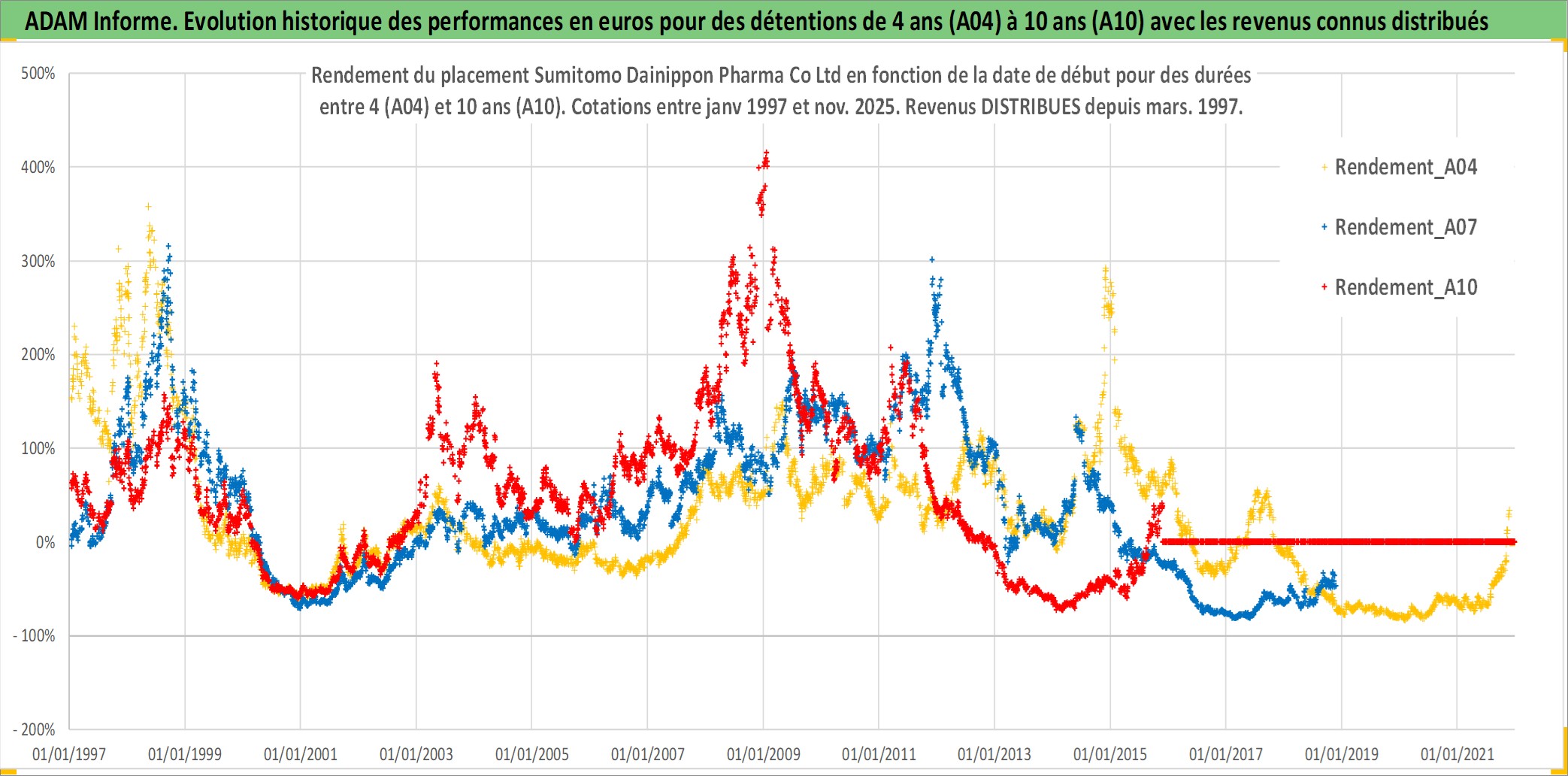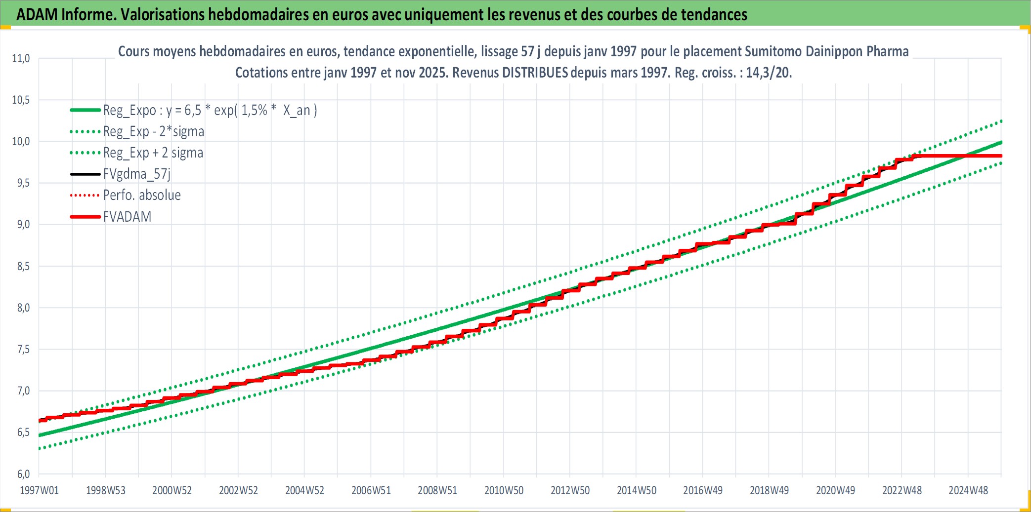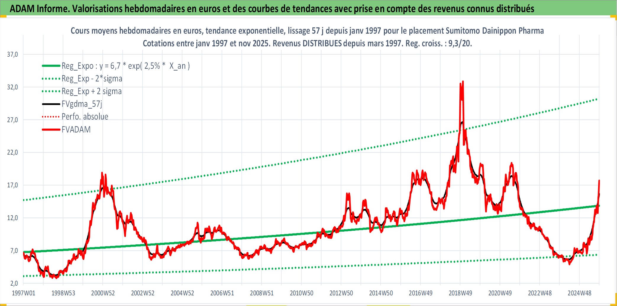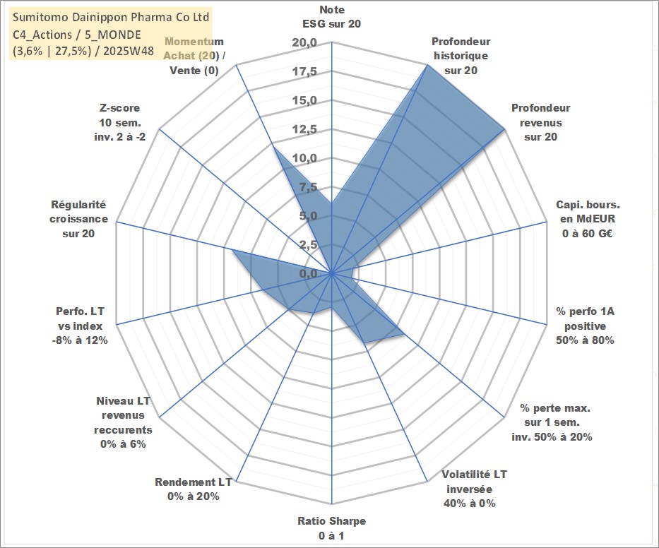 Site dédié aux investisseursPage dédiée sur site financeAnalyse des valorisations hebdomadaires de l'action Sumitomo Dainippon Pharma Co Ltd. Cet actif est cote en JPY. Les valorisations sont en contrevaleur EURO et couvrent les semaines 1997W01 a 2025W48. Les revenus de cet actif financier sont pris en compte depuis la semaine 1997W13. La note globale ESG de cet actif est estimee a 6.0 (apres rebasage entre 0 et 20).